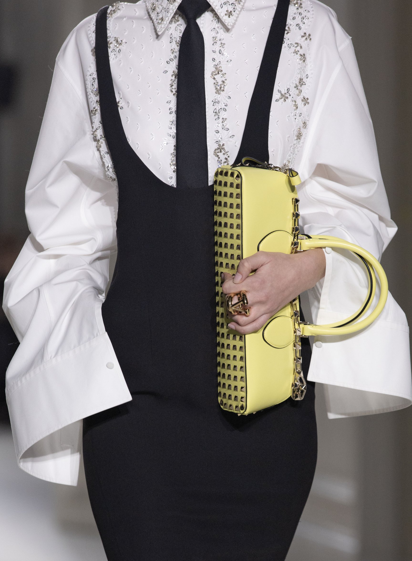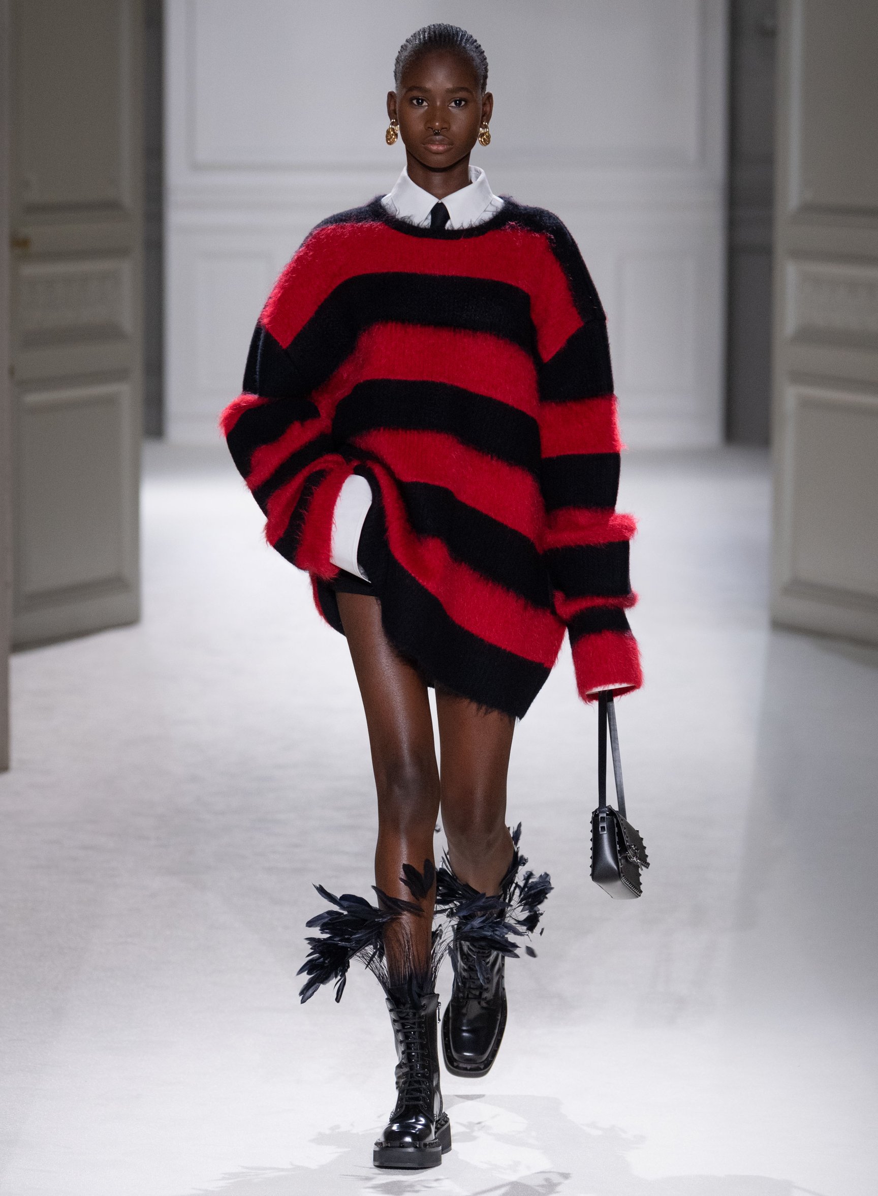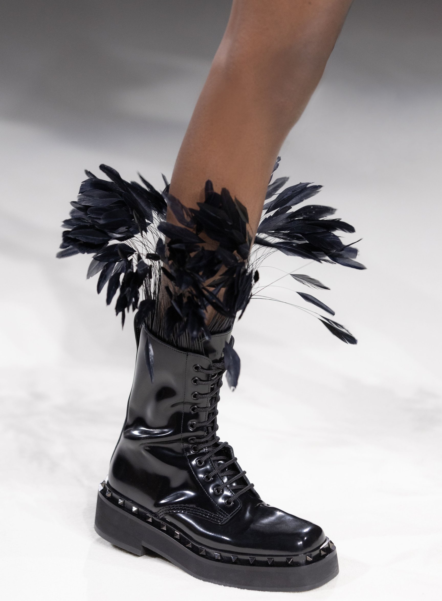 このほかにも個性豊かなモデルたちが登場し、パンクなムードを盛り上げる。足元にはスタッズ付きのアンクルブーツを履き、メゾンのアイコンである「ロックスタッズ」のバッグを手にしていた。ピッチョーリはこれを"ルネサンス ハ?ンク"と呼ぶ。