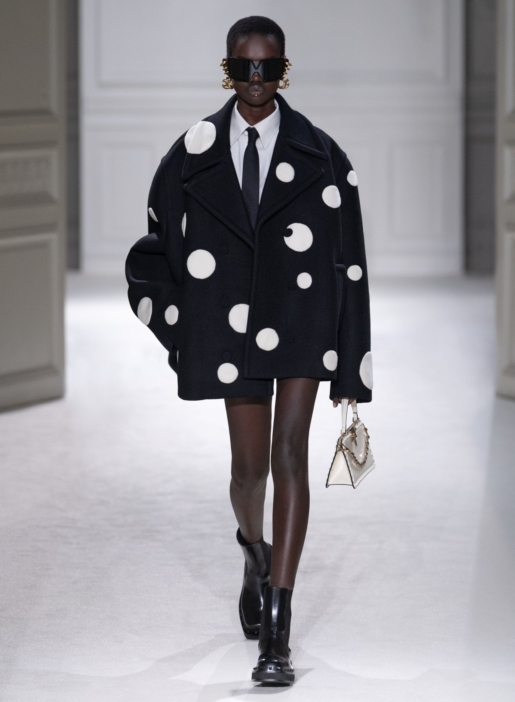 また、ダイナミックなグラフィックパターンもコレクションの鍵に。力強いドットやストライプ、格子模様がポップな遊び心をプラス。コントラストを効かせたデザインが目を引いた。