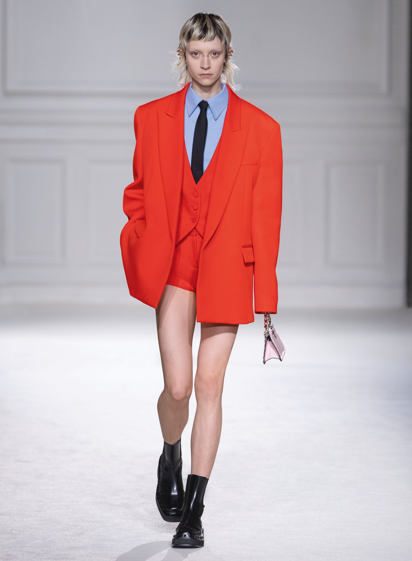 タイを取り入れたルックは「ウ?ァレンタイ(ValenTie)」と呼ばれ、無限のバリエーションを見せる。クラシックなスーツやシャツはもちろん、フルレングスのイヴニングガウンにも取り入れられた。タキシードもショートパンツと合わせ、ユニセックスかつ実用的なデイウェアへと生まれ変わった。