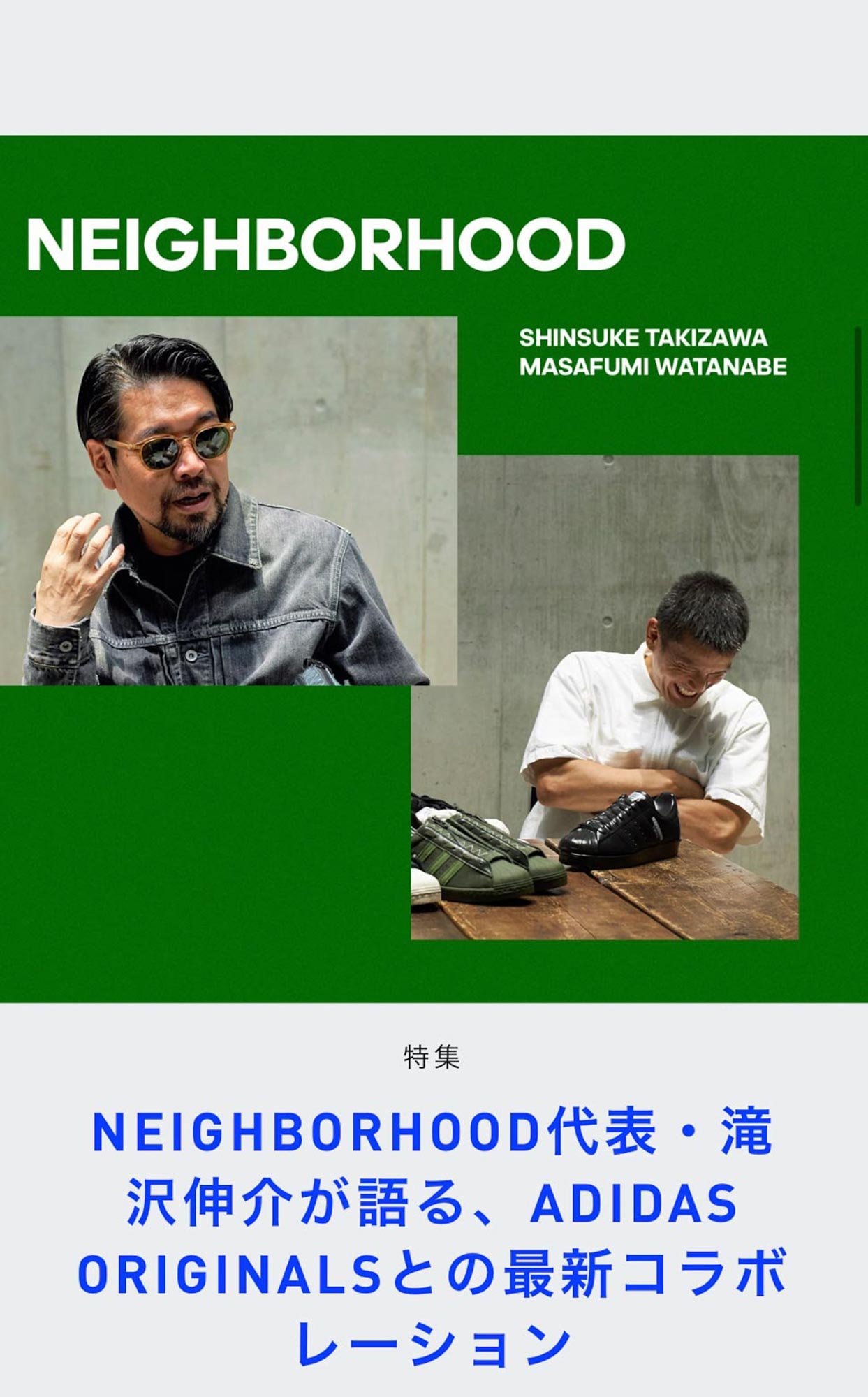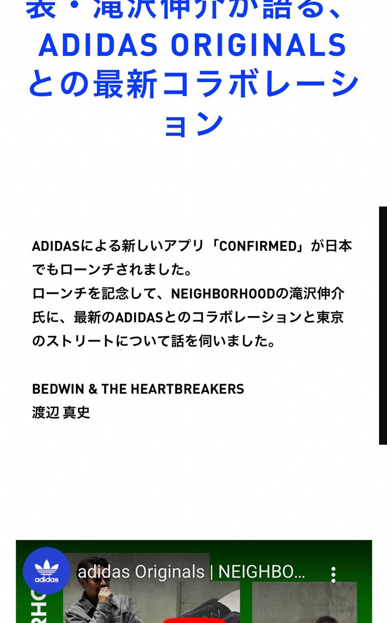 現在は日本でのアプリローンチを記念して、「ネイバーフッド(NEIGHBORHOOD)」のクリエイティブディレクター滝沢伸介氏が、アディダスに対する思いや最新コラボモデルの開発にまつわる裏話などを語っている様子を映した動画を公開。デザイナーの生の声で、コラボモデルについて知ることができる貴重な機会となっています。