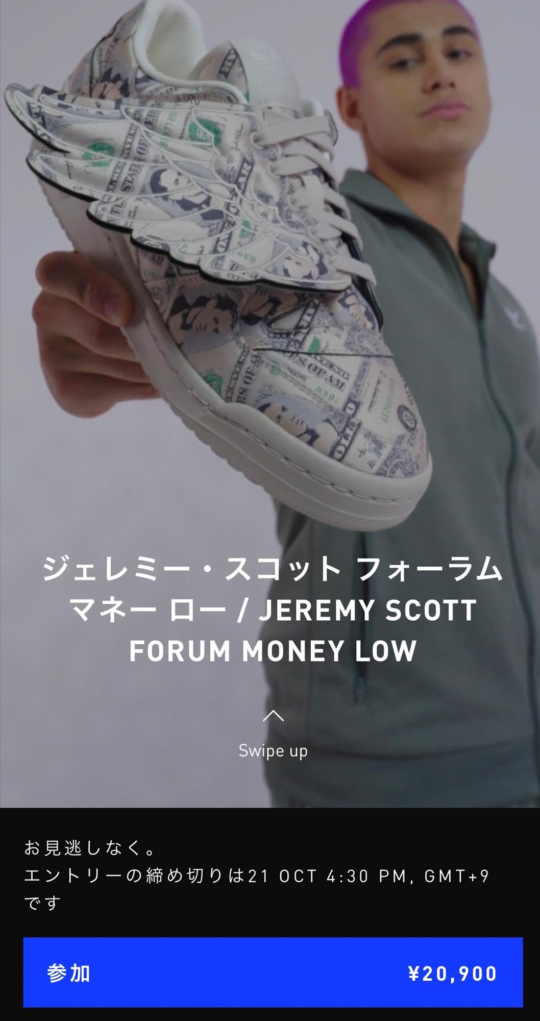 なお、本日発表されたジェレミー?スコット(Jeremy Scott)とのコラボモデル「JEREMY SCOTT FORUM MONEY LOW」が「GOLDEN TICKET」対象最初の商品で、その他「GOLDEN TICKET」有効期間中にコラボモデルなどの注目商品を展開するとのこと。期間中何度も使える「GOLDEN TICKET」ですから、どうしても財布の紐が緩んでしまいます。新作モデルの情報は順次公開されるということなので、首を長くして待ちましょう。繰り返しになりますが、「GOLDEN TICKET」取得の抽選応募受付は10月21日14時30分までです!