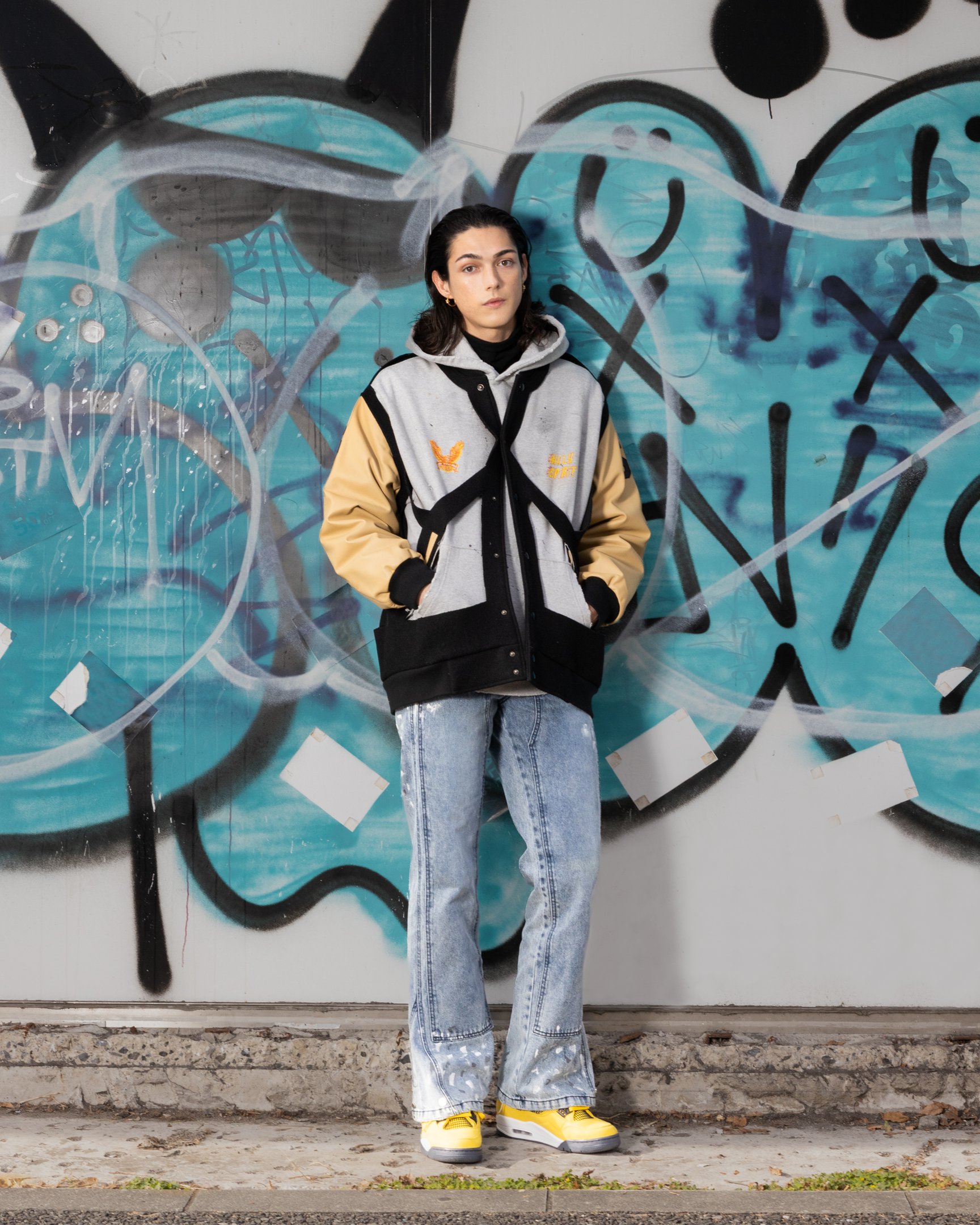スタジャンとスニーカーの組み合わせは、ストリートで人気だったスタイルのひとつ。現代のストリートシーンにおいてもベースとなるスタイルは大きく変えずに、その中でエッジを効かせたアイテムを取り入れたりして遊んでいる印象です。今どきのストリートファッションは、モードやラグジュアリーな要素を合わせる流れがあるので、「メゾン マルジェラ(Maison Margiela)」のカットオフスタジャンをメインにしました。実際、マルジェラを着ているラッパーは最近よく見かけますね。