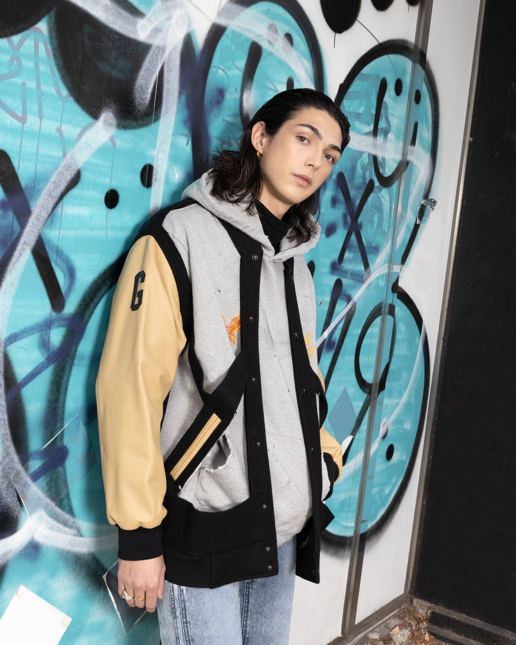 スタジャン:MAISON MARGIELA、パーカ?ジーンズ:SOMEIT、シューズ:NIKE