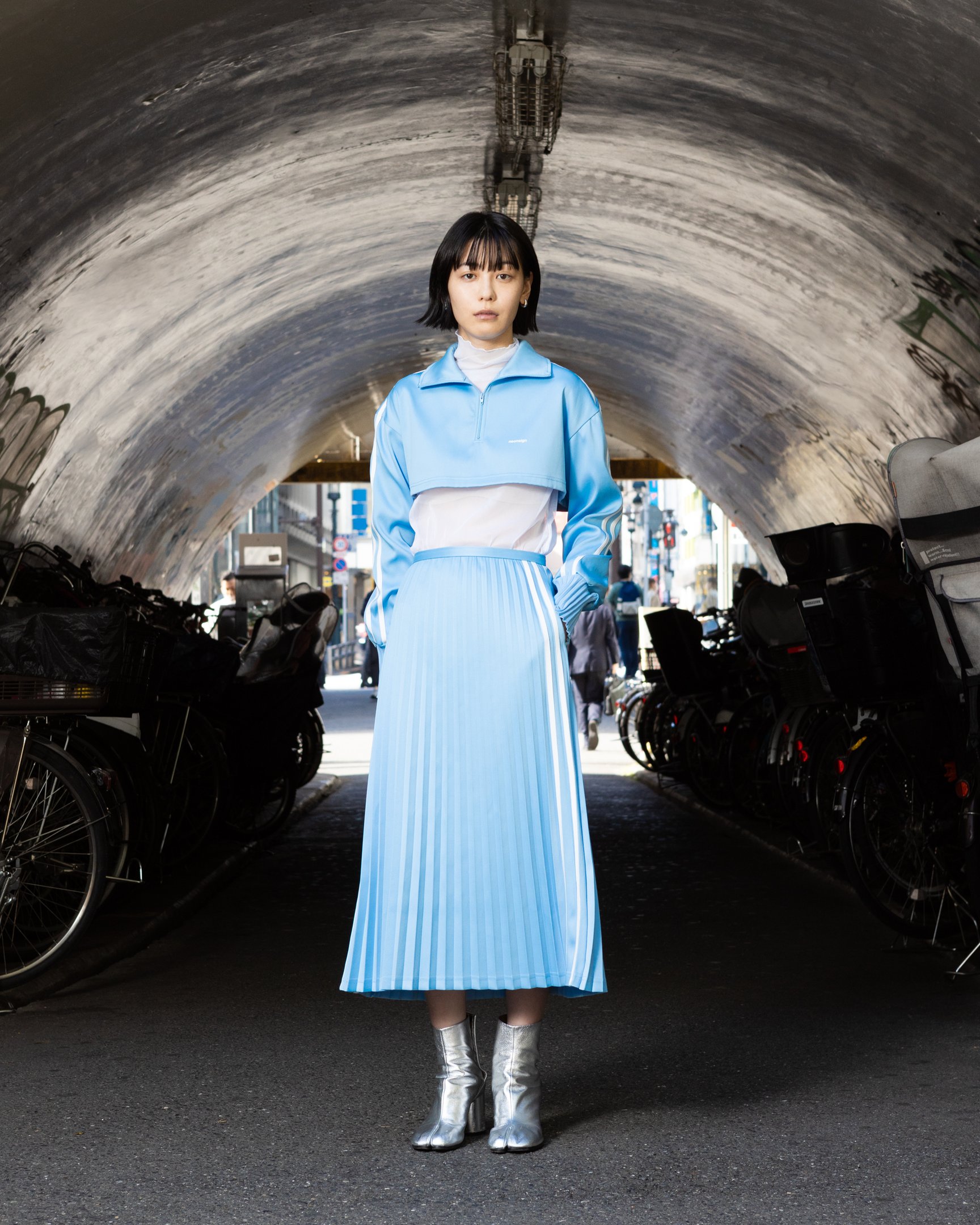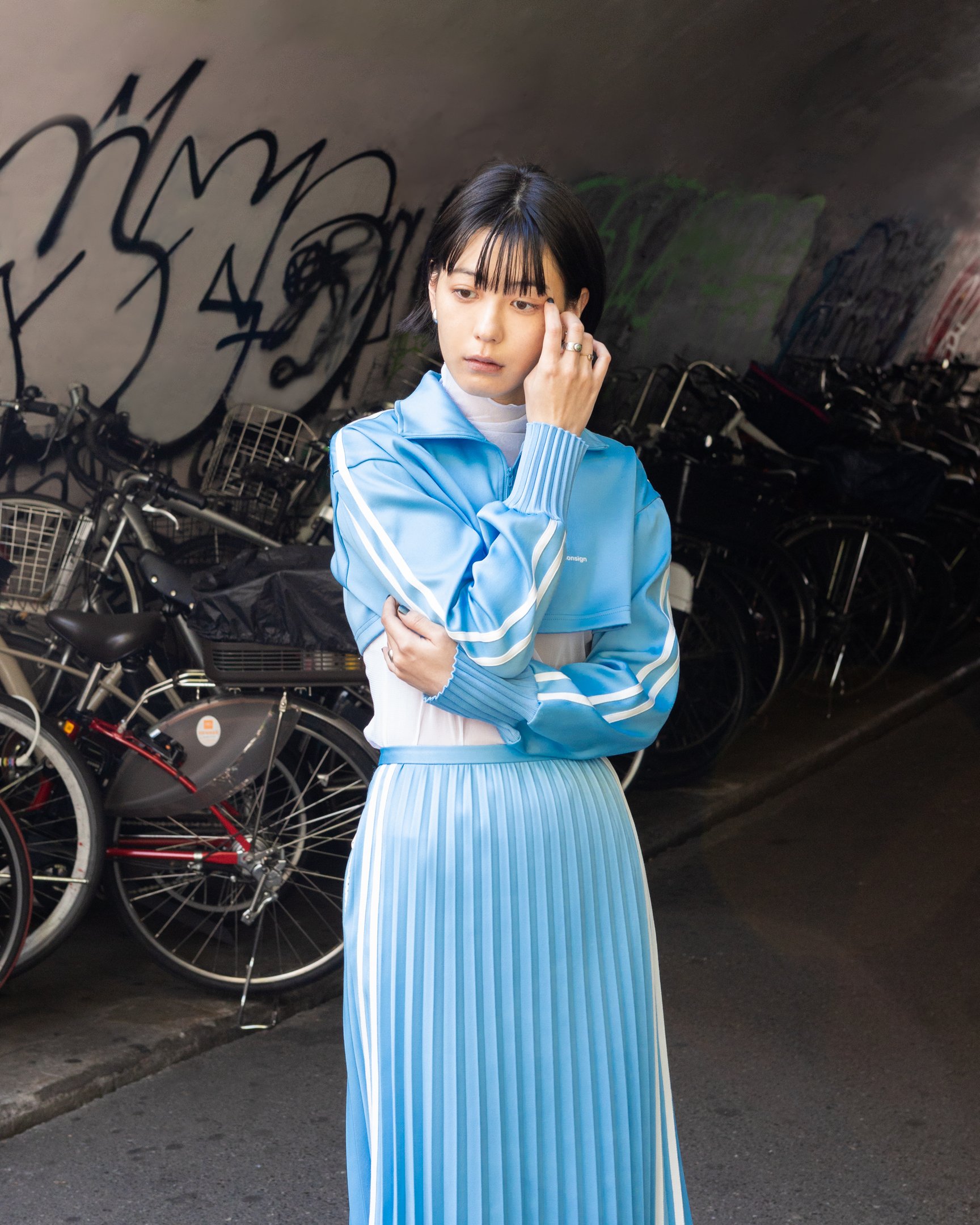 ジャージーといえば昔は不良が着ているようなイメージが先行していましたが、今ではストリートブランドだけではなく、ラグジュアリーブランドがジャージーをファッションアイテムとして昇華しています。時代の移り変わりと共に少しずつデザインやシルエットを変えながら、あらゆる層から支持されるジャージーはまさにタイムレス。今回選んだのは、いわゆる運動着のジャージーとは全く異なる進化版ジャージー。カラーはあえてジャージーらしさのない水色をチョイスし、ヒールのあるシューズを合わせることで、ドレスを着ているような上品さをプラスしました。メイクはシンプルに、肌と髪のツヤ感を出す程度に抑えてクリーンな印象にまとめました。