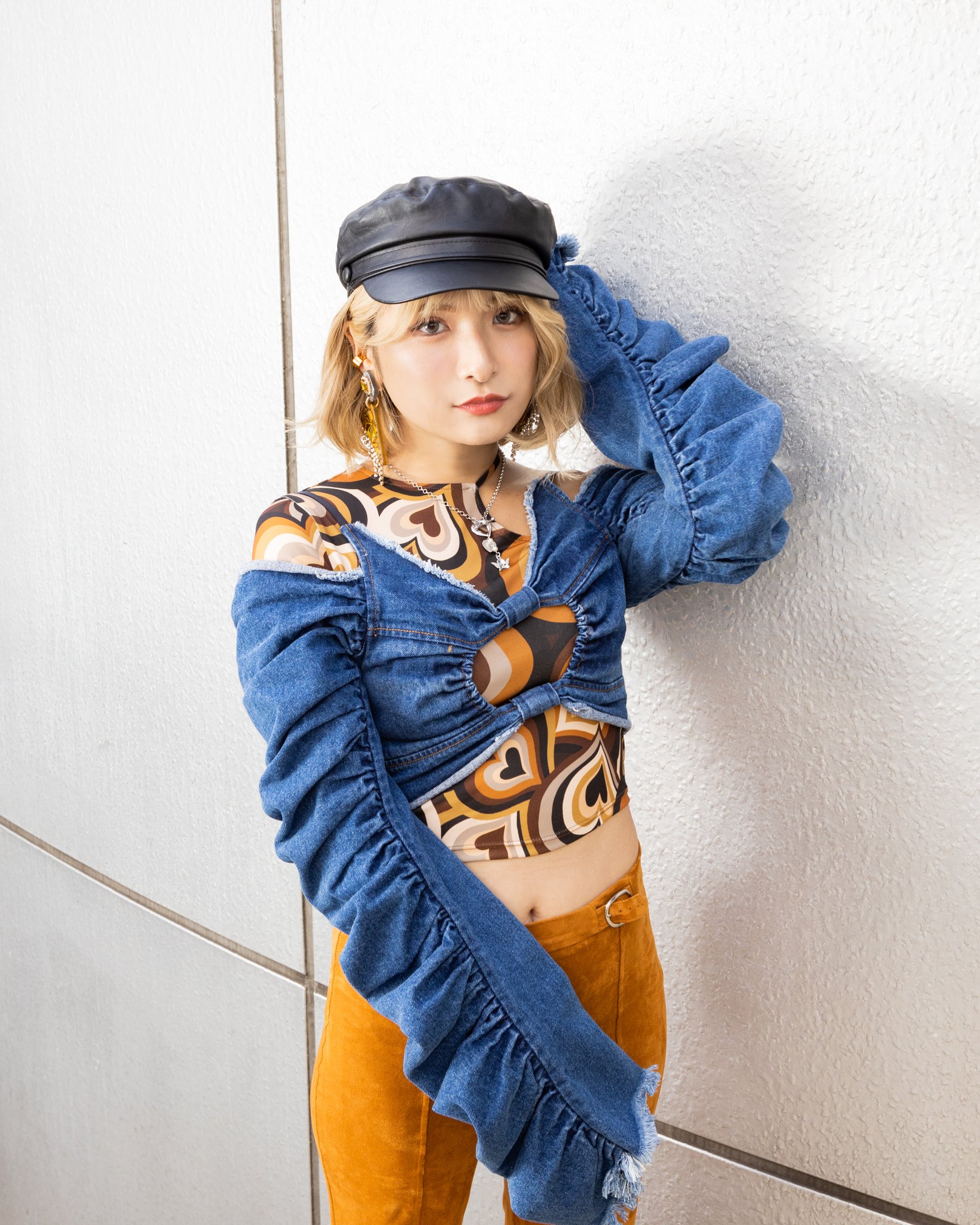 当時一世を風靡した渋谷109系のギャルをはじめ、彼女たちは時代の最先端のお洒落を見つけてきて、楽しむことがとても上手い。当時のギャルの肩やウエスト部分など肌の出し方を意識しながら、モードな雰囲気にアップデートしました。トップスには、日本ではまだあまり知られていない中国発のブランド「DIDU」を最先端ファッションの象徴として取り入れました。そのほかのアイテムには「ベルシュカ(Bershka)」など渋谷らしいブランドをセレクト。前髪と全体を軽く外巻きにし、動きをつけたヘアスタイルにすることで、今どきのギャルっぽさを演出しています。