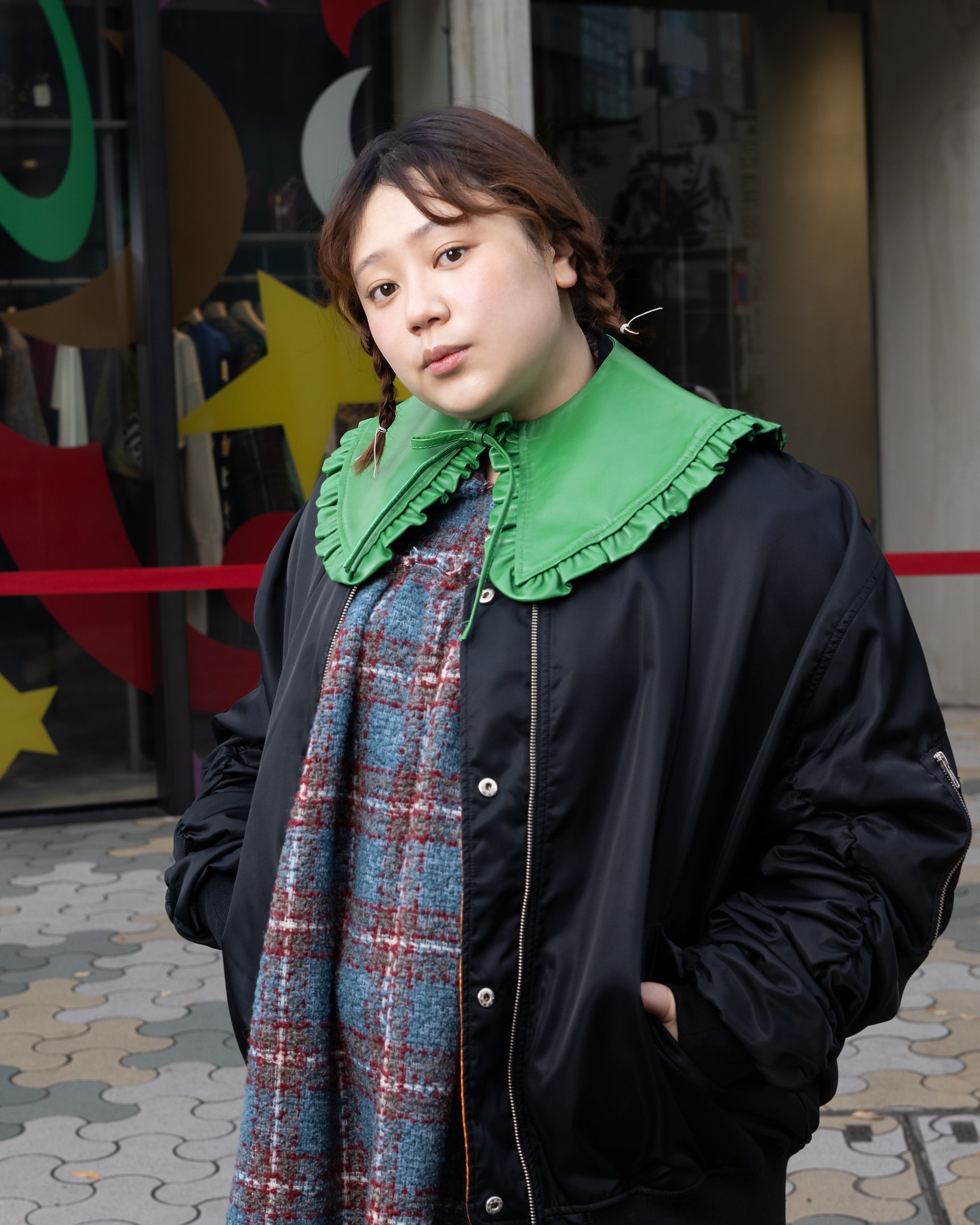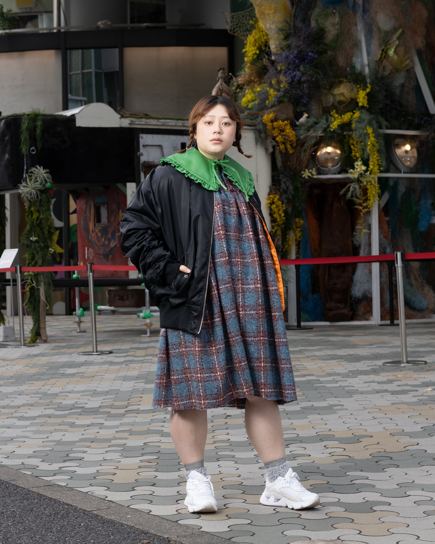 MA-1:KAWI JAMELE、ワンピース:yushokobayashi、つけ襟:GANNI、靴下:FACETASM、スニーカー:NIKE
