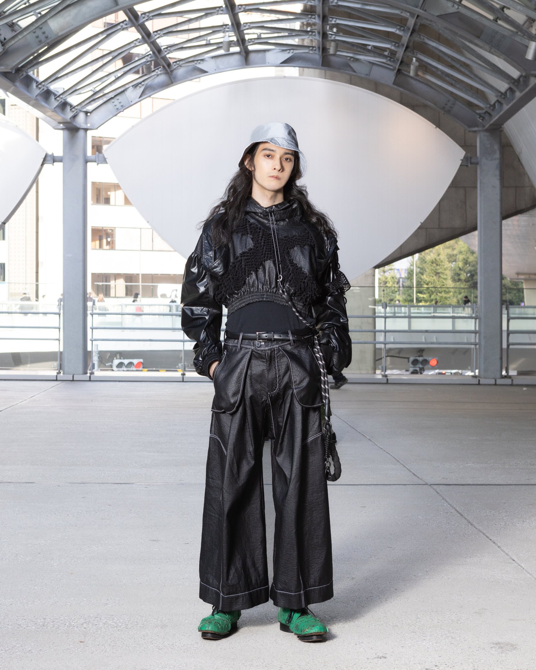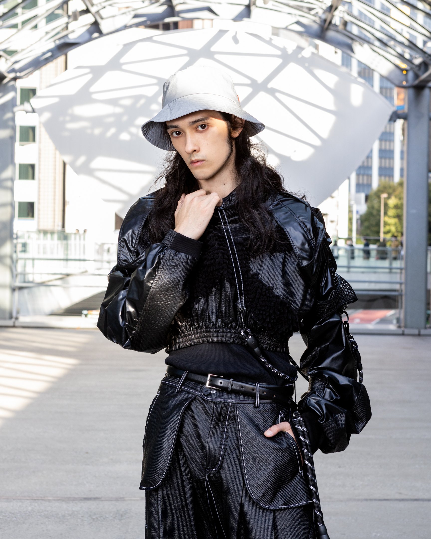 原宿にルーツのあるサイバーファッションといえば、ネオンカラーや通常ファッションアイテムでは使われないような特殊な素材が多用されたスタイルが特徴。サイバーファッションを再解釈するにあたり、今回は鮮やかなカラーリングを極力排し、あえて艶感のあるブラックをメインに。一見シンプルなジャケットですが、よく見るとハイテクで一癖ある個性的な装飾が施されています。リフレクター素材のハットや、アッパー全体にガムテープが貼られたヴィンテージシューズといったエッジの効いたアイテムを合わせて、現代のスタイルにサイバーファッションのエッセンスを落とし込みました。