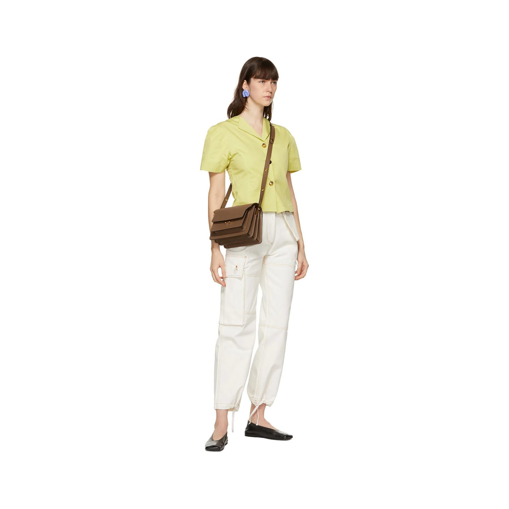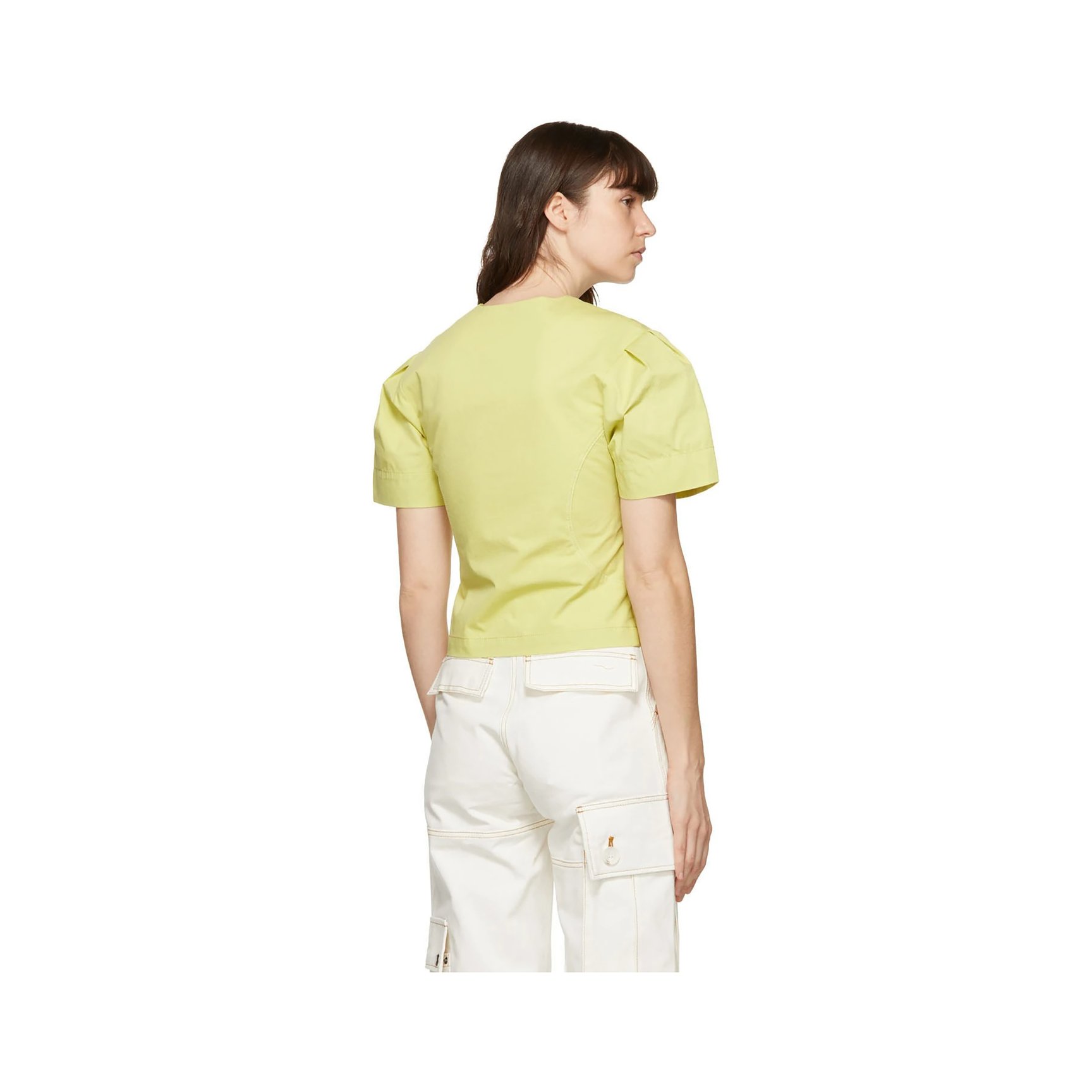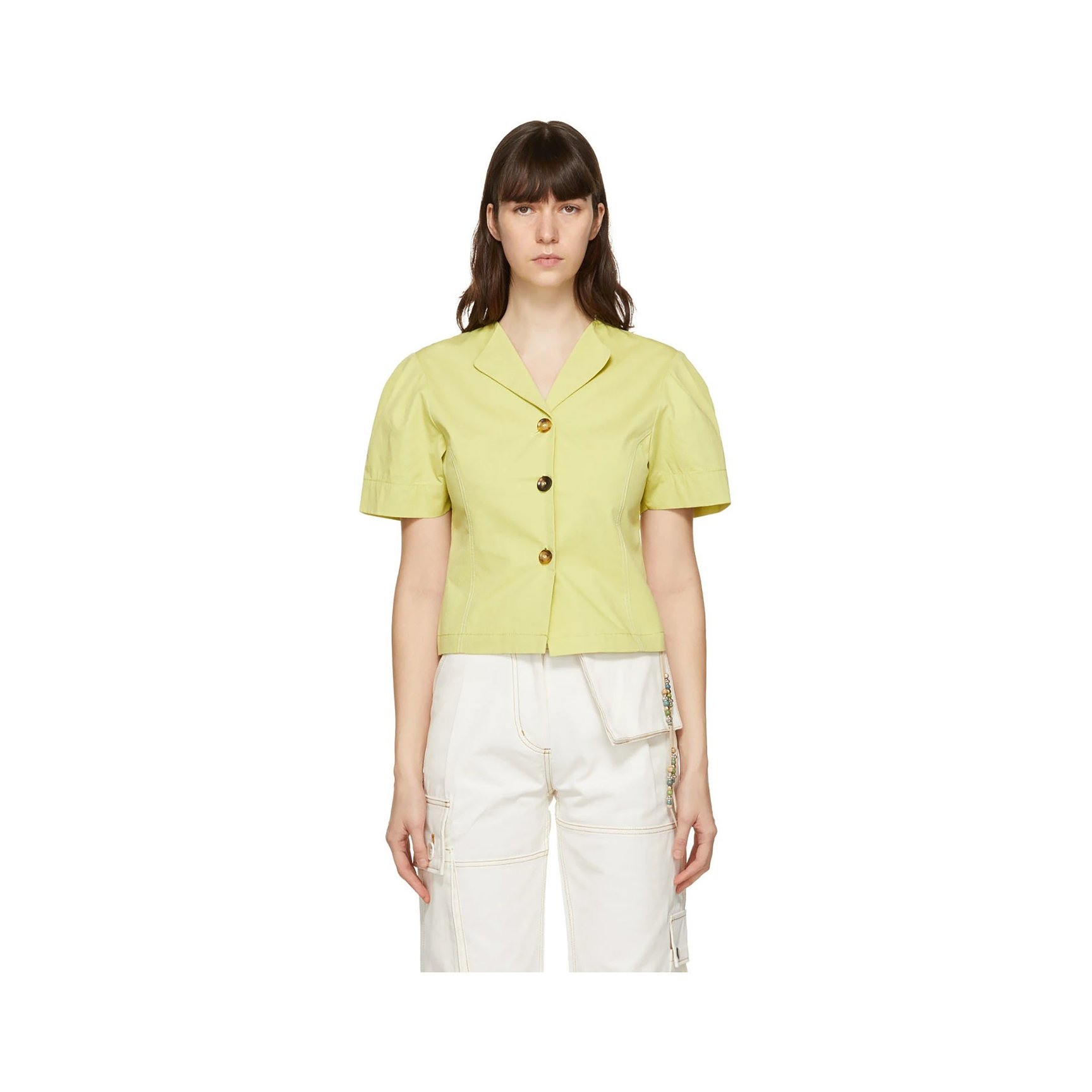 レモンイエローカラーの半袖シャツです。パフスリーブならではのボリューム感を、オープンカラーやウエスト丈で絶妙なバランスに仕上げています。