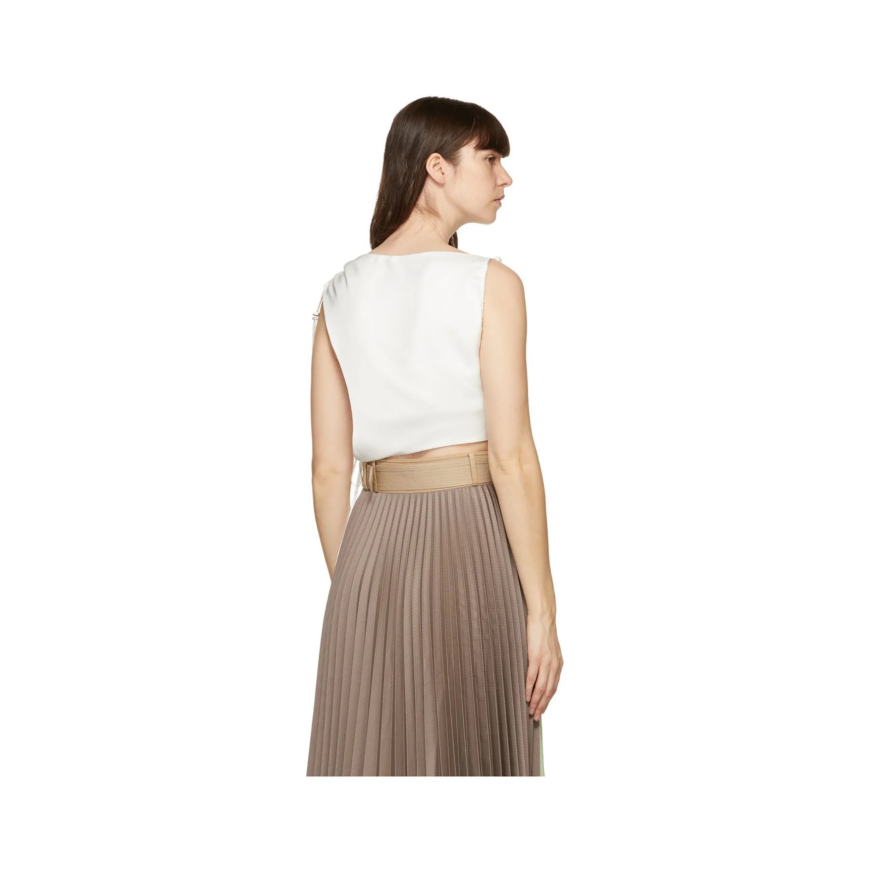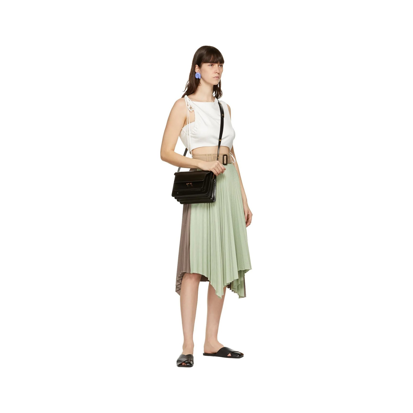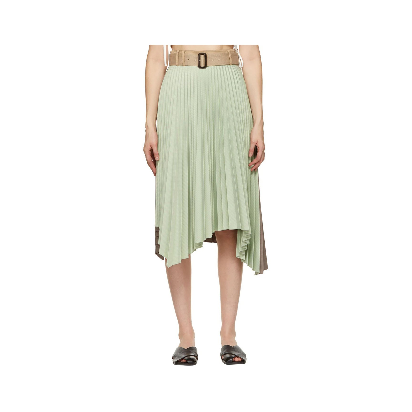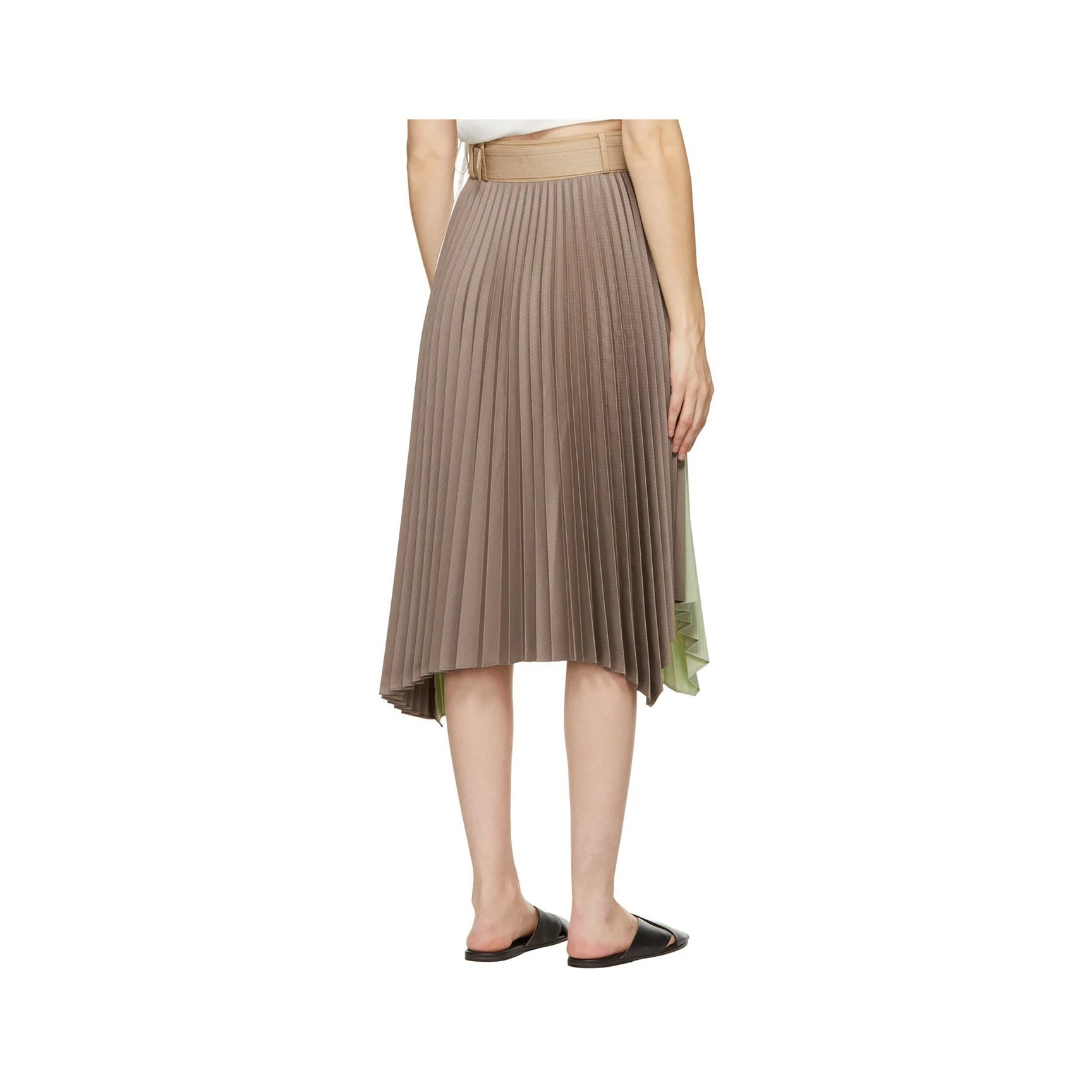 女性らしい着こなしが決まるミディ丈のプリーツスカートです。ウエストマークする太めのベルトで流麗なプリーツを強調しつつ、ソフトなペールトーンカラーでエレガントな印象に仕上げています。アシンメトリーなヘムラインや、バックとフロントのカラーブロッキングなど、ひとひねり加えるのが「アンダーソン ベル」流。