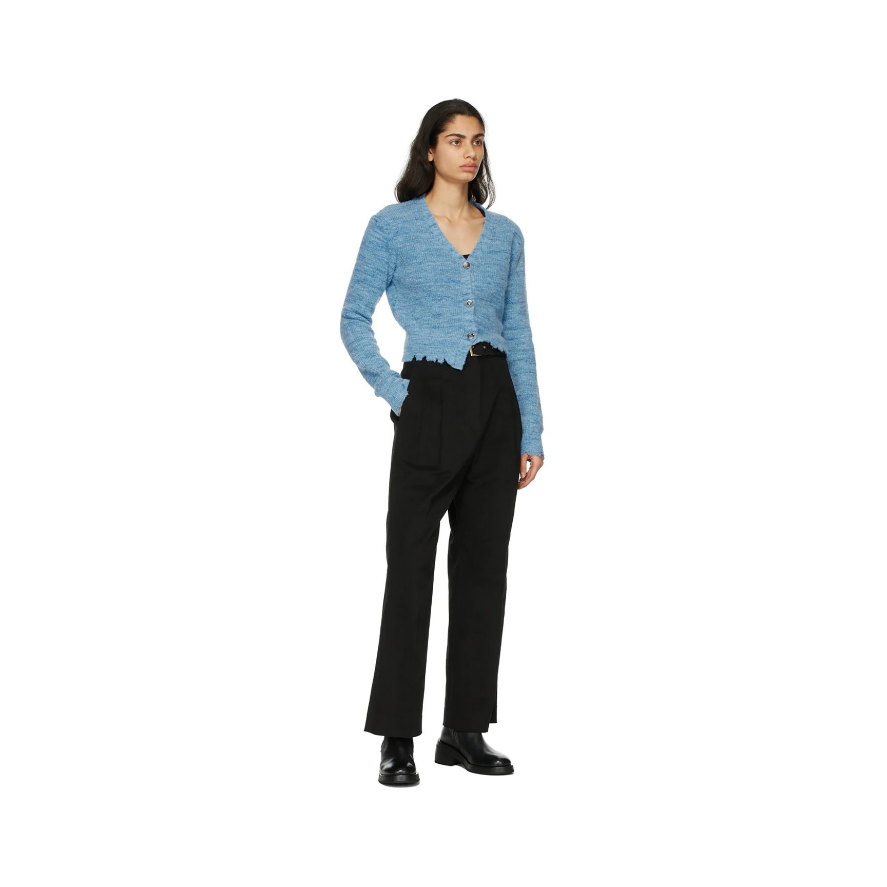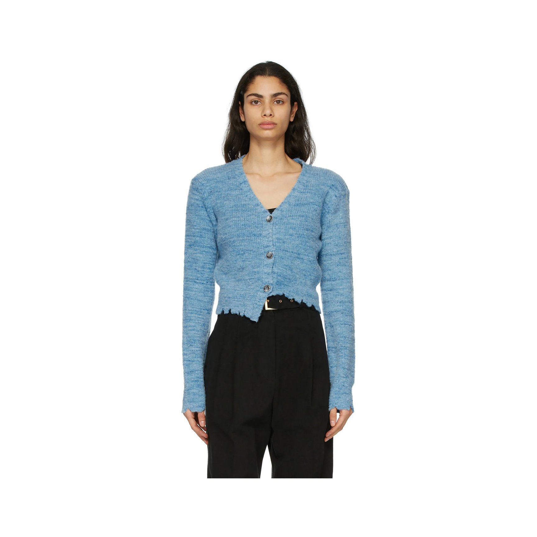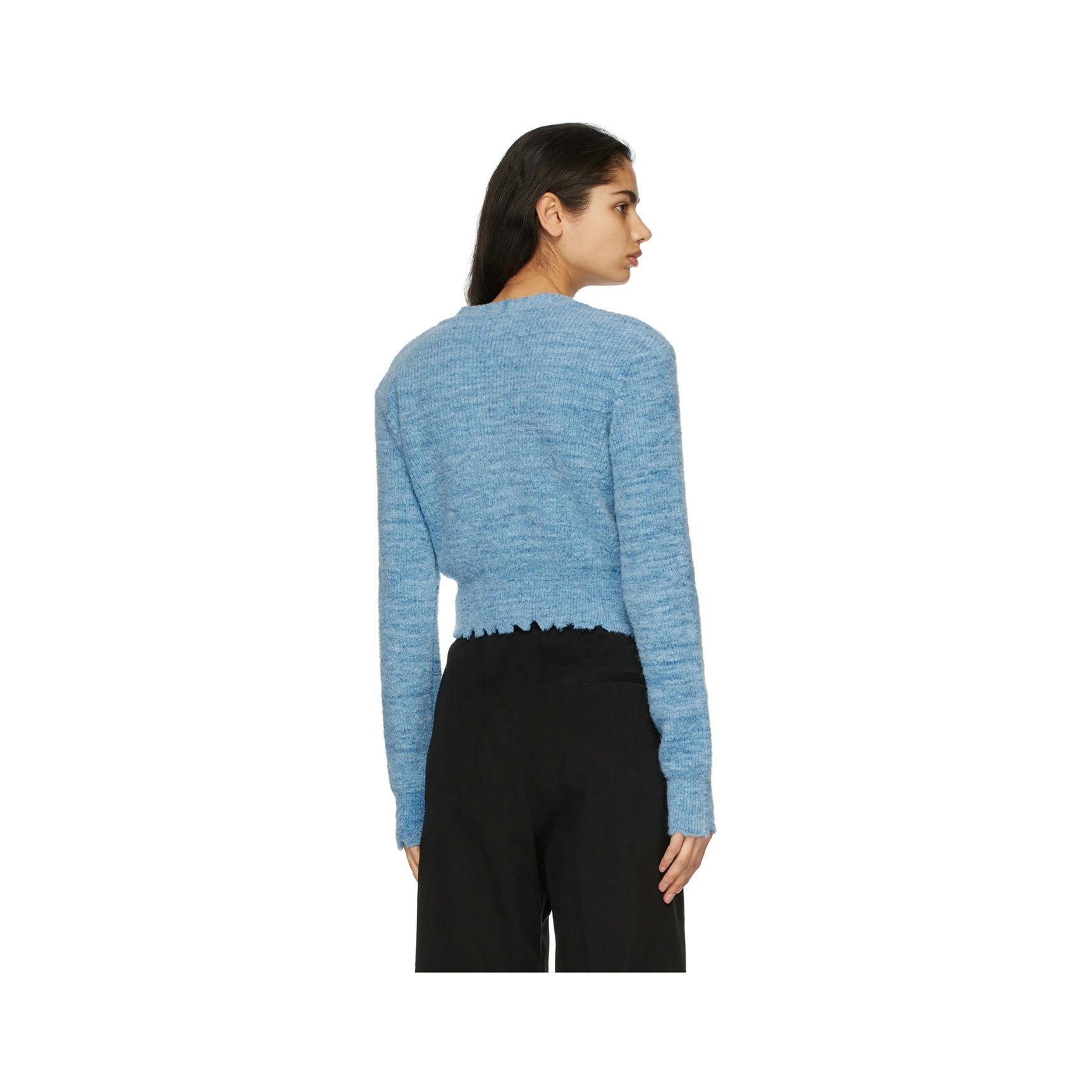 単色のブルーのカーディガンも、細かなディテールにこだわって存在感ある一着に。メランジ調の色ムラに加え、クロップド丈やアシンメトリーな裾、裾のダメージ加工など目を引く要素がたくさん。合わせやすいのに個性派なアイテムは、着こなしの幅をぐんと広げてくれるはずです。