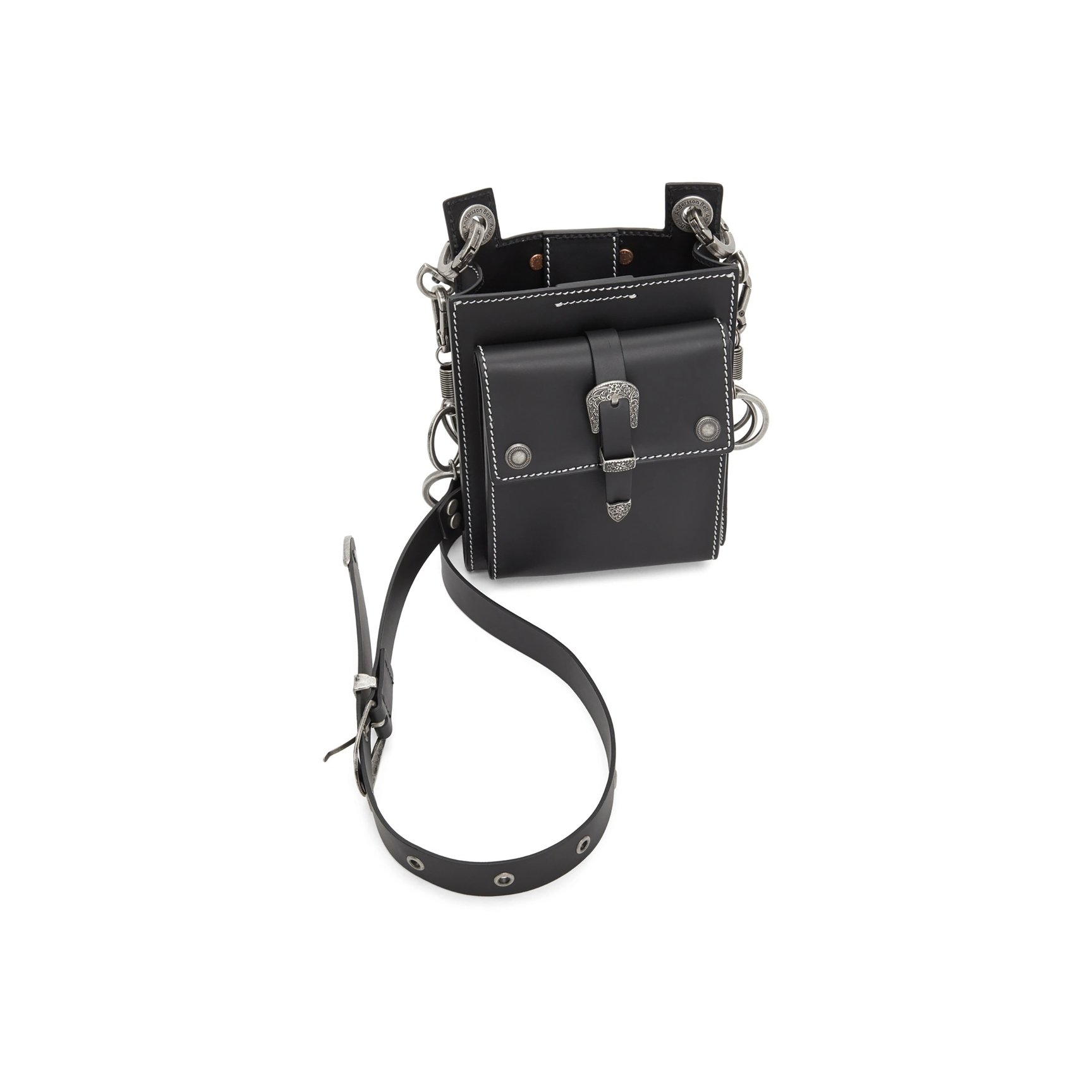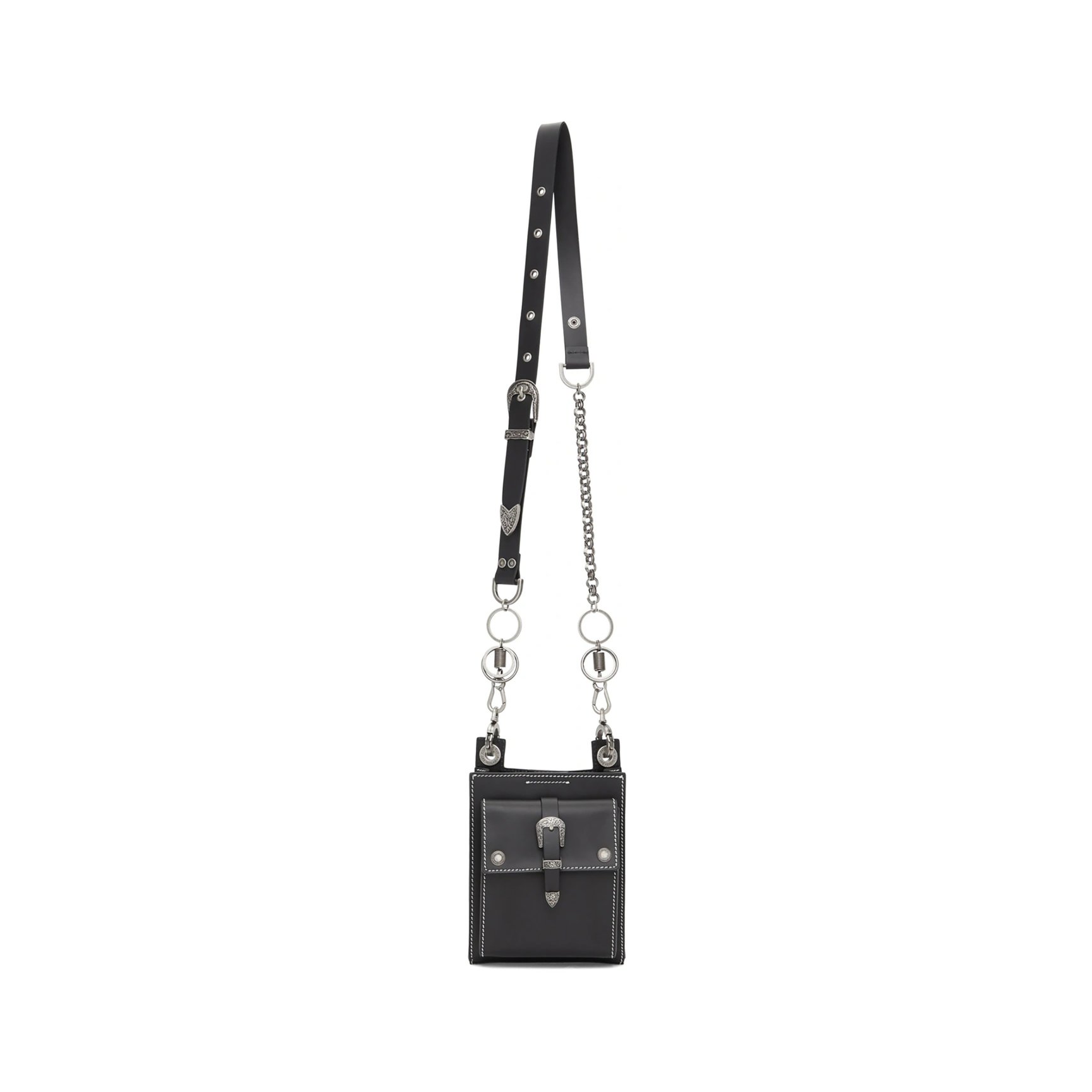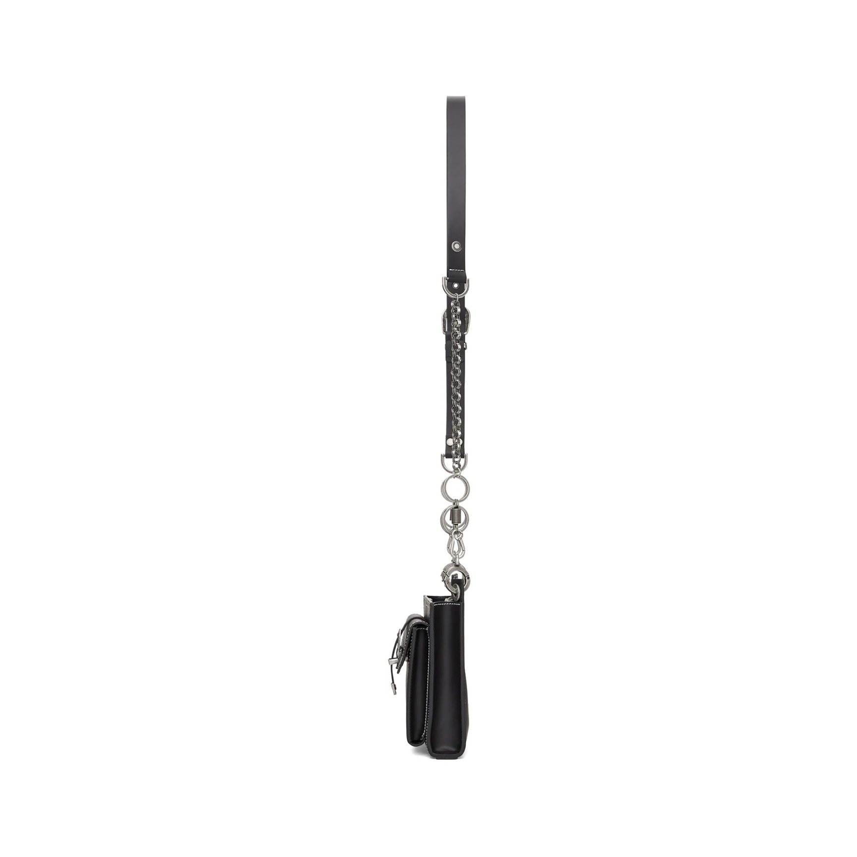お財布やスマホといった必需品をコンパクトに持ち歩けるミニサイズのバッグです。レザーにシルバーのハードウェアを配したエッジの効いたデザインが、コンパクトなボディと好相性。