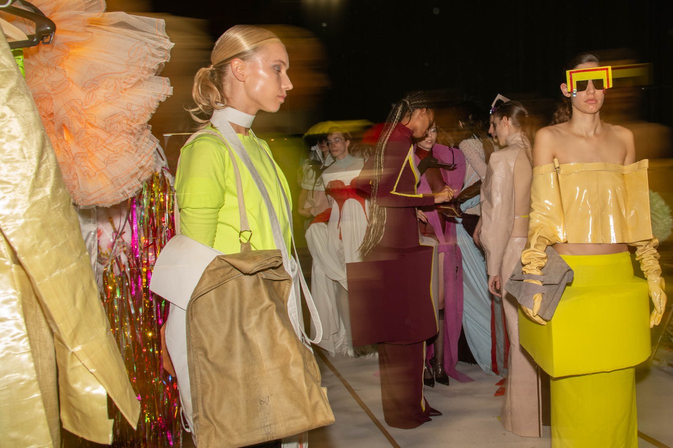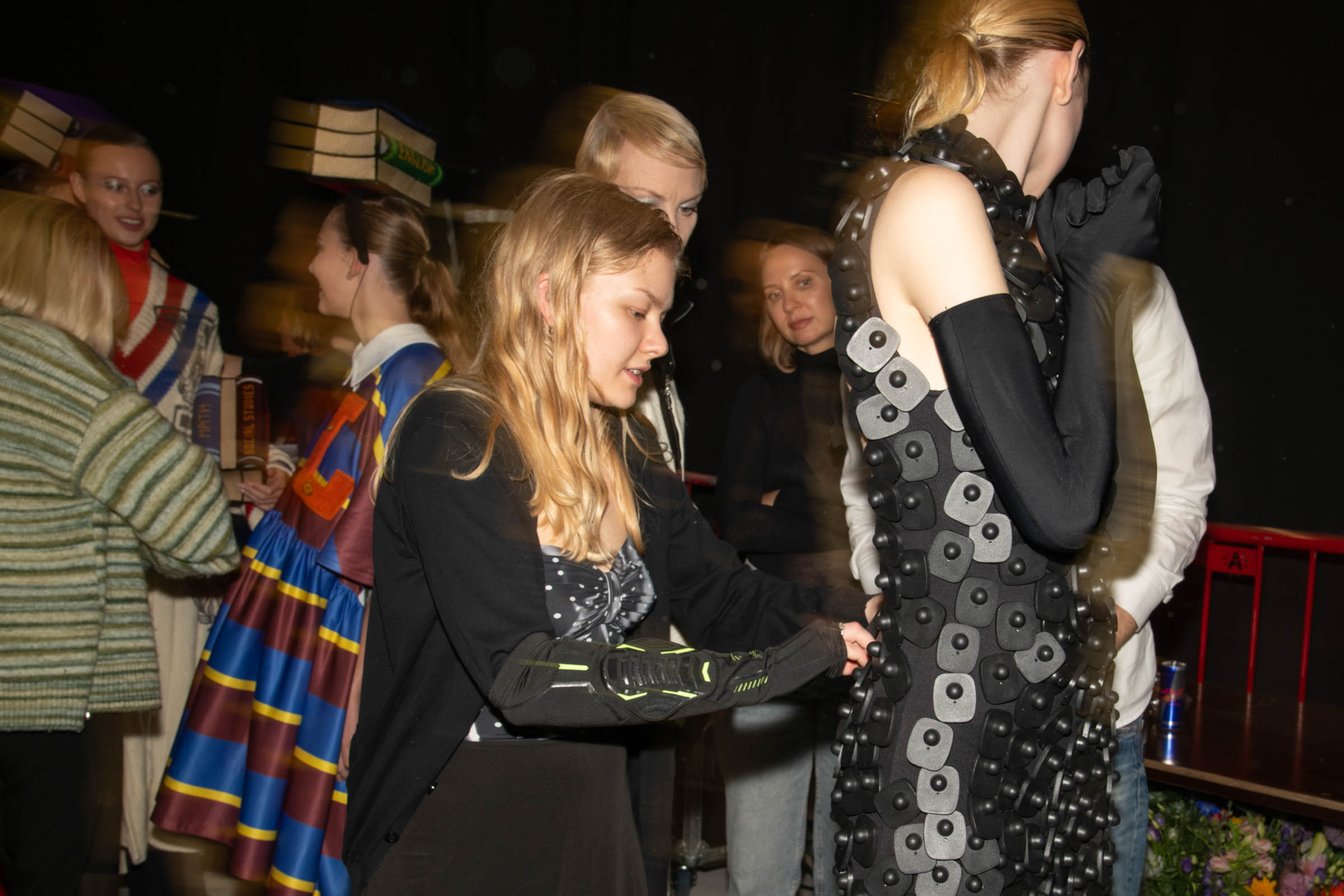 ショー1日目、会場はファッションショーが始まるのを待ちわびる観客で埋め尽くされていたが、バックステージでは生徒たちが慌ただしく動き回っていた。開始のカウントダウンが進むと会場が暗転。緊張感が高まる中、ファーストルックのスカートが静かにランウェイに登場し、ショーがスタートした。自分の作品をモデルに着せつけるだけでなく、他の学生のサポートもしなくてはならず、複雑な構造を持つ作品を扱うときは、素早く慎重に対応する必要があった。フィッティング調整を終え、モデルをステージへ送り出す。