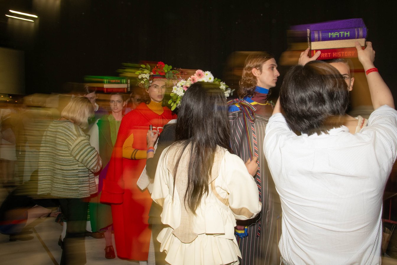 ショーの会場作りは音響からモデルのメーキャップまで、アカデミー側が行うため、学生は作業に集中できる。バックステージに入ってからも手直しやモデルへの着せ付けに追われるだけでなく、ショーの後に控える進級試験の準備をしている生徒も少なくない。その後、振り分けられた番号に基づいて所定の場所に作品を配置し、モデルを共有する他学年の生徒から着せつけの説明を受ける。ショー前日にはモデルが不在のため、作品の構造が複雑な場合、説明するのもされるのも大変である。