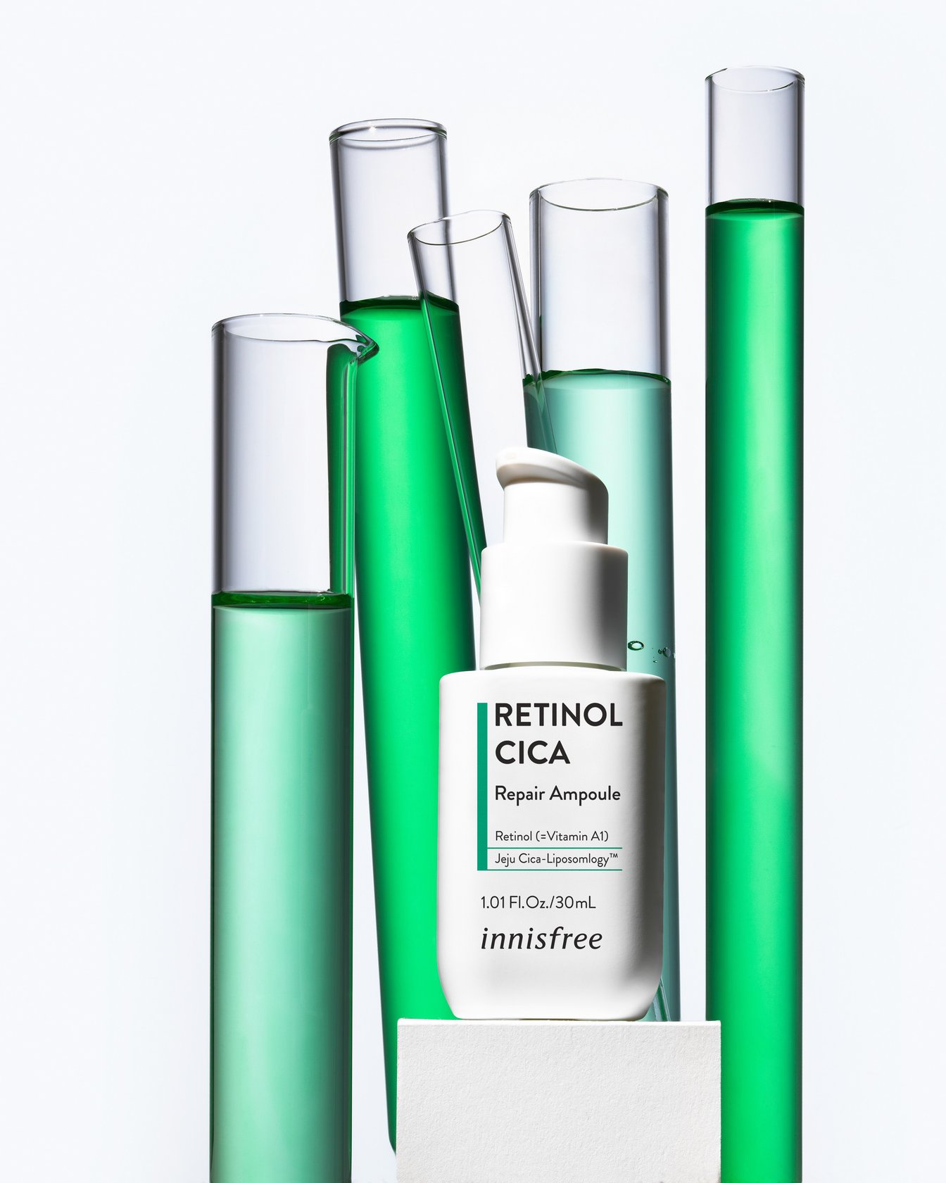レチノール配合商品がさまざまに発売されている韓国。レチノールはエイジングケアや肌のターンオーバーを整えるなどの効果が期待できるものの、副反応もあるため、低い濃度から肌を慣らすのが鉄則。「アイオペ(IOPE)」の「レチノール エキスパート」シリーズは、濃度別の3種を用意し、肌状態や適応期間に応じたセレクトができます。「イニスフリー(Innisfree)」の「レチノール シカ リペア セラム」は、毎日使える低刺激処方で注目を浴び、発売後すぐに完売した店舗が続出。