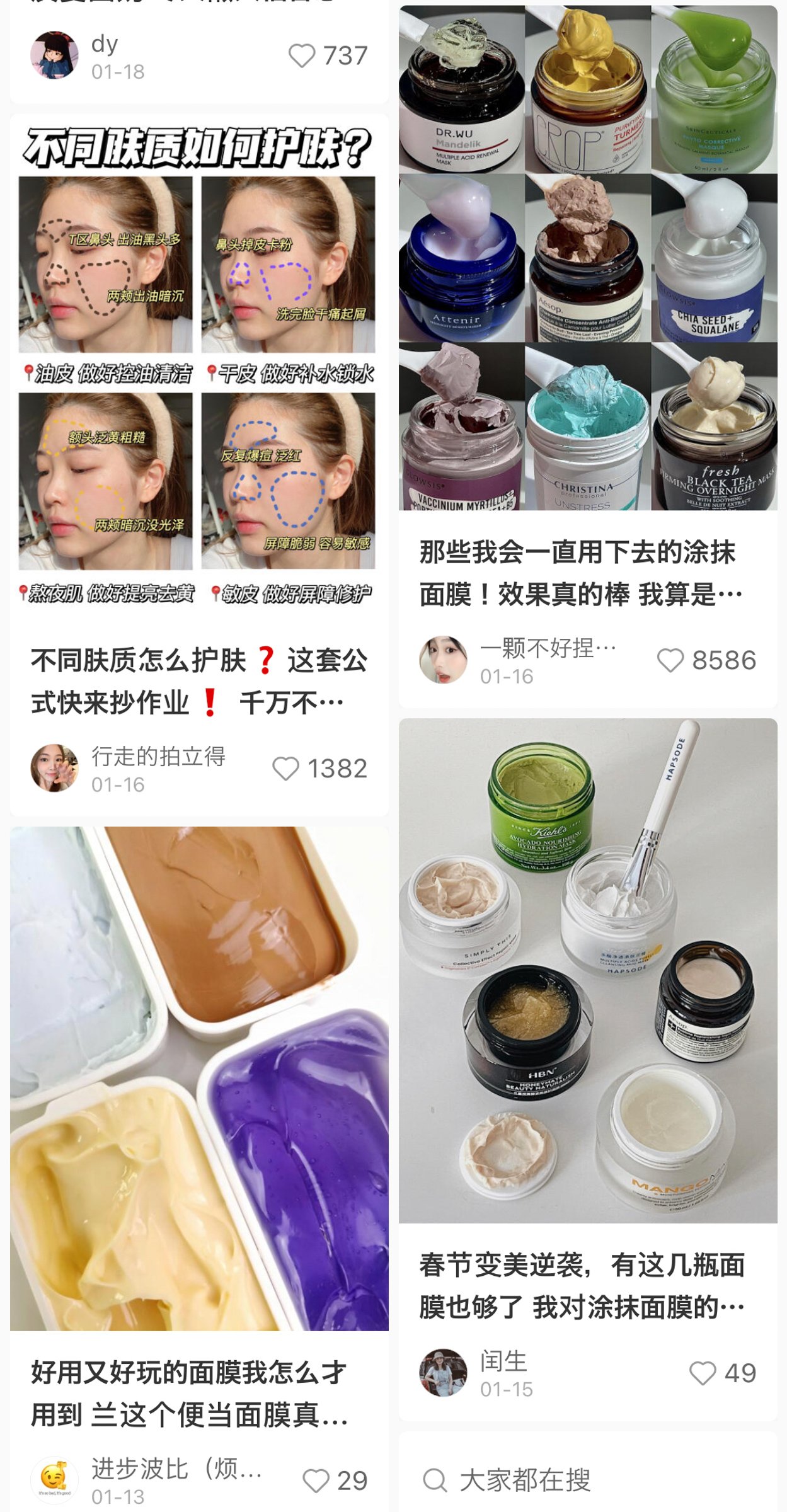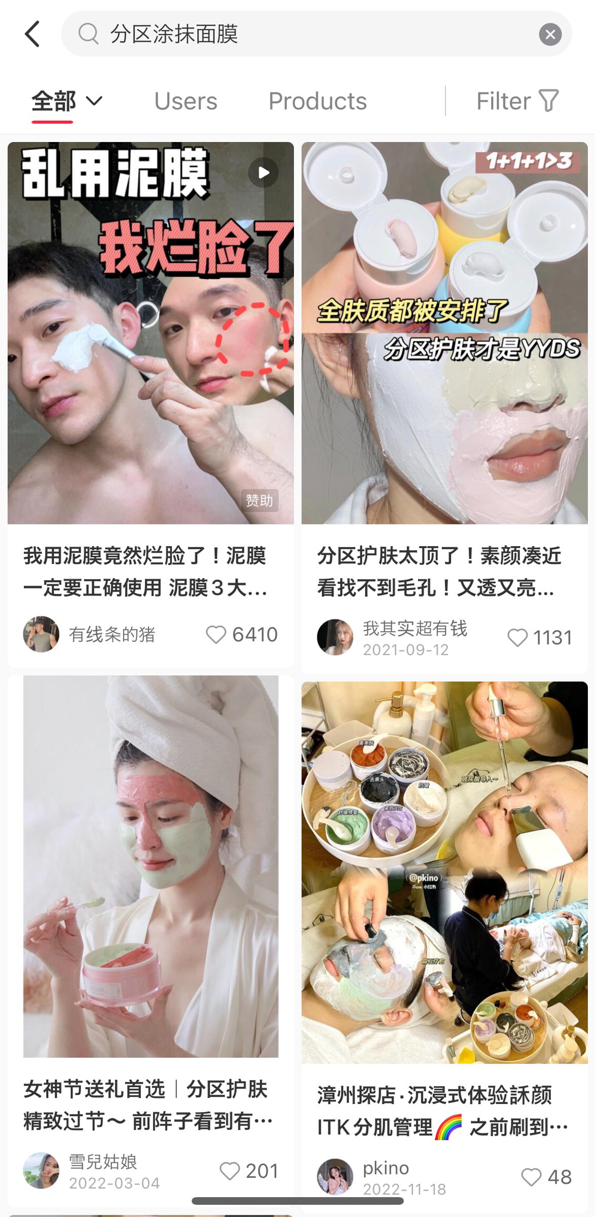 小紅書(RED)「ウォッシュオフマスクの部分使い(分区涂抹面膜)」検索画面より