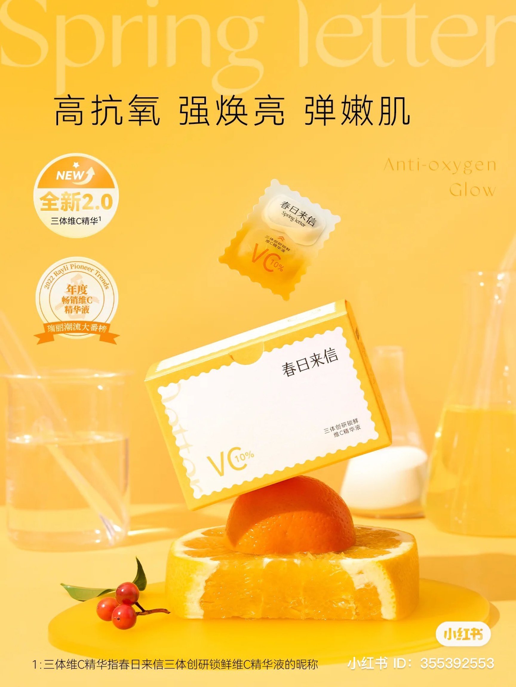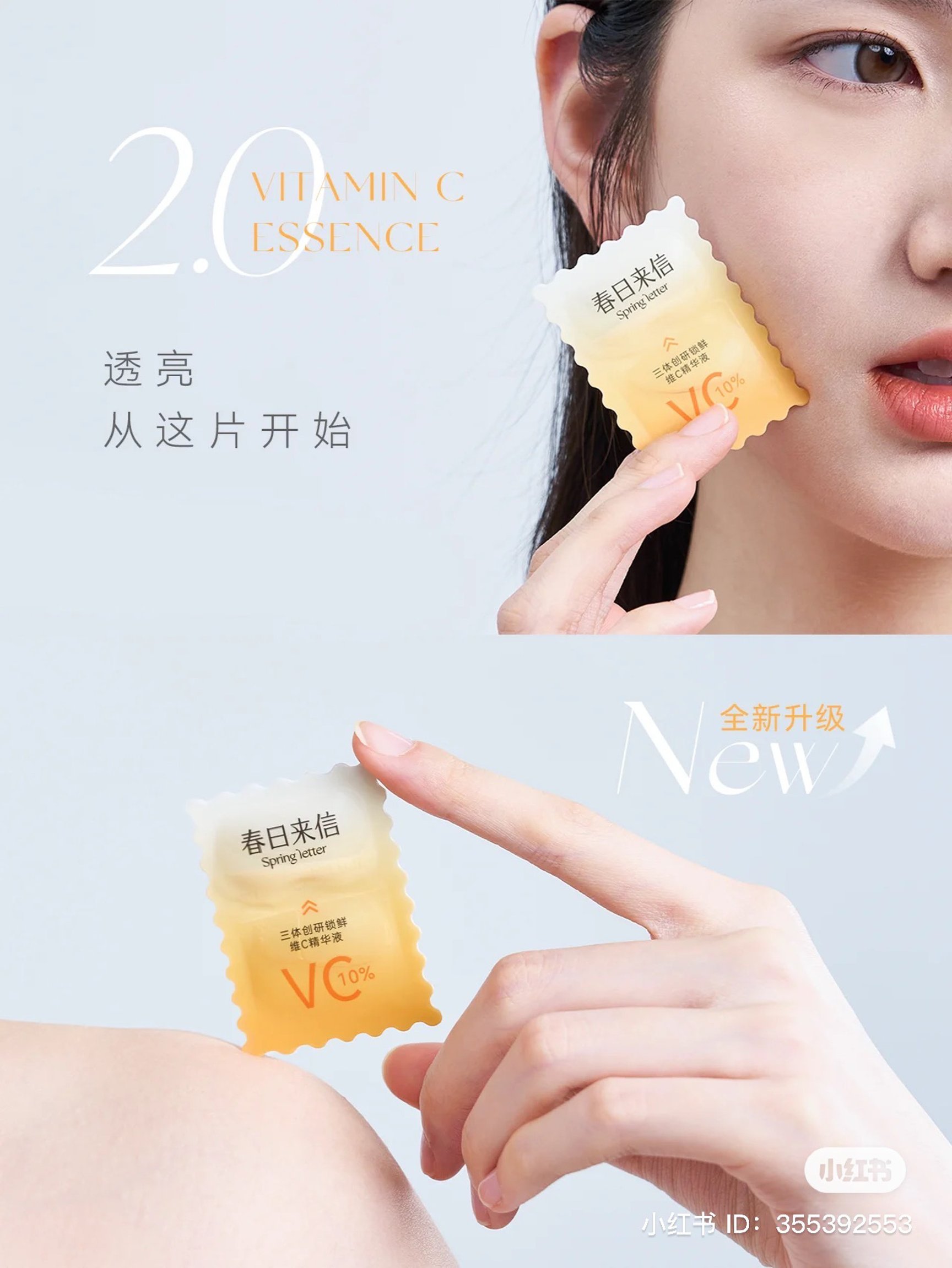 こうした成分を新鮮な状態で使用するため、使い切りタイプのアイテムが注目を浴びています。「春日来信(Spring Letter)」の「ビタミンCエッセンス2.0」は新鮮な状態で使用できる使い切りタイプの美容液で、使う直前に混ぜ合わせます。