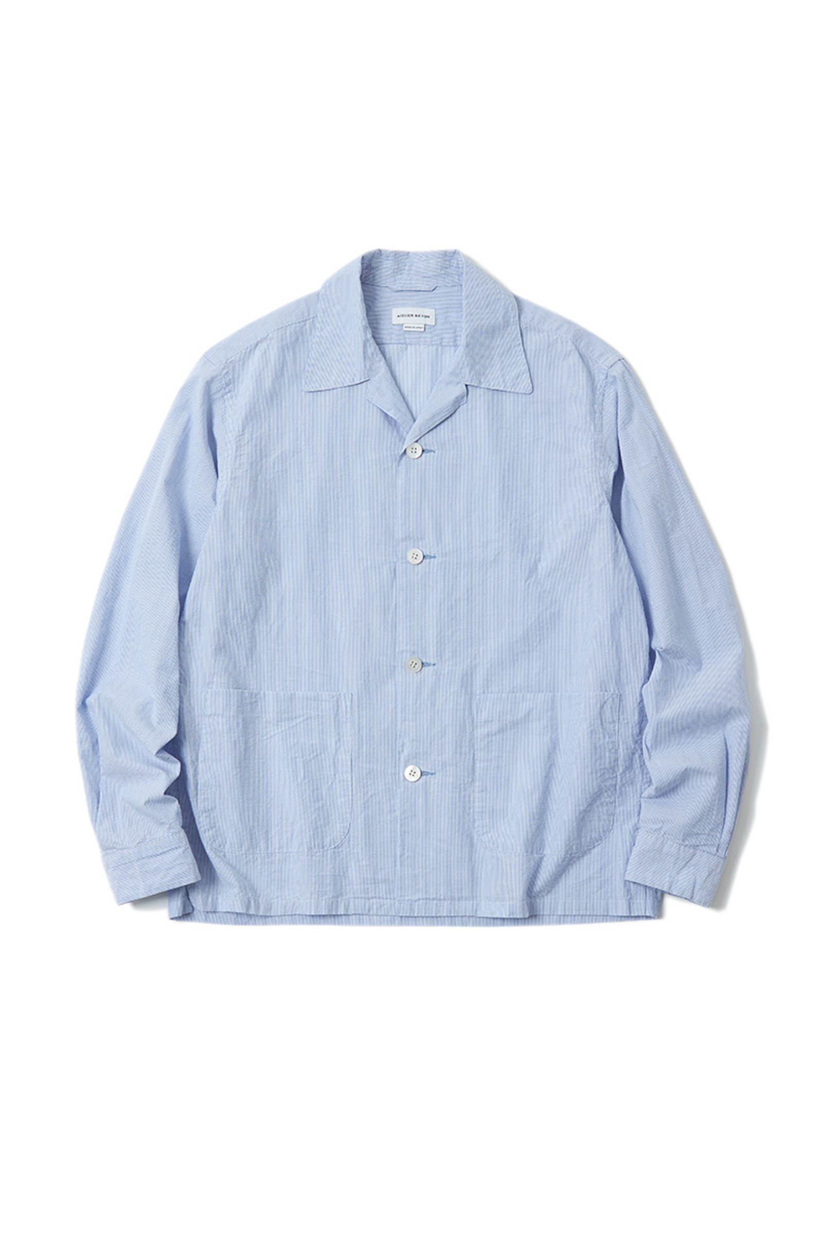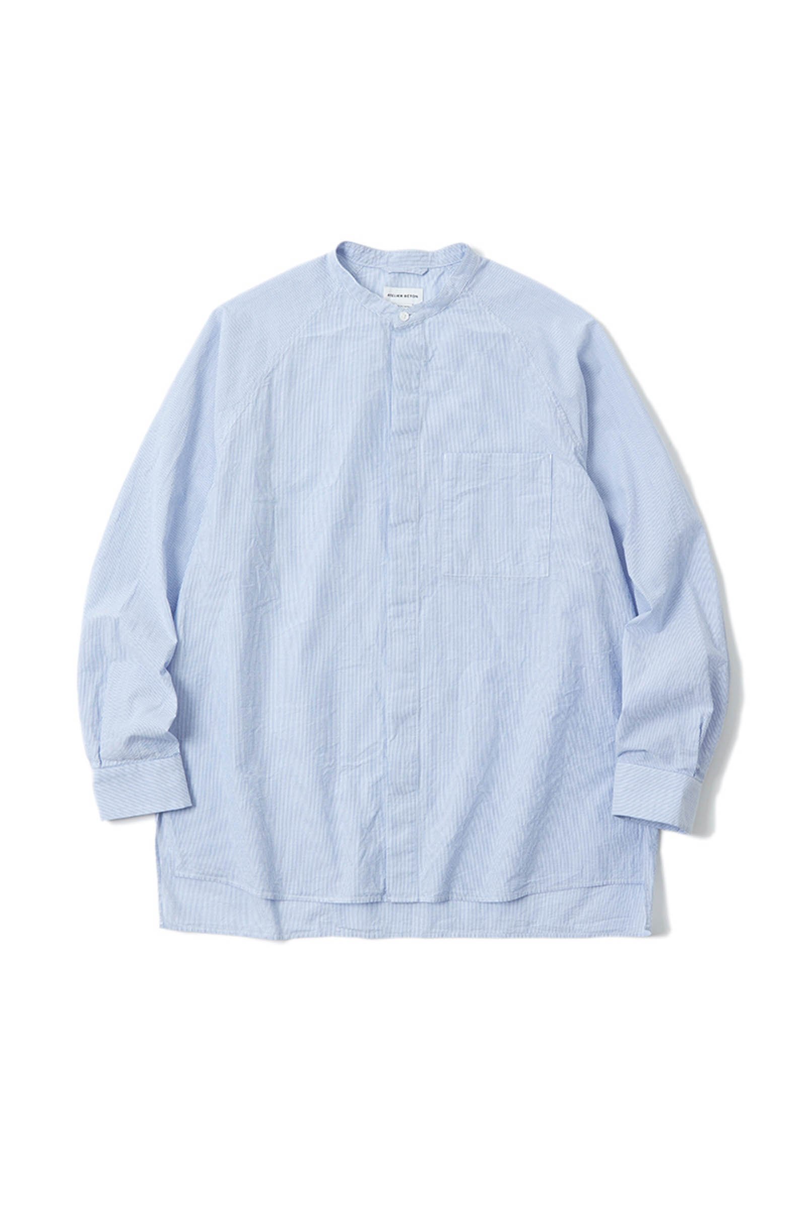 ブランドの代名詞であるキャンバス地のワークエプロンをサッカー素材で落とし込むことで、ファッションアイテムとして成立させた印象的なルック。同素材のシャツを合わせることで、エプロンが自然に馴染むスタイリングは、料理をしてるシーンで使われるエプロンを外着の一部として提案するという、ブランドとしてのメッセージが強く感じられます。