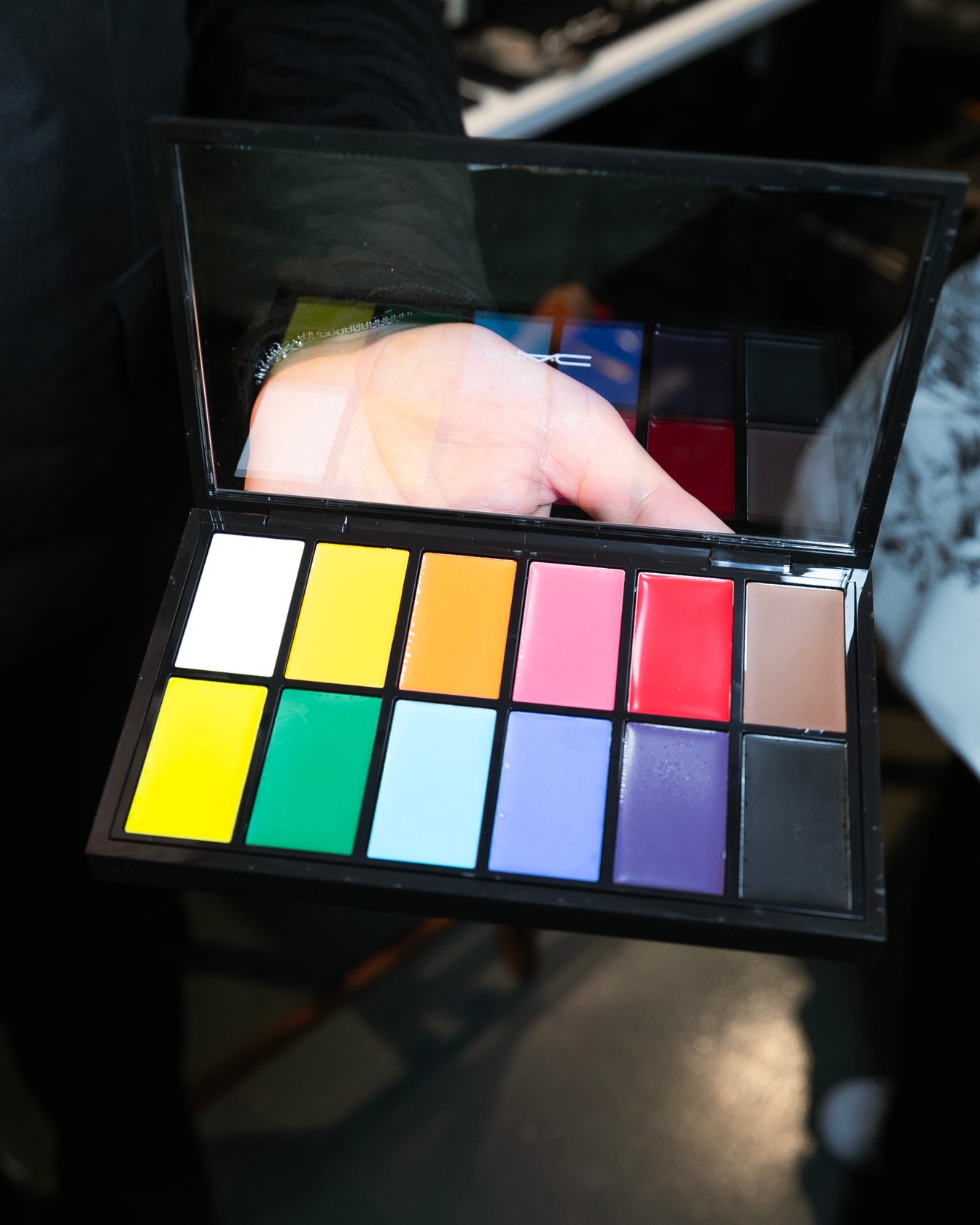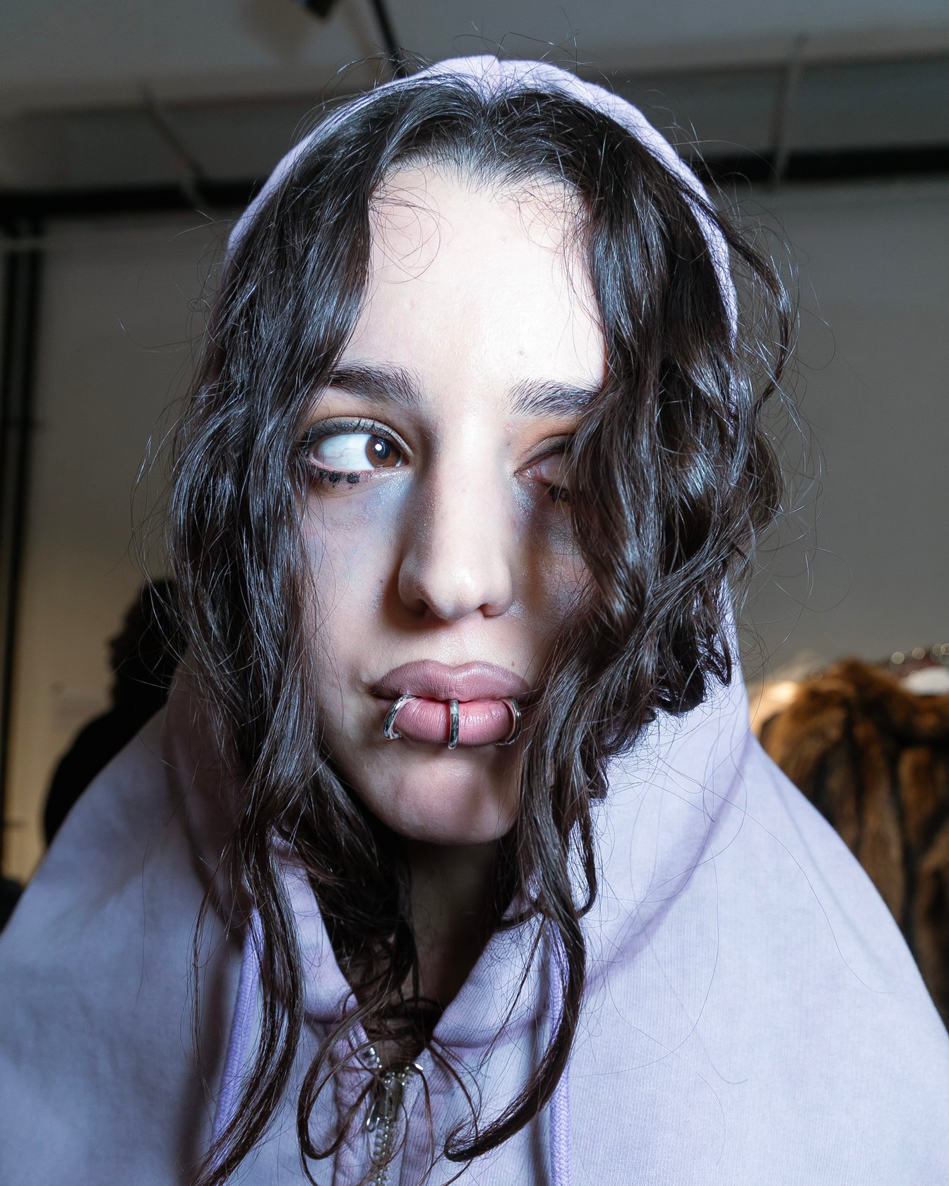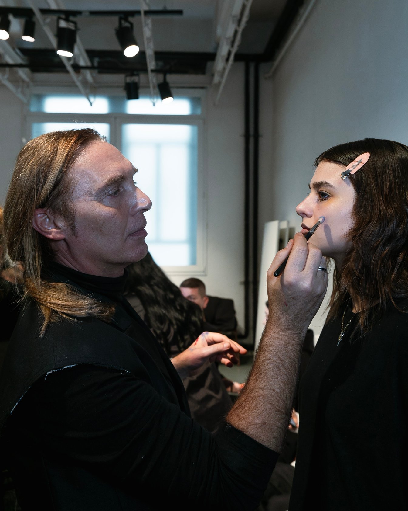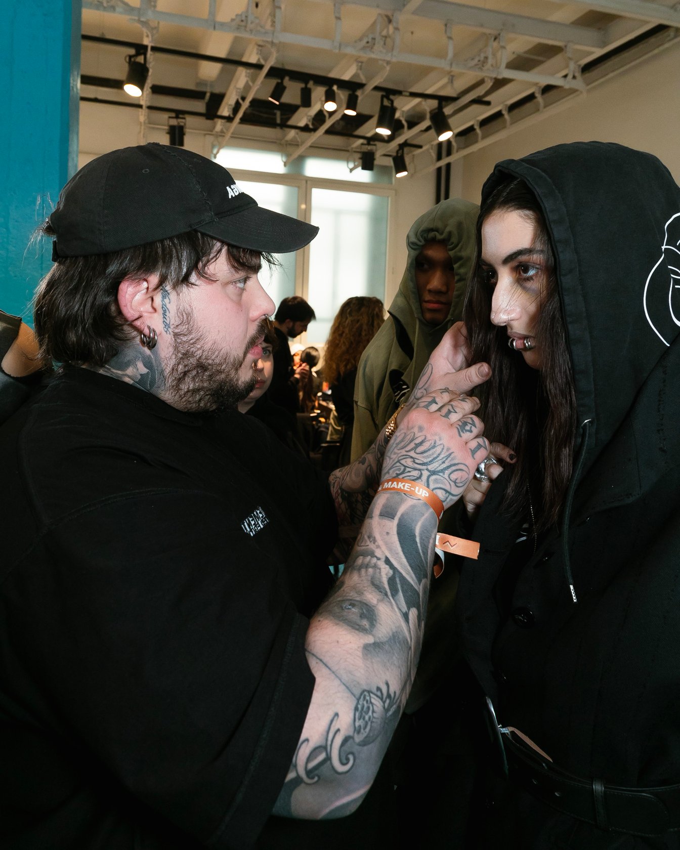 2024?25年秋冬シーズンのミラノ?ファッションウィークで話題を集めた「アヴァヴァヴ(AVAVAV)」。ベアテ?カールソン(Beate Karlsson)がクリエイティブディレクターを務め、毎シーズン前代未聞なショーで来場したプレスや観客だけでなく、SNSなどを通じて多くの人々を驚かせています。今シーズンはバナナの皮や紙クズといったごみやジュースなどが、観客席からランウェーを歩くモデルに次々と浴びせられるといった演出。これは「愛とヘイト」をテーマに、インターネット上の誹謗中傷に対する風刺を表現したというもので、ルックは中世の魔女狩りへの言及として、その時代をイメージする十字架のようなネクタイやテーラードスーツがスタイリングされていました。この“奇抜”なコレクションをメイクアップ「M·A·C(メイクアップ アート コスメティックス)」とヘア「ウェラ プロフェッショナル(WELLA PROFESSIONALS)」がサポート。ショー直前のバックステージで、それぞれのリードアーティスト、Michele Magnani氏とValentino Fai氏にメイクアップとヘアのポイントについて聞きました。