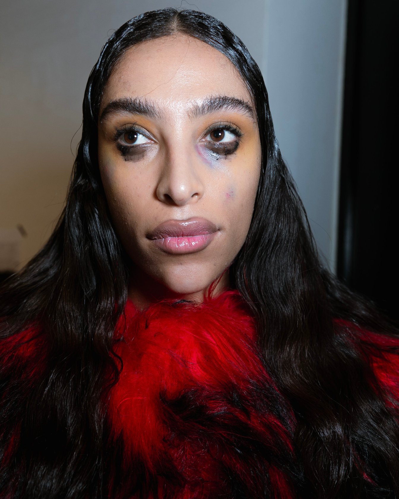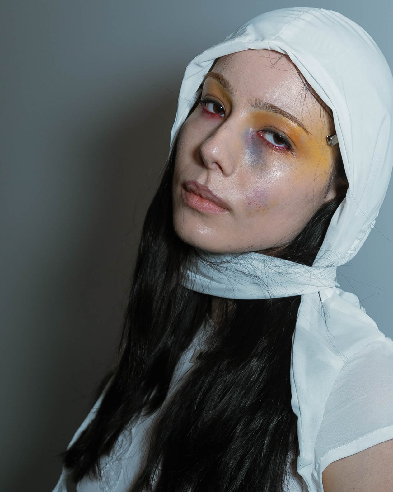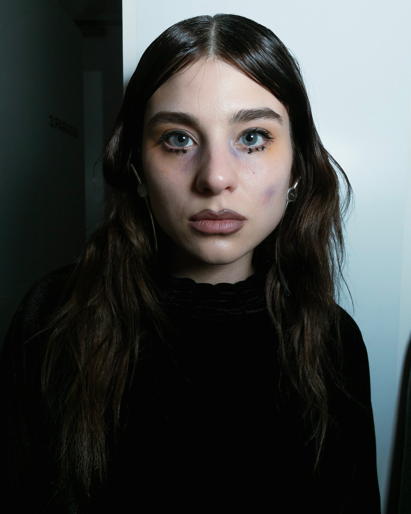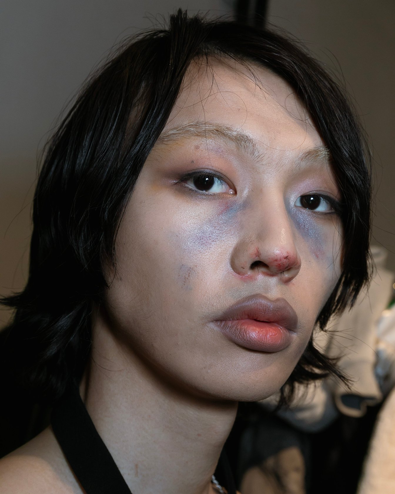 顔に傷やアザを作って、コレクションが問題定義する、言葉を含めSNSで誹謗中傷を受けた時の悲しみなどをリンクさせました。例えば、鼻の近くや目の周りにアザを、またマスカラが落ちたときに黒い涙や汗が流れたような表現や、目から血がにじみ出ているようなことでも表しました。