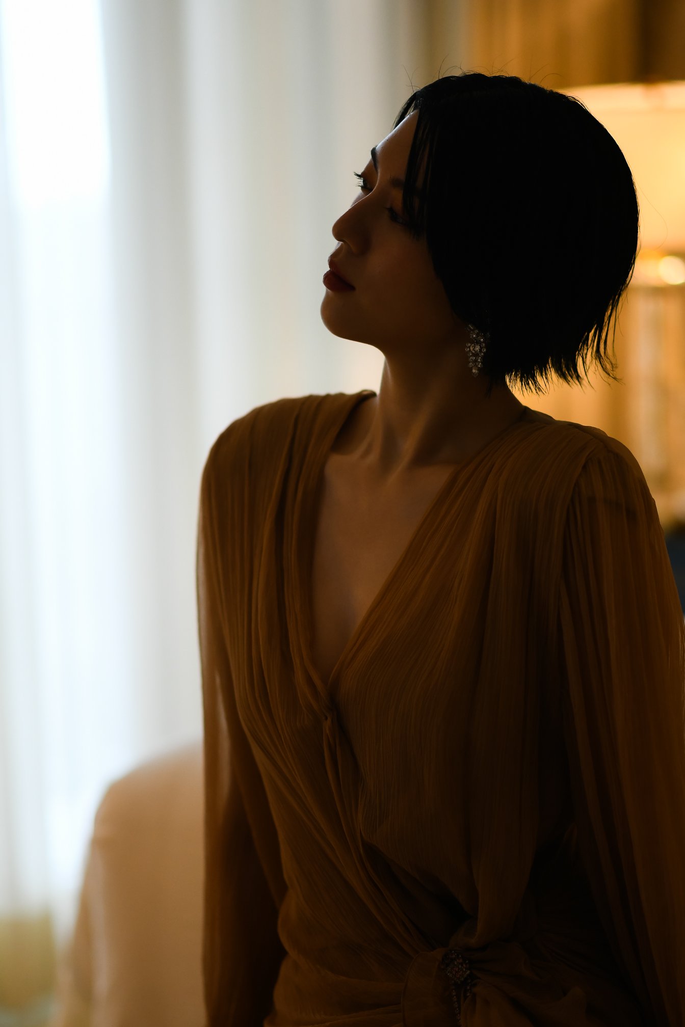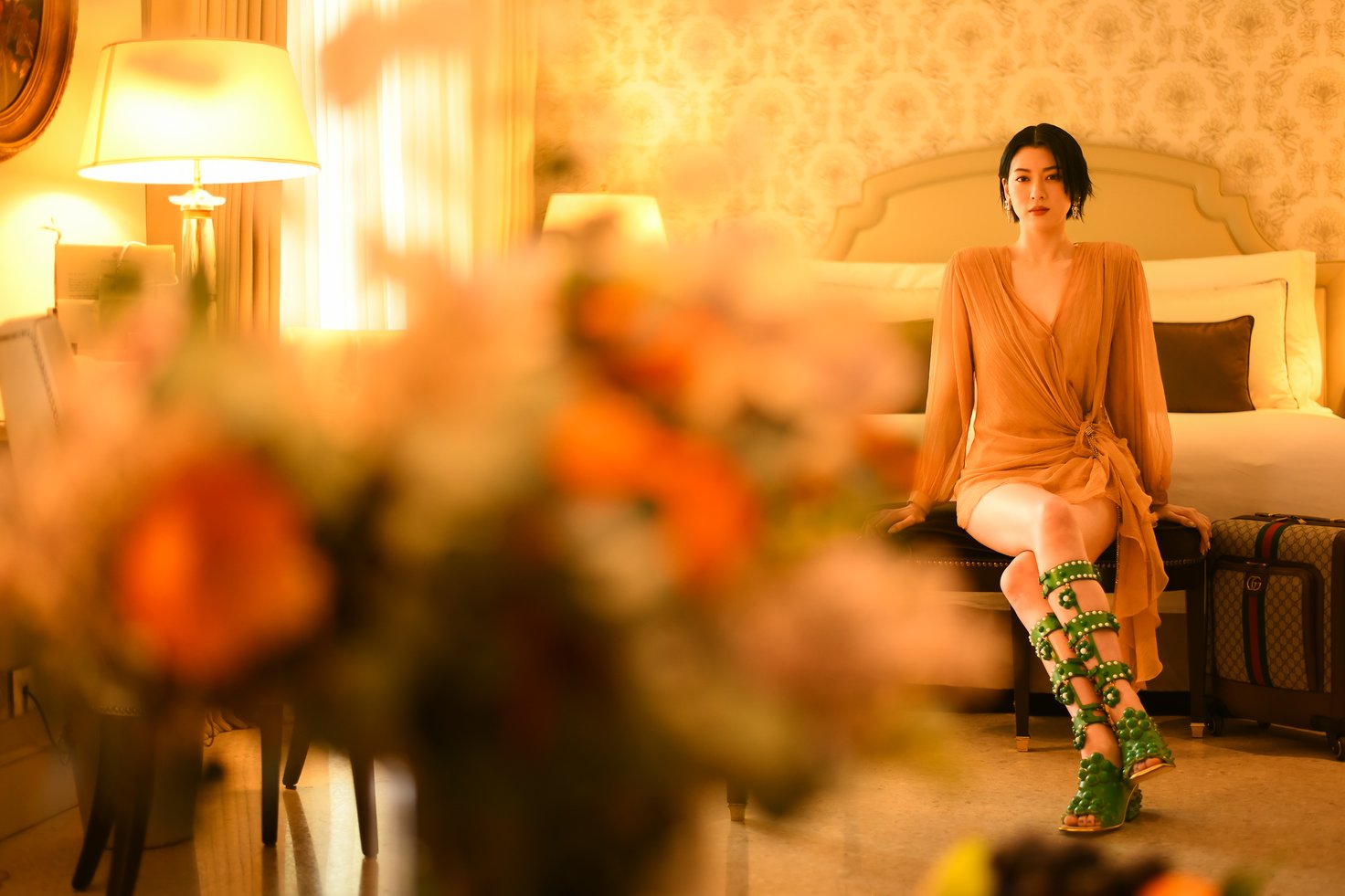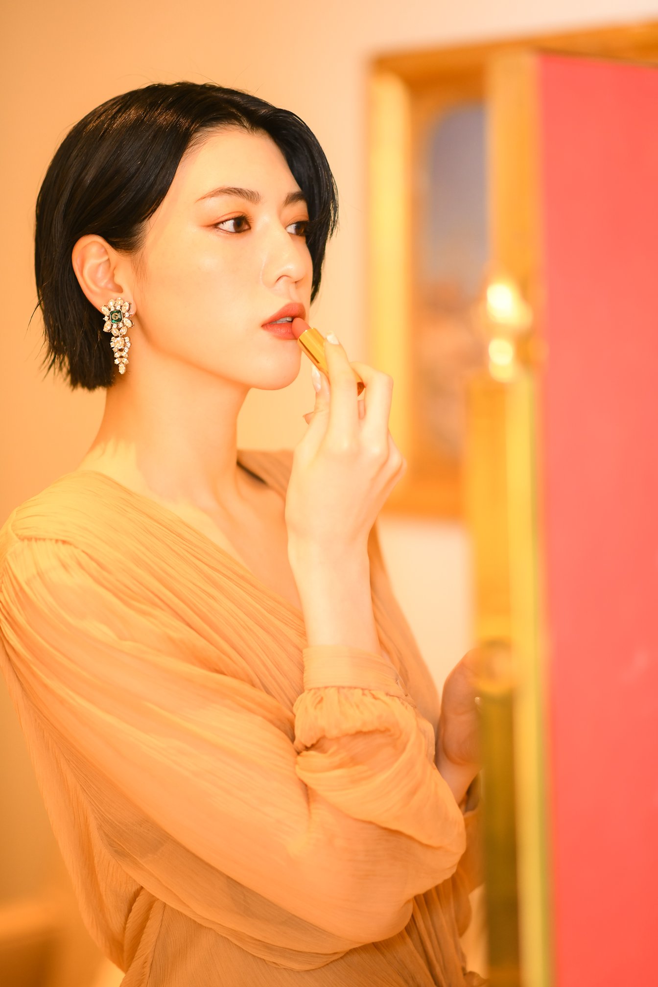 ? ショー本番当日の朝。メイクと衣装のフィッティングを終え、準備完了。グッチのリップ「ルージュ ア レーヴル」で最後のお直し。ショーに選んだ特別な一着は、軽やかなシルクシフォンが美しいドレープを生み出すヌーディなミニドレス。絶妙なヌーディーカラーとシフォンの繊細さが美しいドレスに、キャッチーなグリーンのグラディエーターサンダルと合わせ、見事に着こなしているのはさすがです。