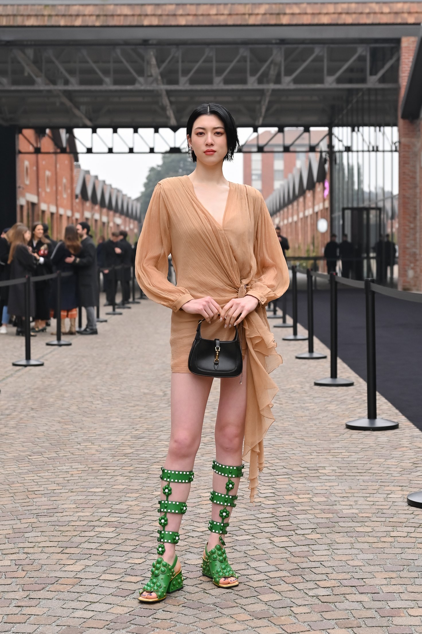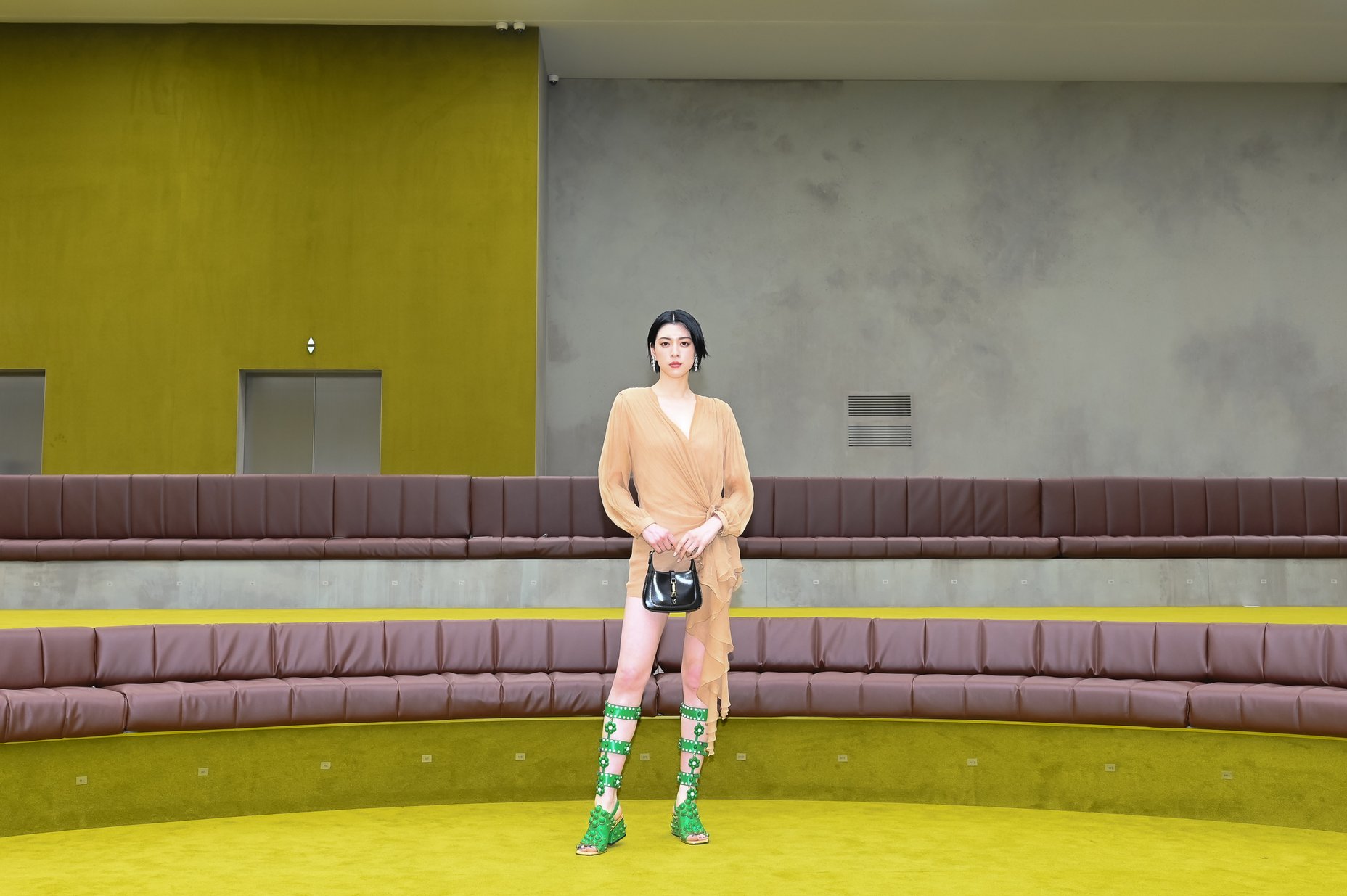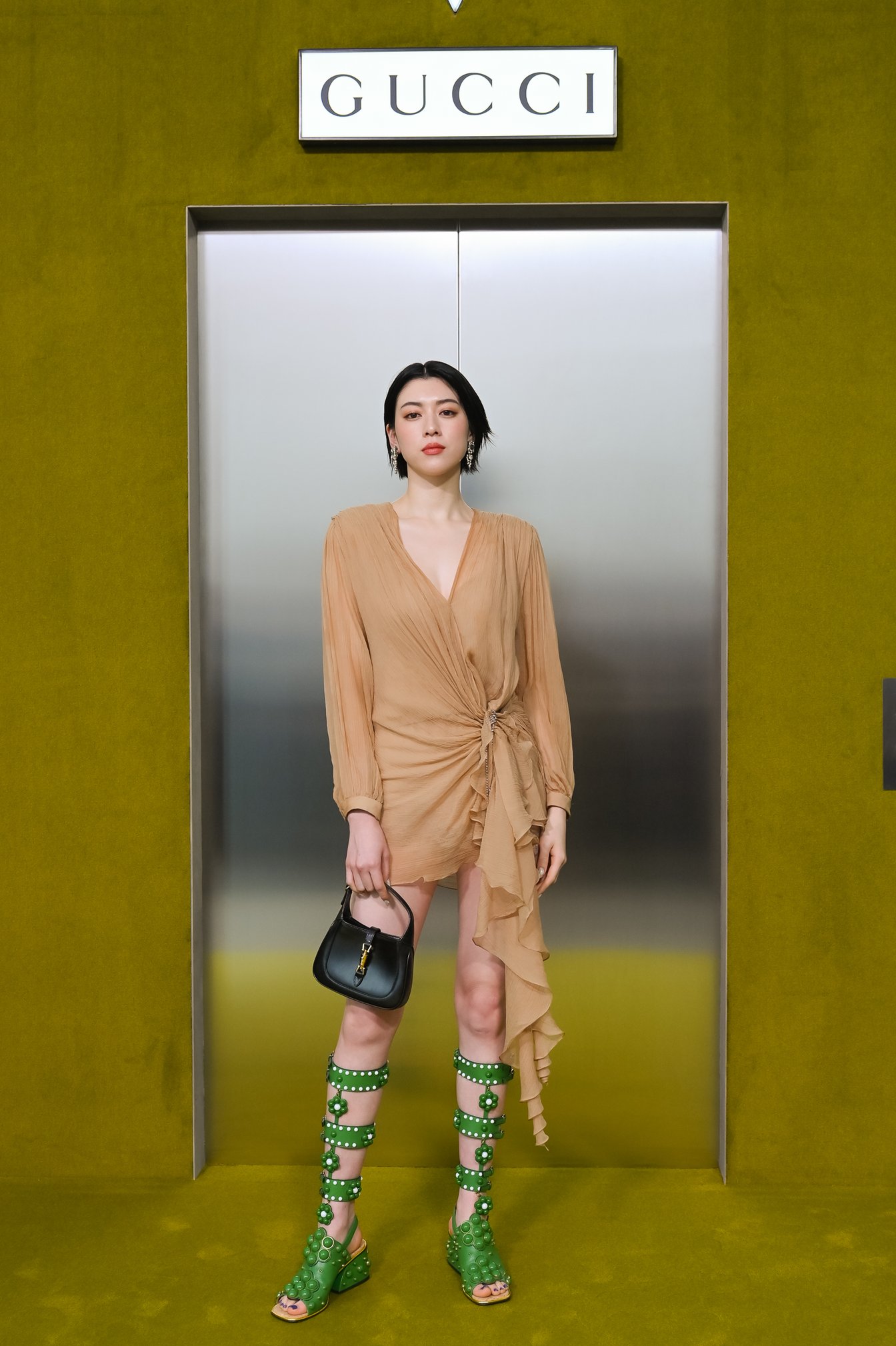 「グッチの服をまとうと、いつもと違う自分の一面を見たいなと思うし、見てもらいたいな、という気持ちにさせてくれます。今回のドレスは、鮮やかなグリーンのシューズと、柔らかなドレスのコントラストが好きで選びました」とコメント。ショーへの期待に胸を弾ませ、招待状とブラックの「ジャッキー 1961」ミニバッグを添えていざショー会場へ。