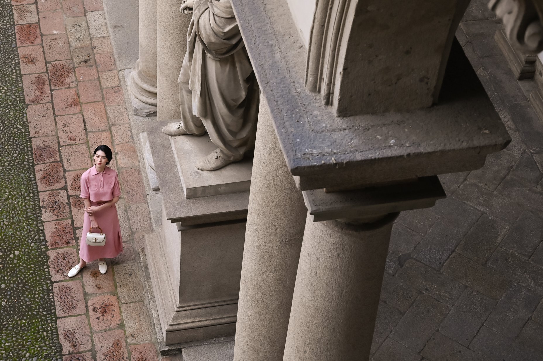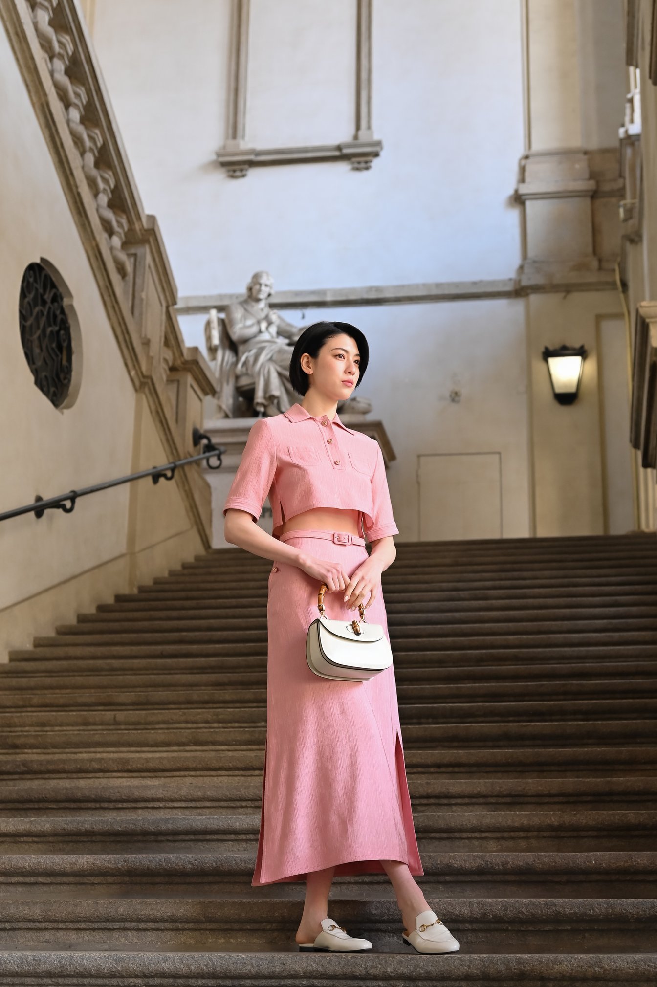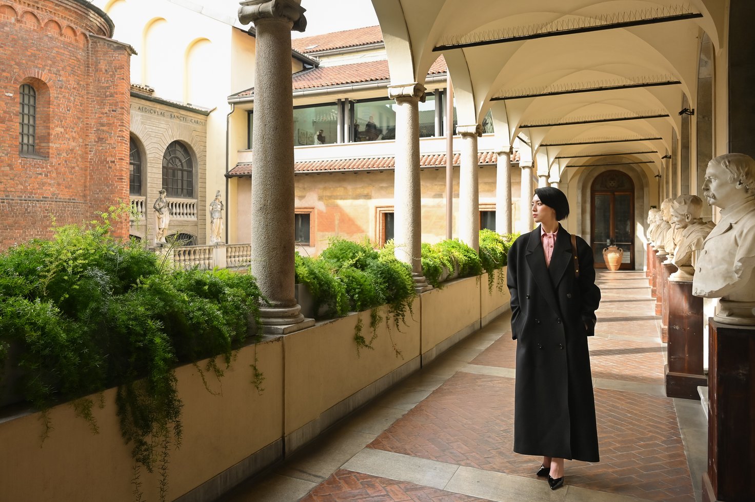 2日目の朝は、1800年初頭にナポレオンによって美術館として整備された、ブレラ絵画館からスタート。館内の「Caffè Fernanda」で朝食です。夢中になるほど美味しかったというサーモンとアボガドのトーストを頬張って1日の始まりにお腹を満たします。イタリア人の朝には欠かせないエスプレッソももちろんオーダー。ミラノの朝のひと時を満喫します。ルネサンス様式の美しい建物を背景に、朝の日差しを浴びてシューティング。ピンクのセットアップとホワイトの「グッチ バンブー?1947」が荘厳な雰囲気にもマッチします。