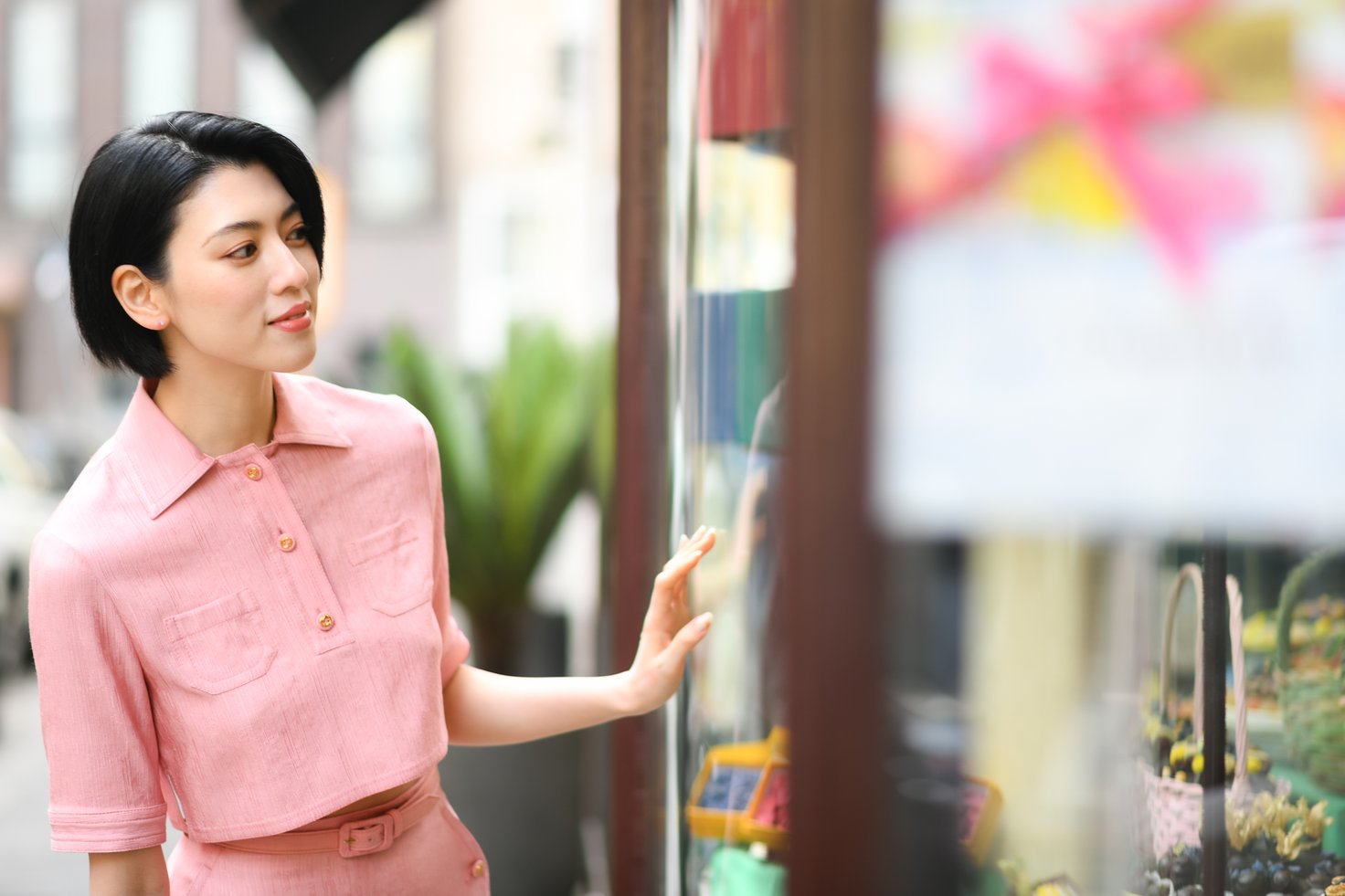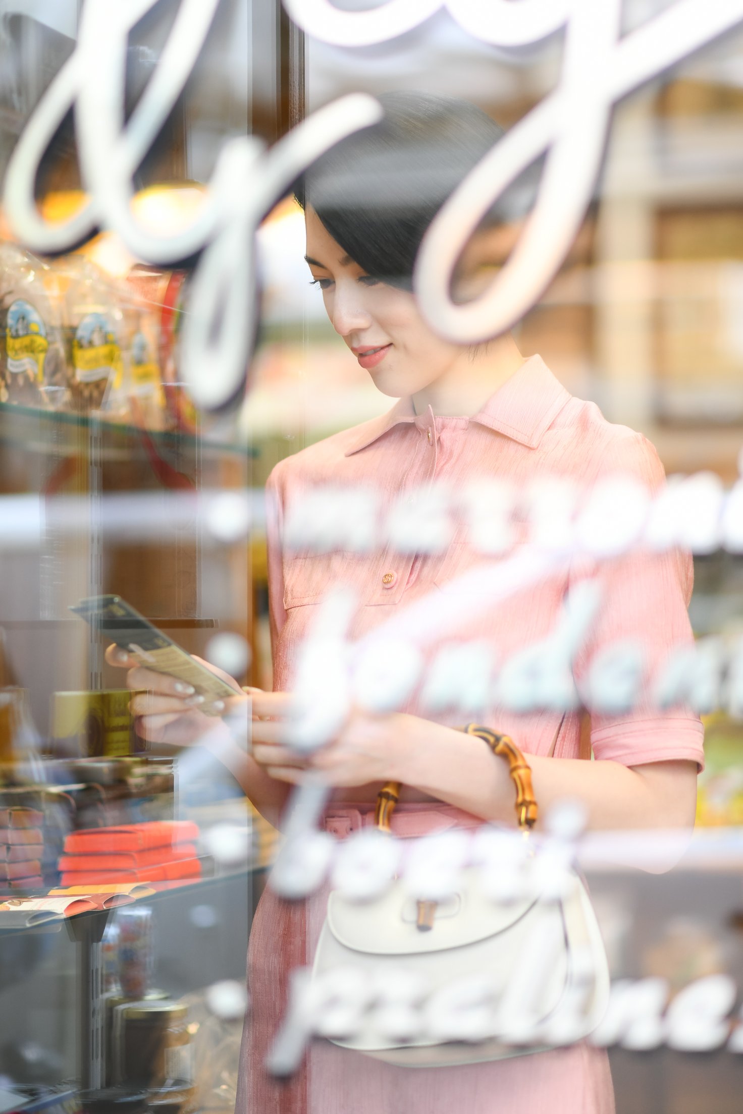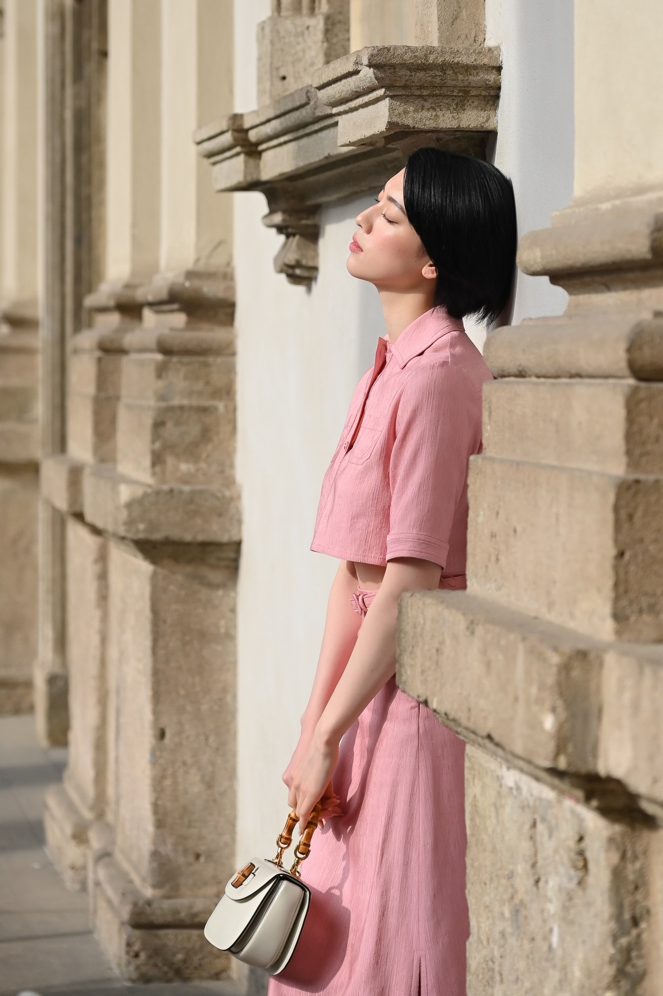 2日目の朝は、1800年初頭にナポレオンによって美術館として整備された、ブレラ絵画館からスタート。館内の「Caffè Fernanda」で朝食です。夢中になるほど美味しかったというサーモンとアボガドのトーストを頬張って1日の始まりにお腹を満たします。イタリア人の朝には欠かせないエスプレッソももちろんオーダー。ミラノの朝のひと時を満喫します。ルネサンス様式の美しい建物を背景に、朝の日差しを浴びてシューティング。ピンクのセットアップとホワイトの「グッチ バンブー?1947」が荘厳な雰囲気にもマッチします。