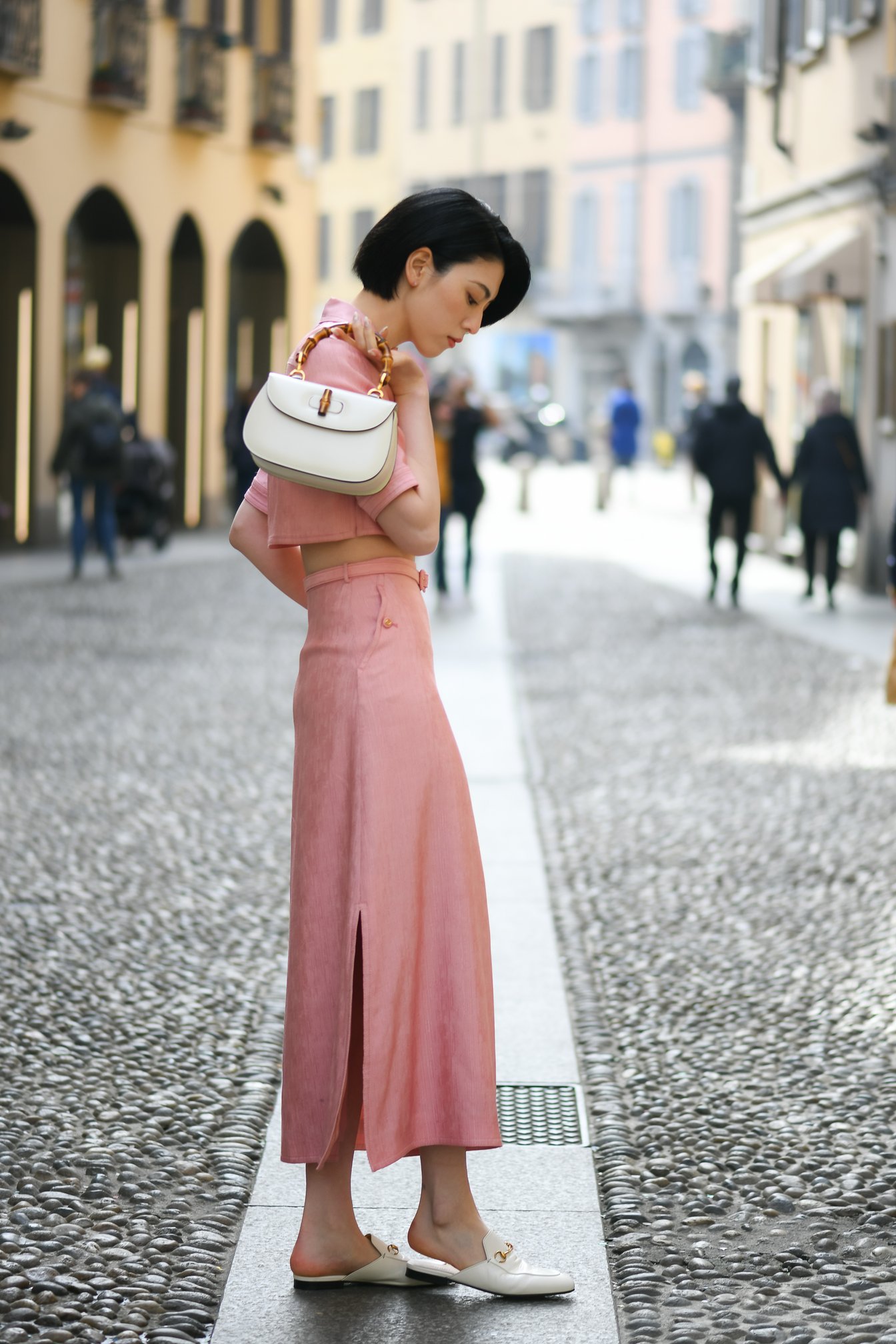 トップス ?165,000、スカート ?324,500、バッグ “グッチ バンブー 1947” ?495,000、シューズ ?113,300(すべて税込)