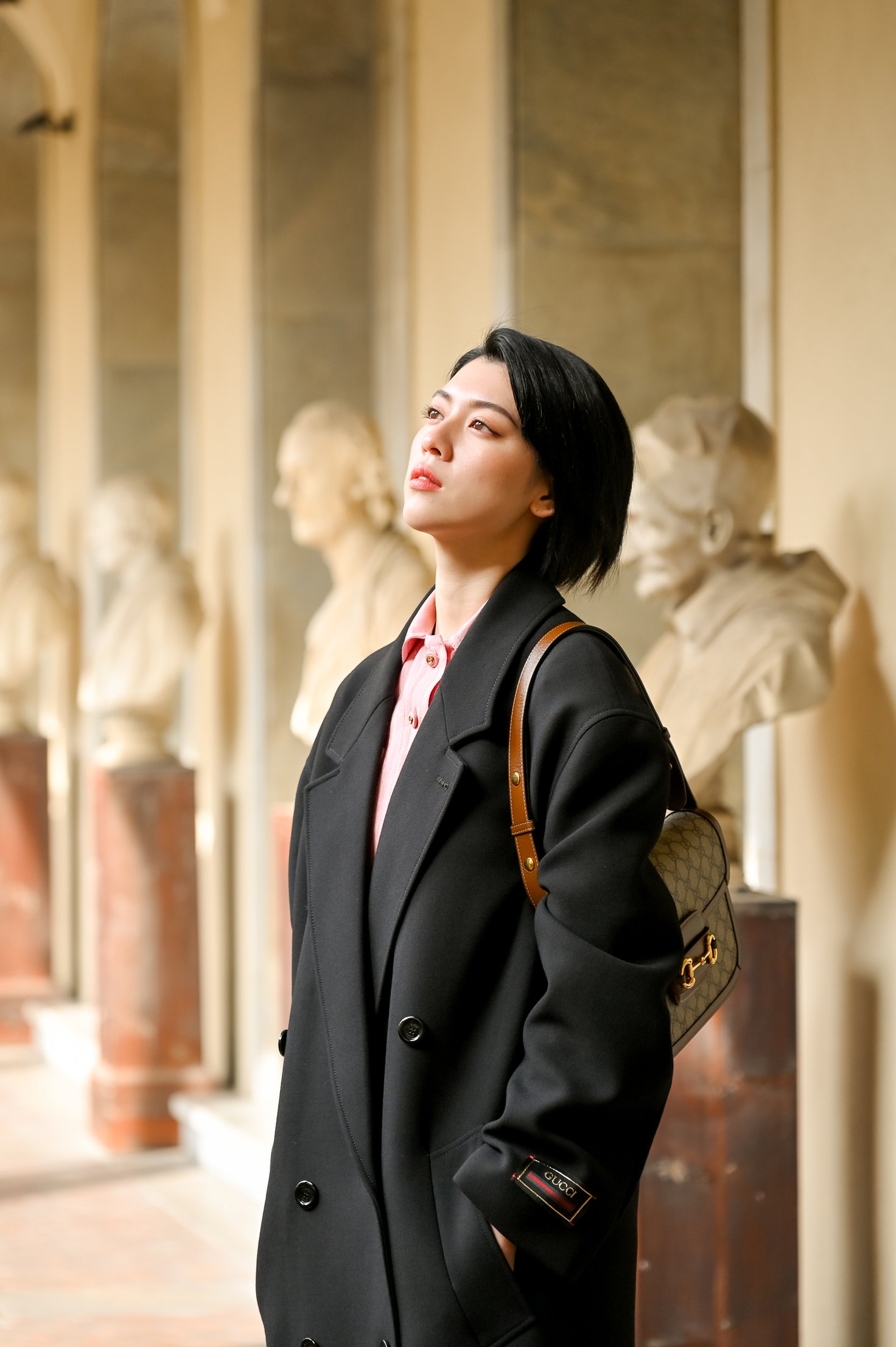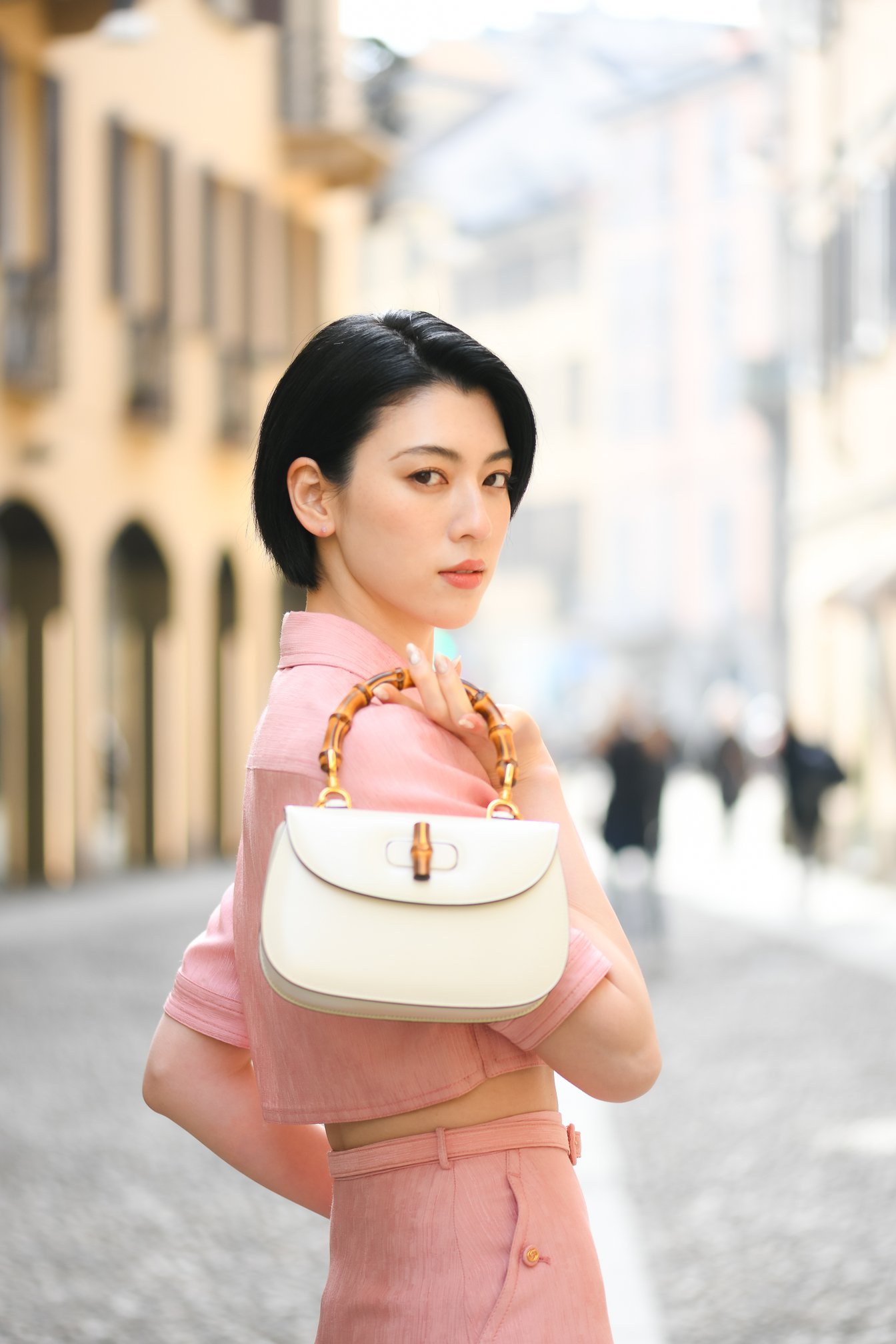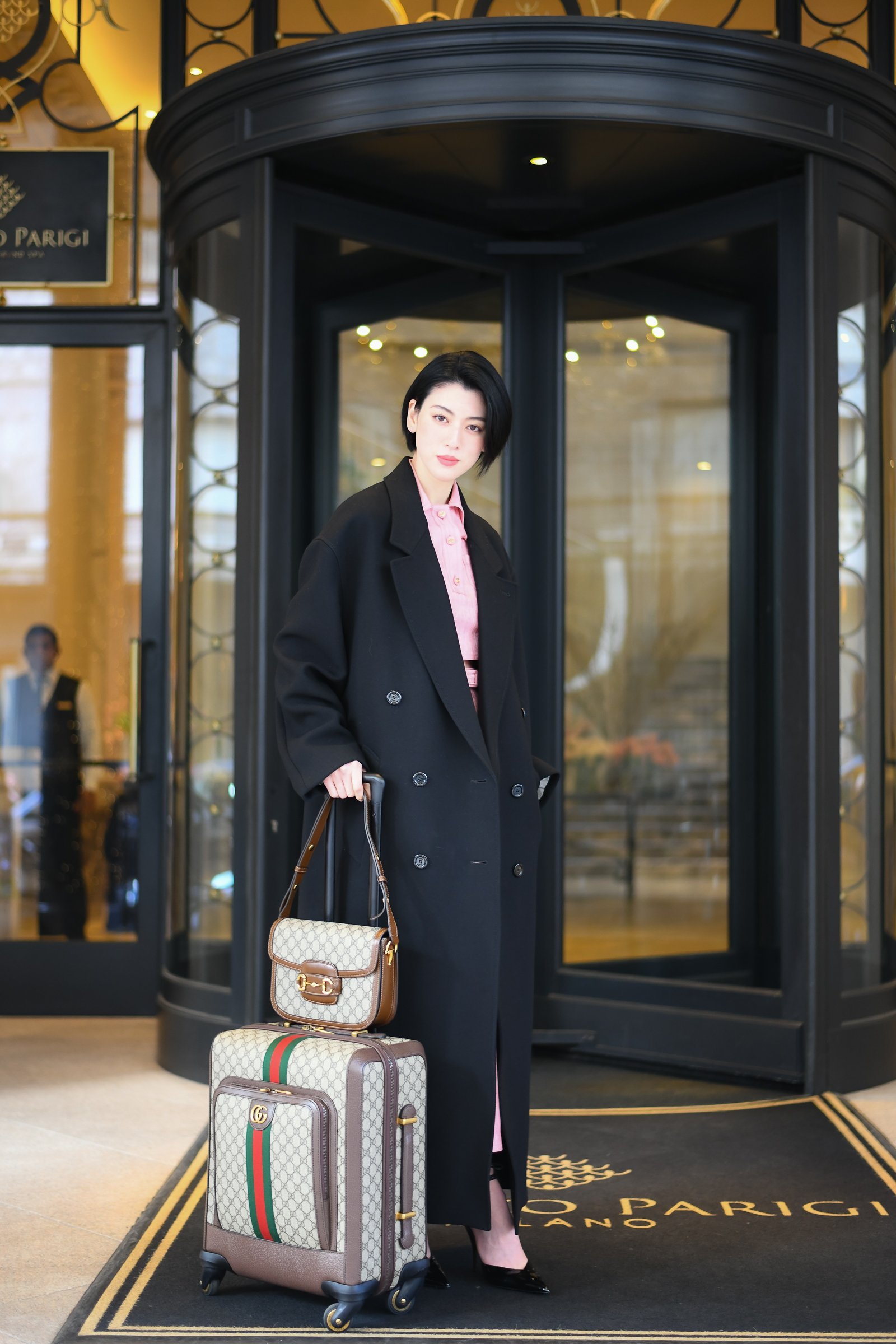 ミラノでの滞在を振り返り、「ミラノは初めててではなかったのですが、また少し違った印象でした。ショーも素晴らしかったですし、こんなに海外のファンの方と触れ合ったのも久しぶりで、懐かしいような嬉しいようなあたたかい気持ちになりました」と三吉さん。ショーでの体験を活力に、次なる目的地へと向かいます。旅のお供は「グッチ サヴォイ」のトロリーバッグと「グッチ ホースビット 1955」のハンドバッグで。