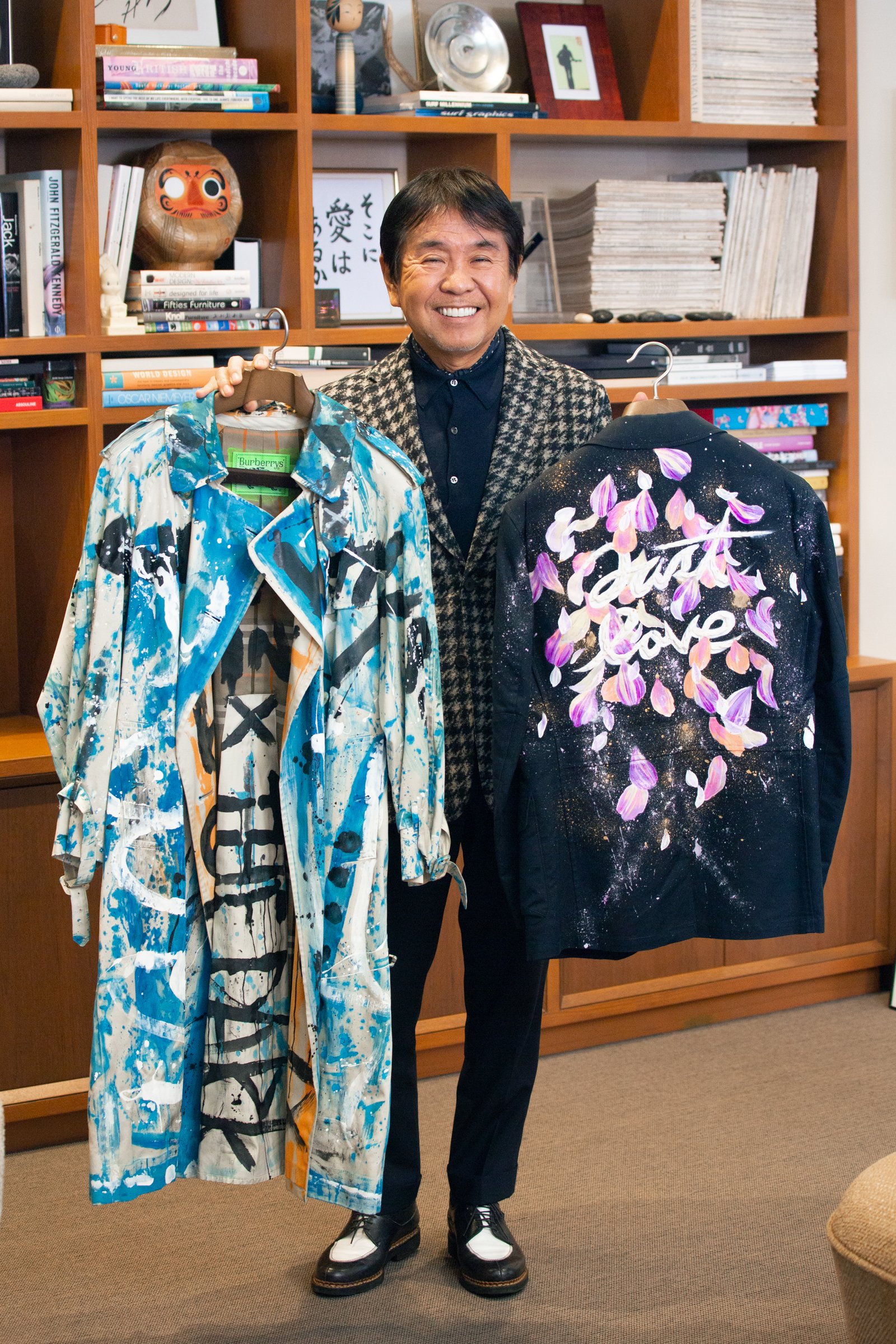 (左)バーバリーのトレンチコートにカタヤマケンジが手を加えたもの。 (右)過去にビームスが手がけたジャケットに澤田友美のアートを組み合わせた。 自身が実験として作ったリメイク品は、社員に見せて率直な感想を聞くそう。