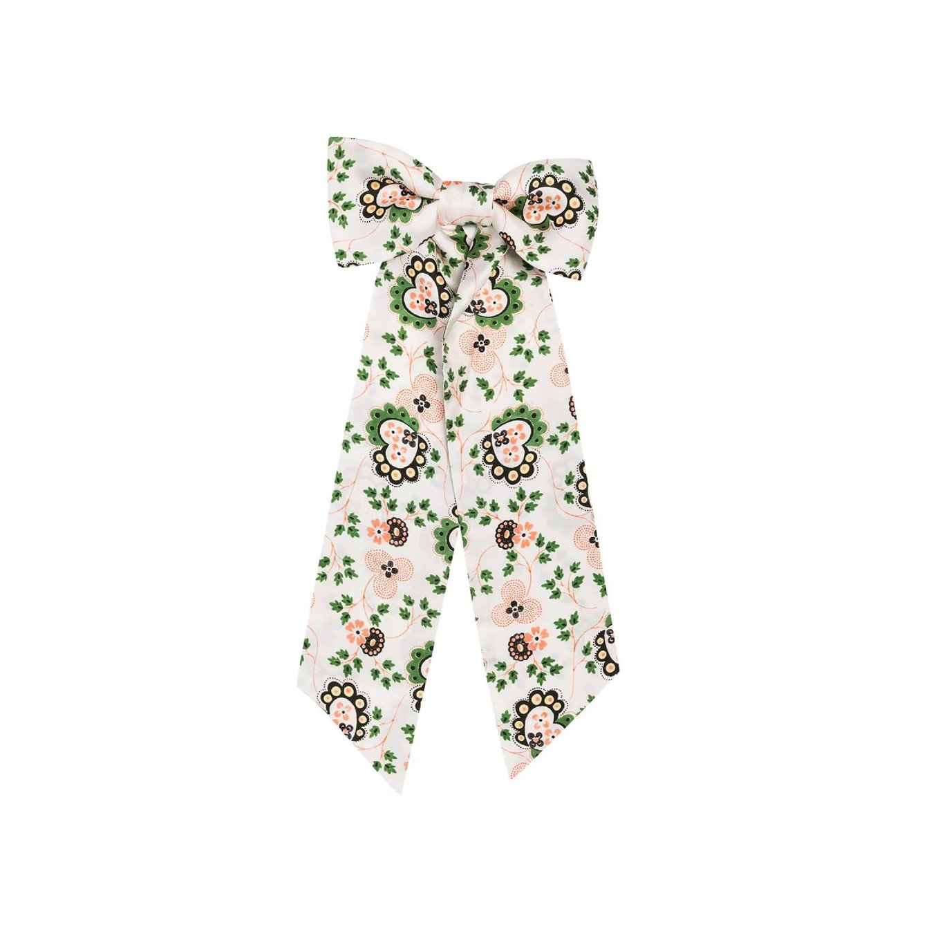 グリーンとピンクのハート、フラワー、リーフが散りばめられた、ザ?乙女な「シュリンプス(Shrimps)」のヘアリボン。バレッタで留めるタイプなので、瞬時にリボンスタイルが完成します。あえてカジュアルコーデとあわせてギャップを楽しむのもアリ。