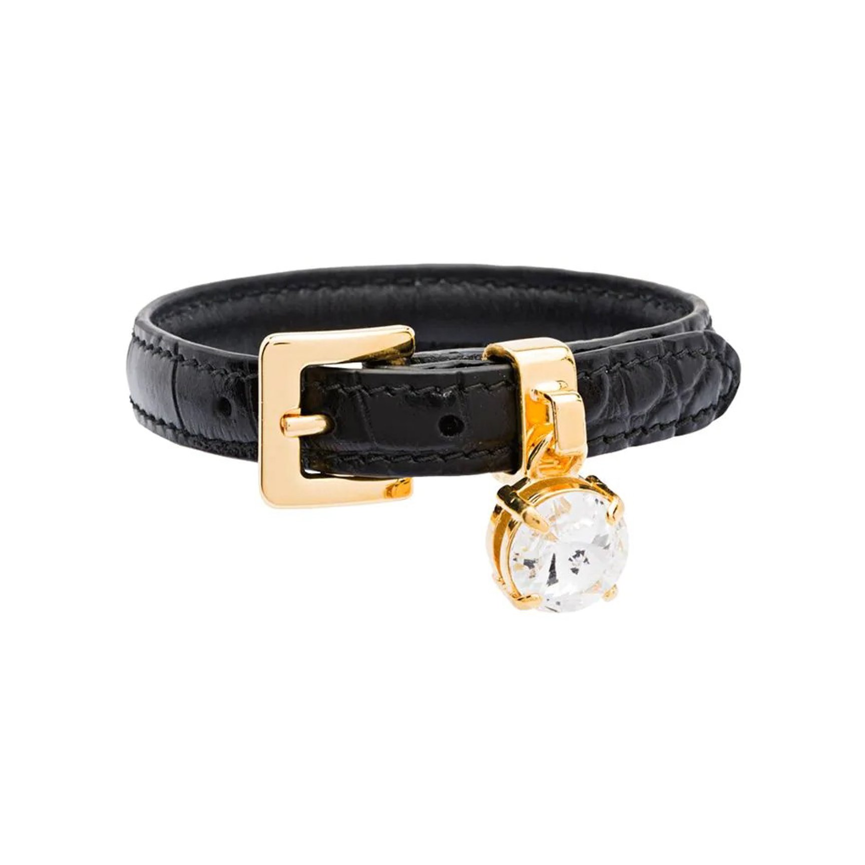 最後にご紹介するのは、可憐に揺れるクリスタルが輝く「ミュウミュウ(MIU MIU)」のレザーブレスレット。艶やかなパテントカーフレザーに施された、クロコダイルプリントが大人の余裕ある優雅さを演出します。レディーなバックルデザインに煌めくチャームで、日常からパーティーシーンまで視線を集中させてみてはいかが?