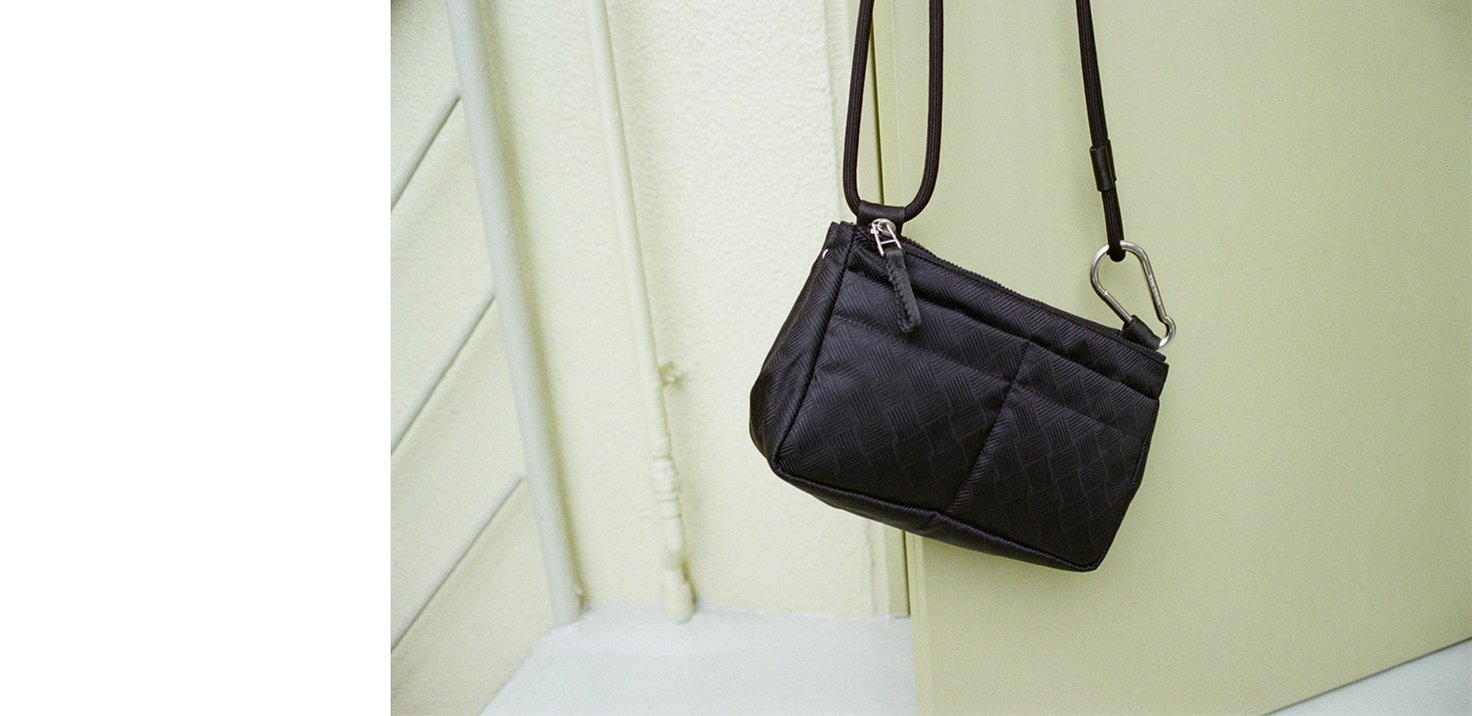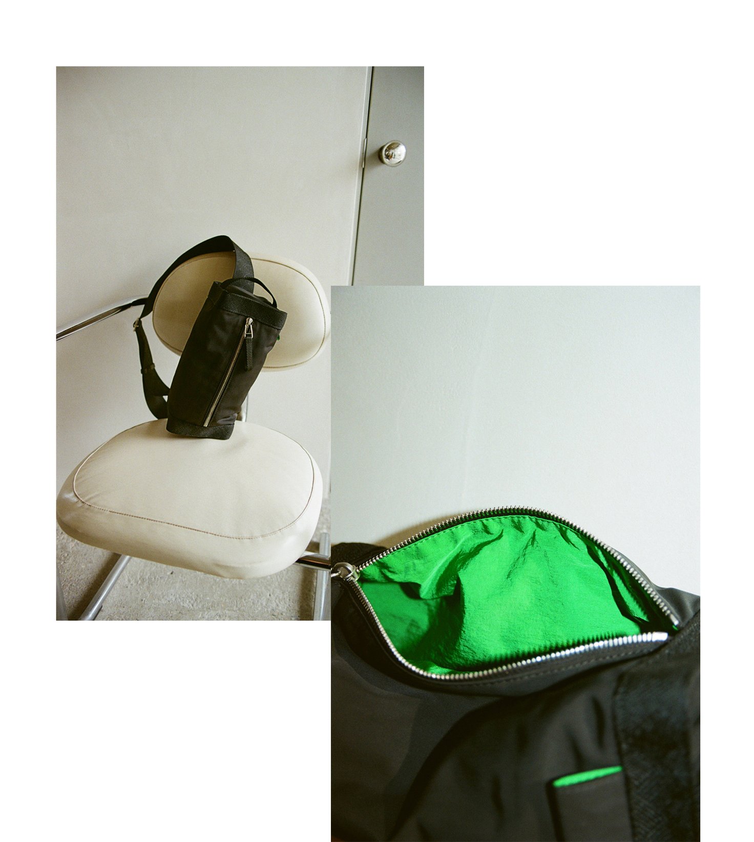 テクニカルファブリックをベースに内側のパラキートグリーンが主張するボイジャー スリングバッグ(ブラック)(H28×W12×D12cm)17万500円