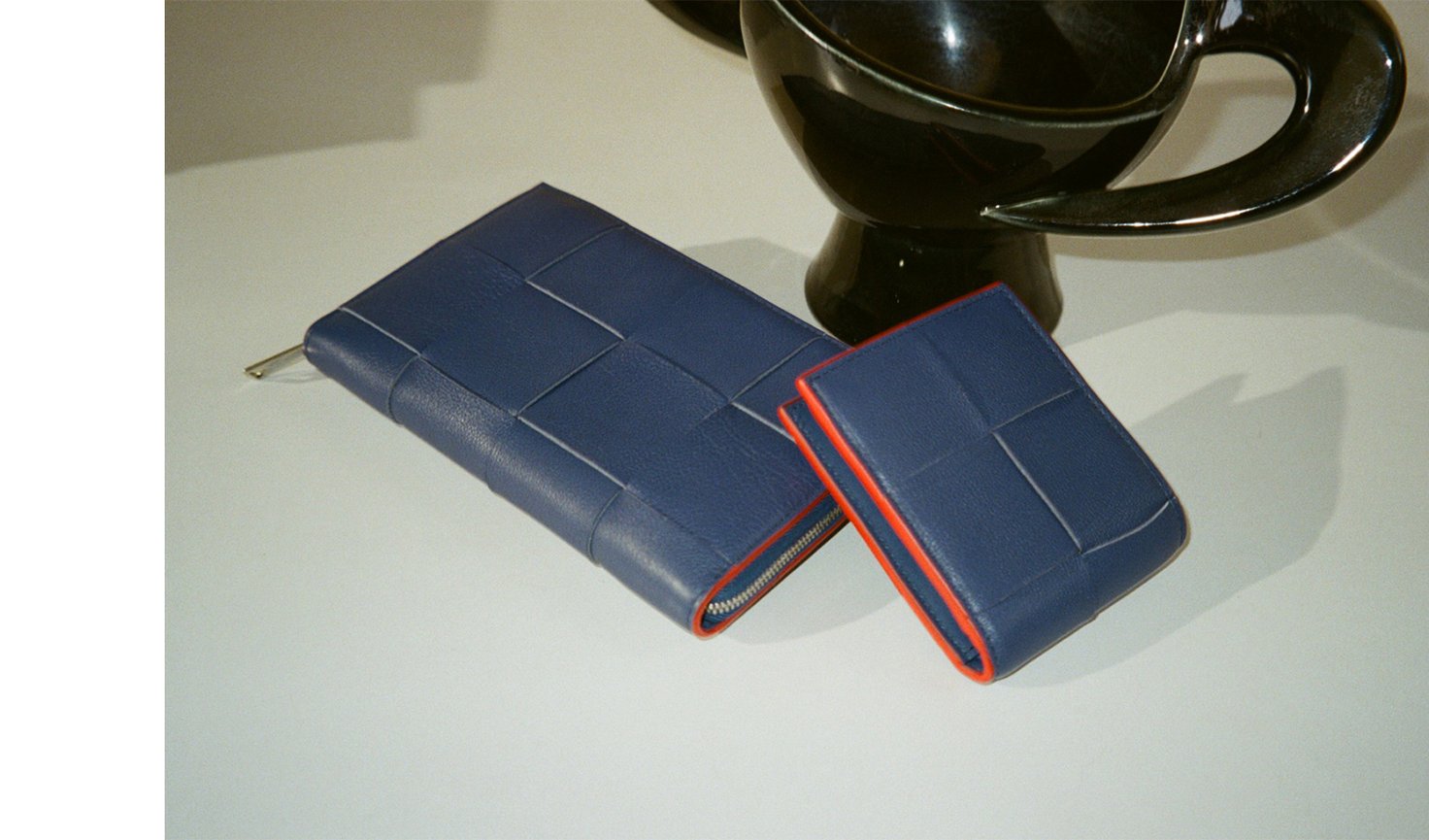 (奥)リムのアクセントカラーが目を引くカセット ジップアラウンドウォレット(クルーズ/レッドストーントリム)(H11.4×W19×D2cm)13万2000円、(手前)二つ折りウォレット(クルーズ/レッドストーントリム)(H8.5×W10×D1cm)8万2500円(※共に日本限定色)