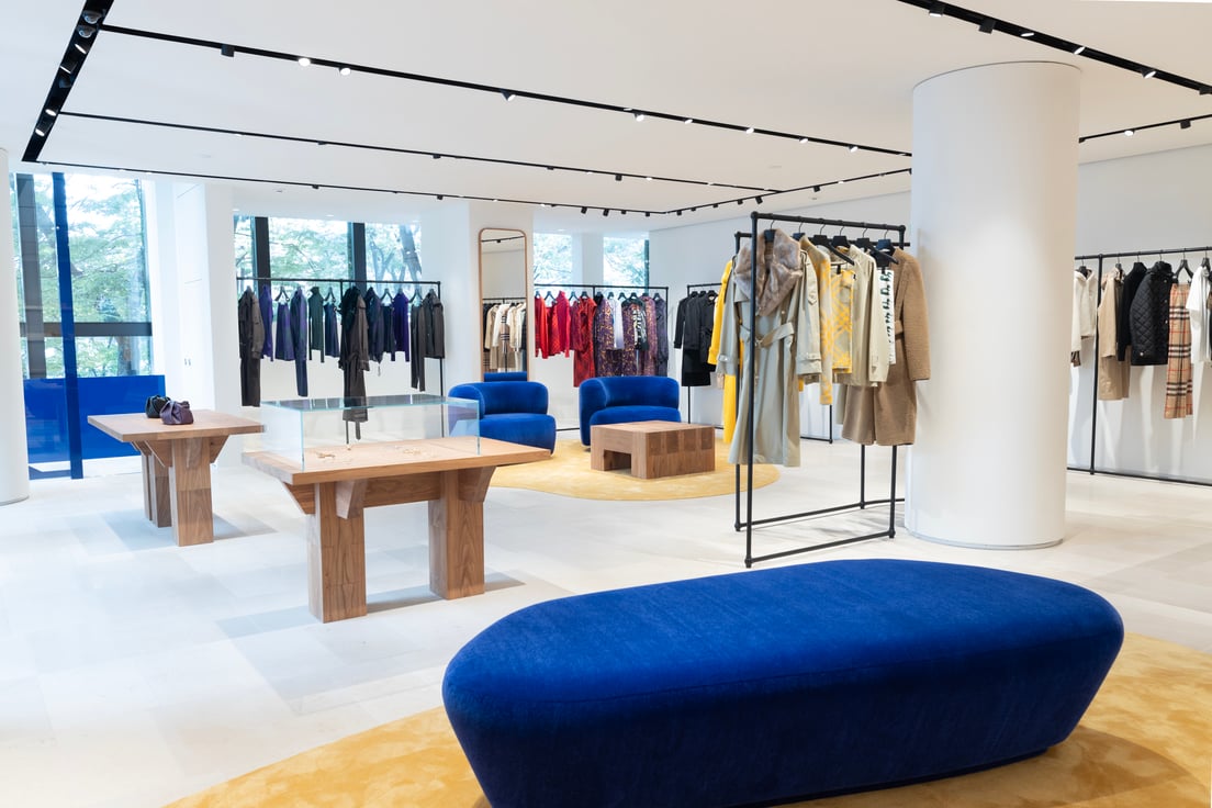 2階はウィメンズ、3階はメンズのフロアとなり、今年2月にロンドンで発表されたダニエル?リーによるデビューコレクションが並ぶ。ダニエルのこだわりが注がれた素材やシルエットにアップデートされたトレンチコートをはじめ、エンブレムをあしらったアウター、モダンに刷新されたチェック柄のニットやスカート、レインブーツやジュエリーなど、注目のコレクションを豊富に取り扱う。