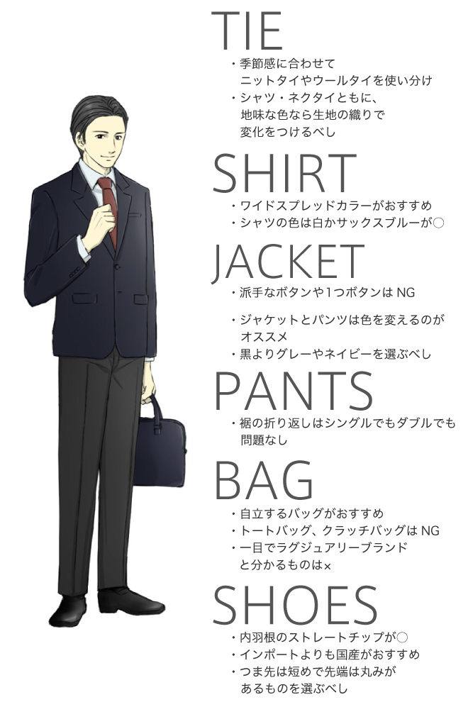新入社員が目指すべきファッション像をもとに、スーツ、シャツ、ネクタイ、靴、そしてバッグの選び方を見てきました。そのポイントをおさえたコーディネートが下記のようなイメージになります。