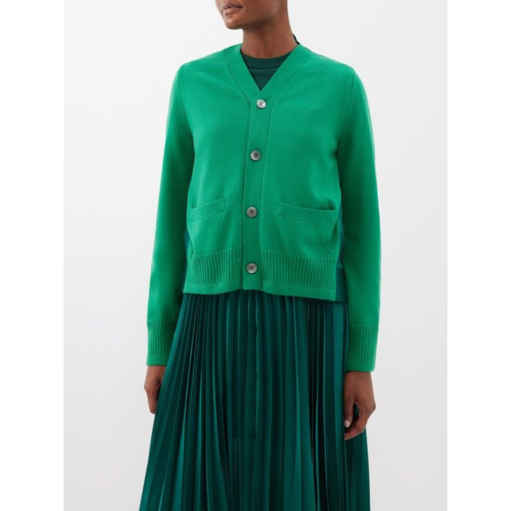 sacai Pleated satin-panelled wool cardigan ?93,500(関税?消費税込)