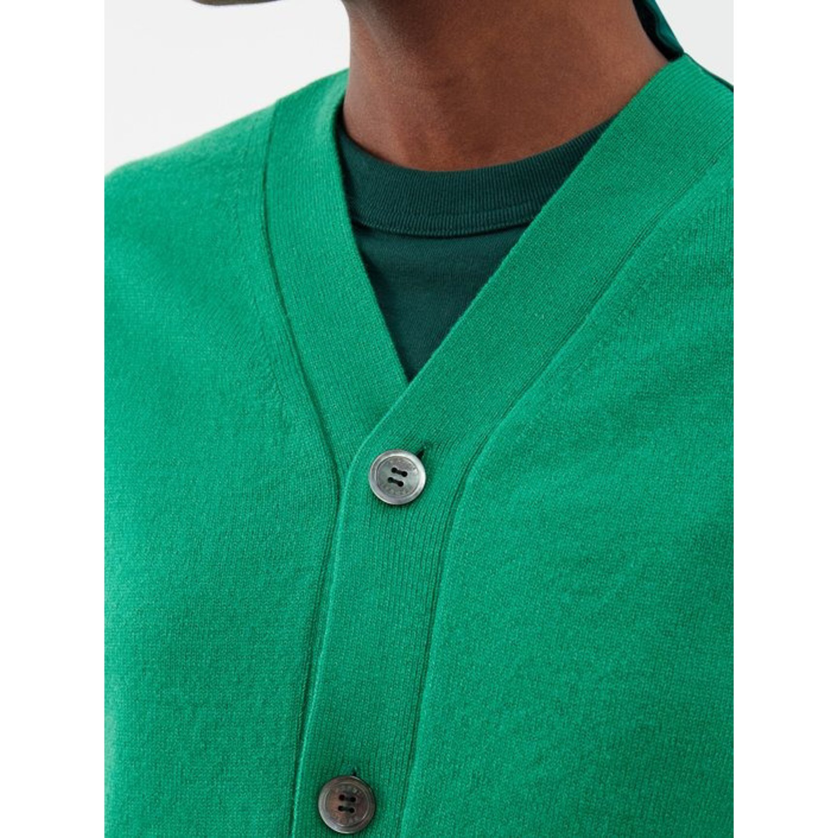 複数の糸を組み合わせて、立体的なライトグリーンを作り出した「アクネ ストゥディオズ(Acne Studios)」のカーディガン。優しい色合いながら、装いに奥行きをもたらしてくれます。