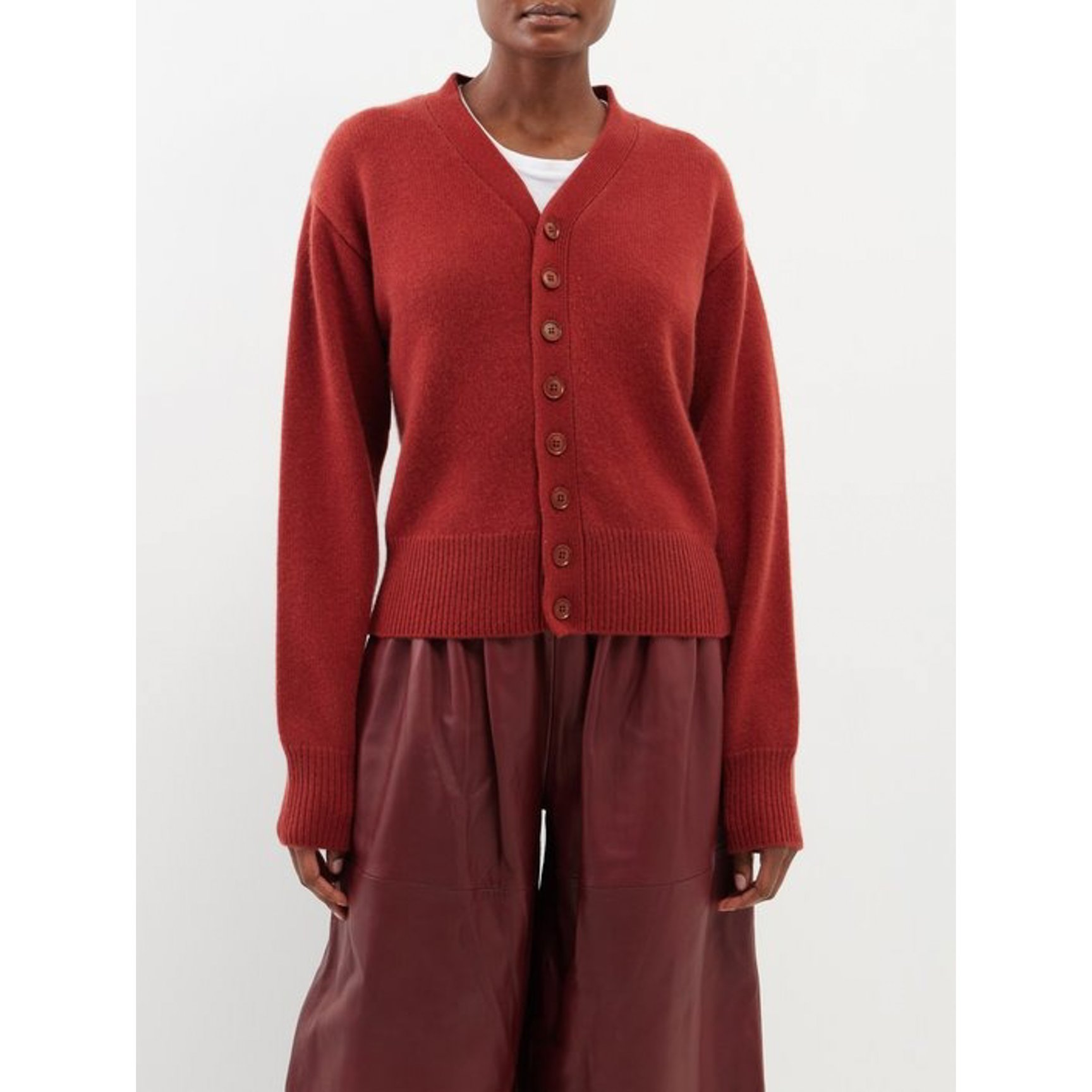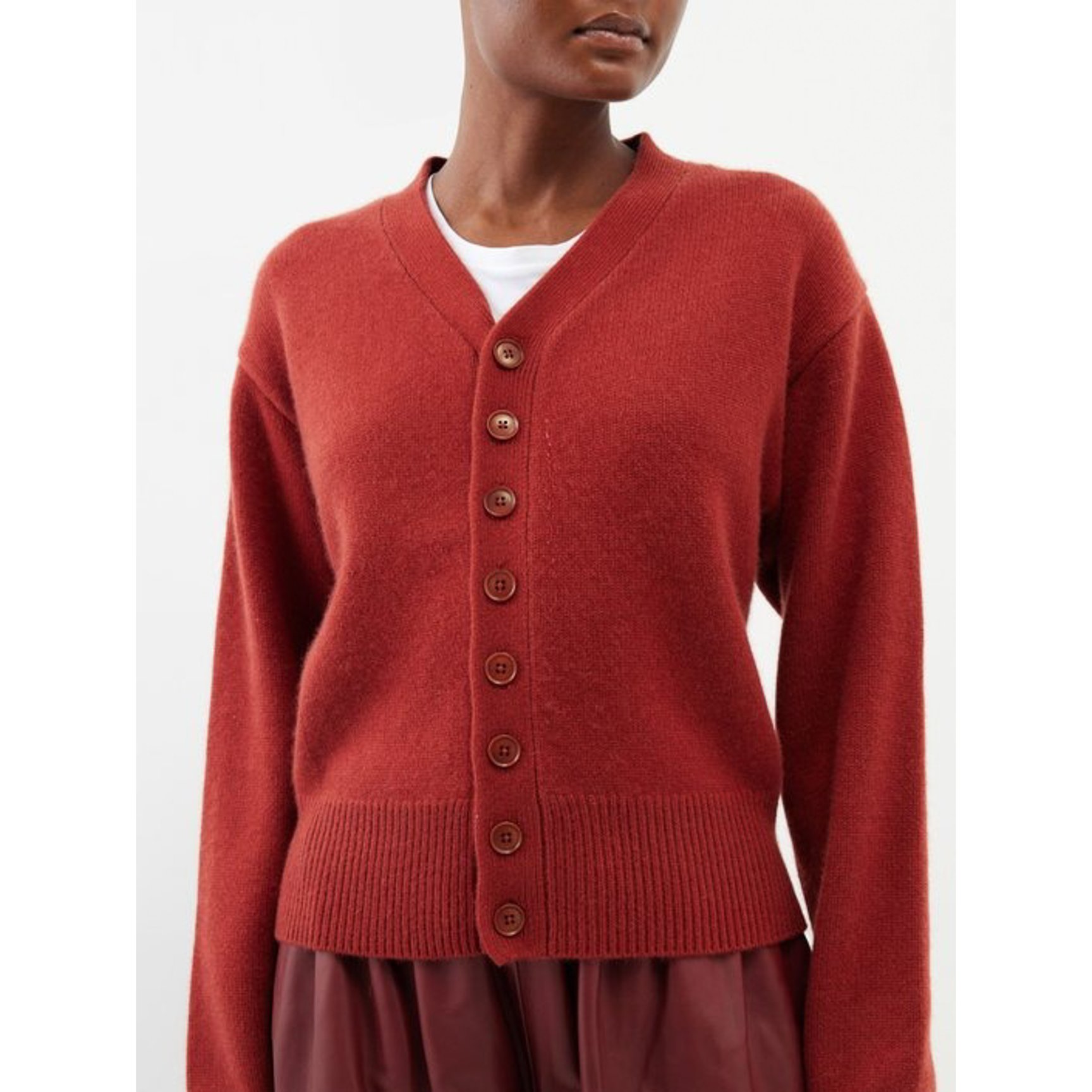 「エクストリーム?カシミア(EXTREME CASHMERE)」のカーディガンは、柔らかいモンゴル産カシミアを贅沢に使用したもの。深みのある赤の色合いが、クラシックな彩りを与えてくれます。
