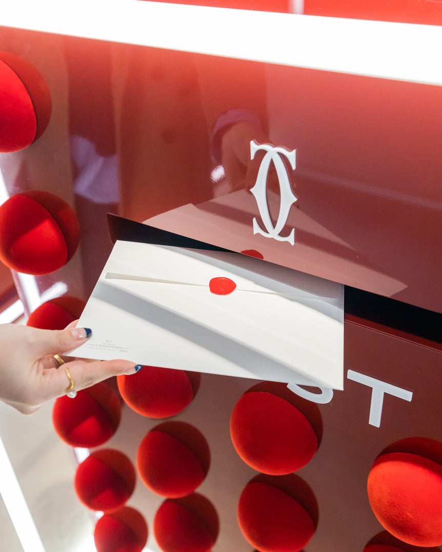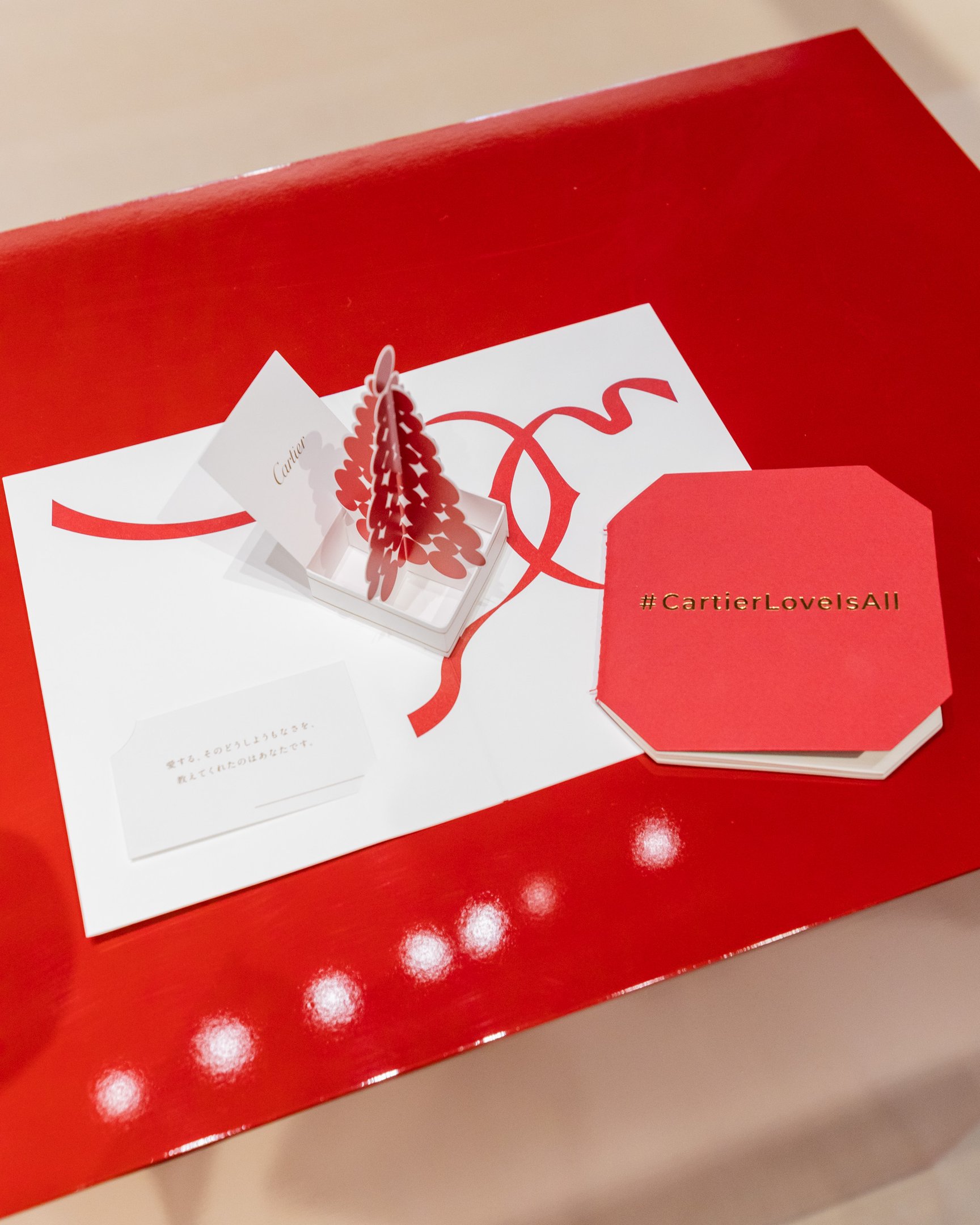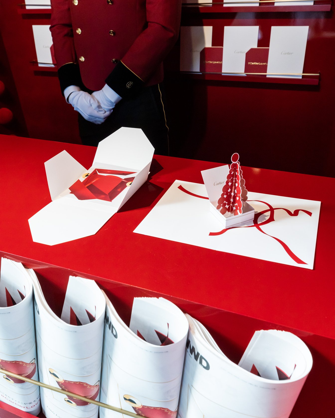 メゾンの象徴的な赤のキオスクではページボーイがゲストをお出迎え。オリジナルのメッセージカードが用意され、開くとツリーが現れる立体的なポップアップタイプとフラットなスクエアタイプの2種からどちらかを選んで中へと進んでいきます。