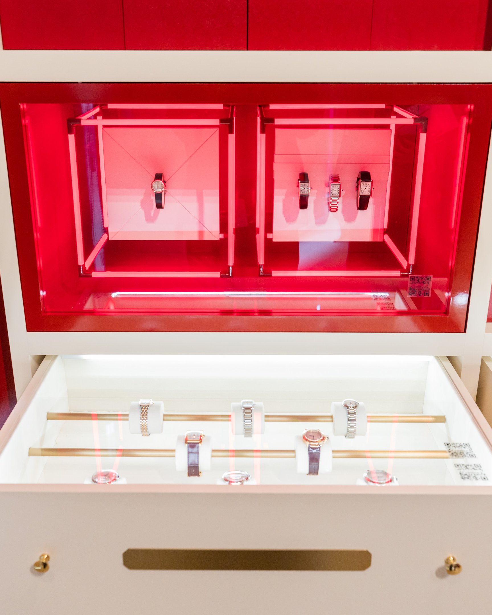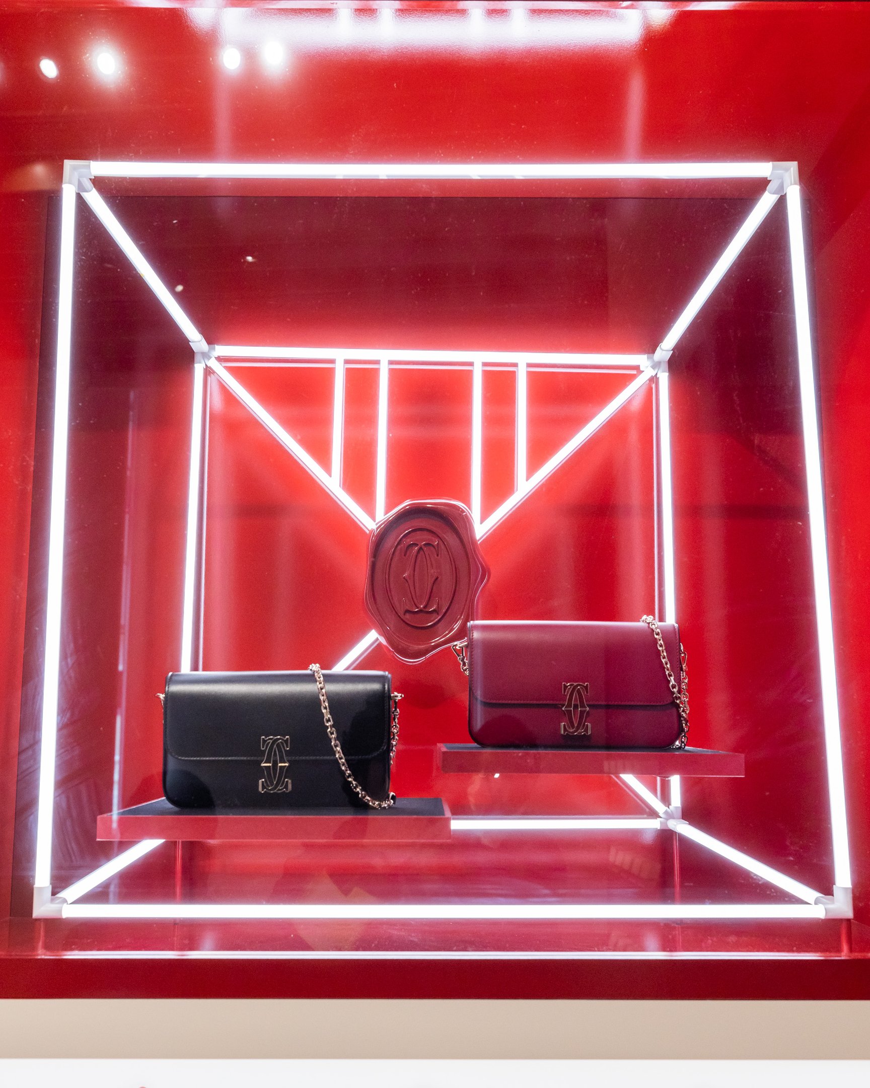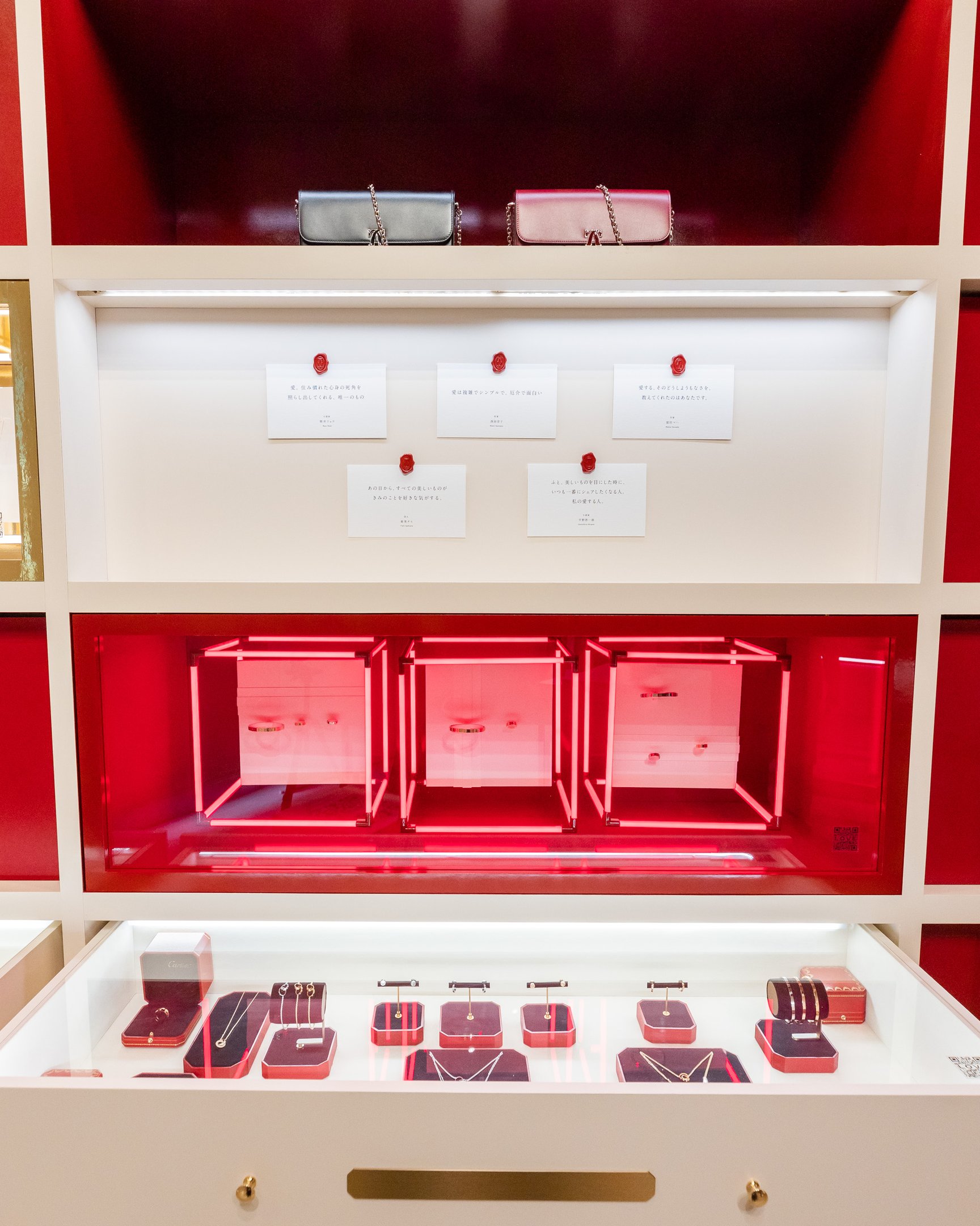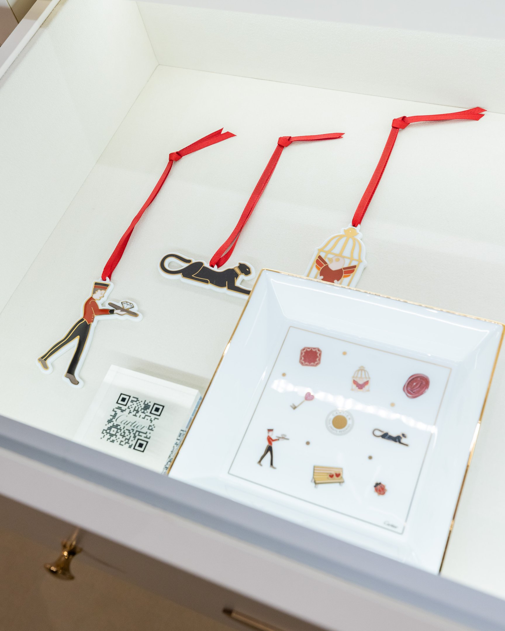 ポップアップスペースの中は、カルティエが展開する「トリニティ」や「LOVE」といった愛にまつわるアイコニックなジュエリーコレクションをはじめ、クリスマスツリーのオーナメントやレターセット、キャンドルといった「オブジェ コレクション」、ウォッチや新作のアイコンバッグ「ドゥーブルC ドゥ カルティエ」、フレグランスなどがキャビネットのディスプレイにラインナップします。アイテムは実際に手に取ることができ、QRコードを読み込めばオンラインブティックで購入することも可能です。