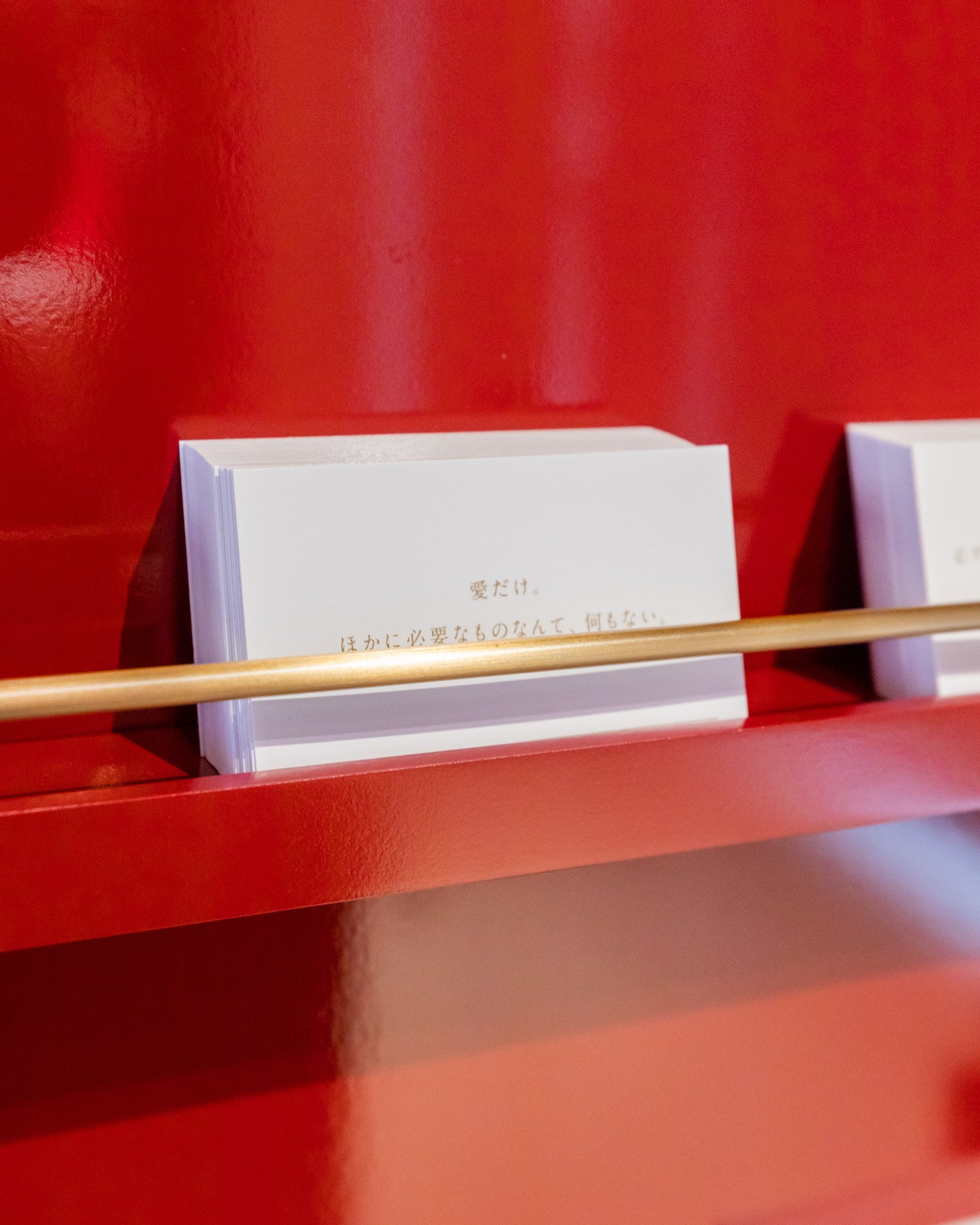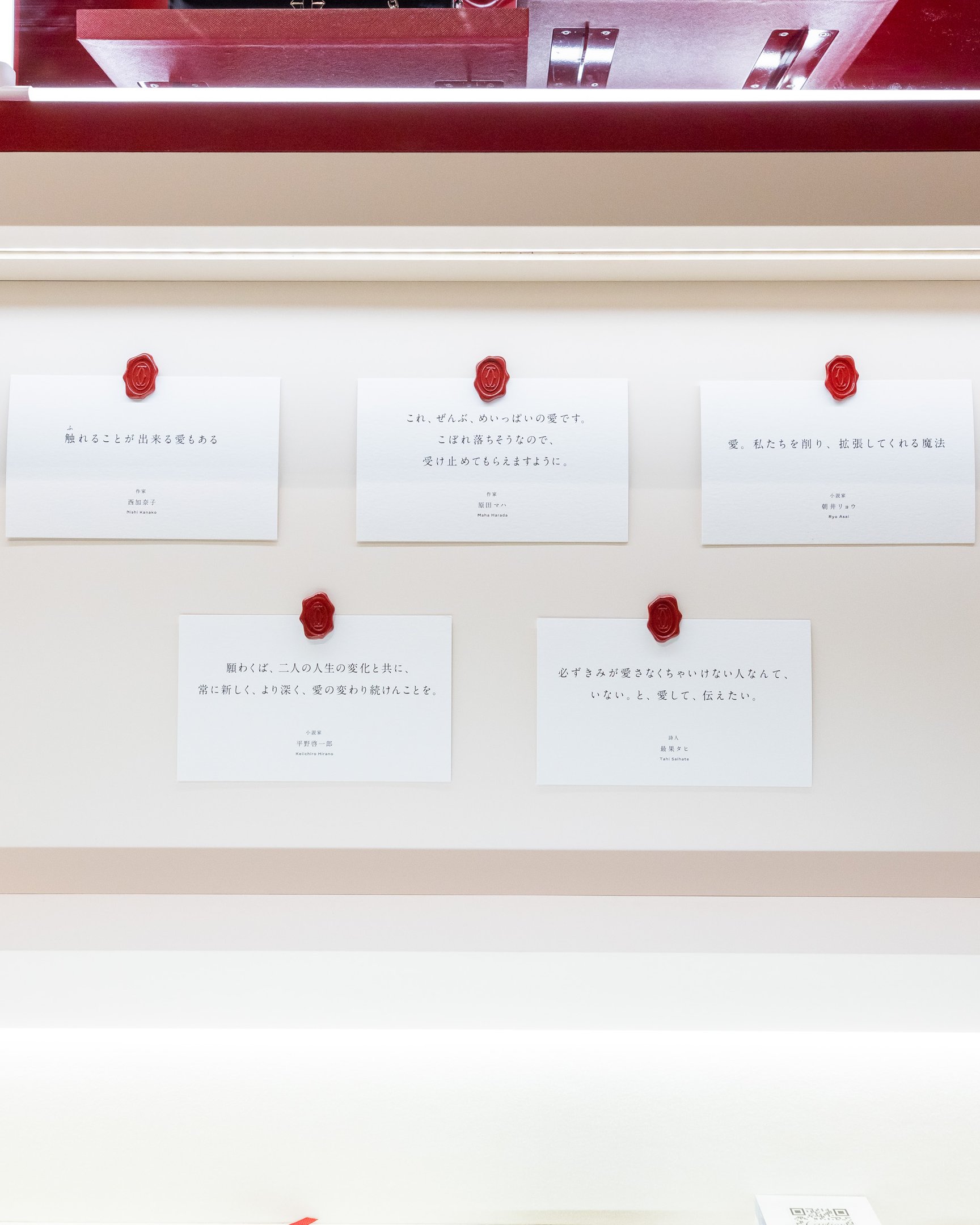 目を引くのは、ボードに貼られた15のフレーズ。これらは、朝井リョウ、最果タヒ、西加奈子、原田マハ、平野啓一郎の人気作家5人が、愛にまつわることばを綴ったもの。中には口に出してはなかなか言えないようなロマンチックな愛の表現や、「ハッ!」とさせられるようなフレーズ、心に響く"愛の格言"もあり、一言一言に読み入ってしまいます。