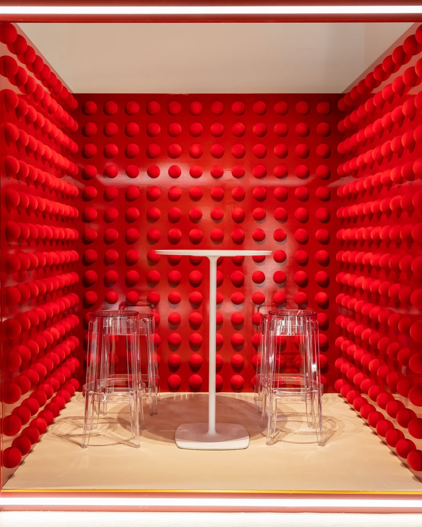 カルティエのアイコニックな白×赤のギフトボックスが囲うツリーに設置されているのはカラオケボックス風のブース。中ではスペシャルムービーが流れ、フォトスポットとしても楽しめる仕様に。ポップアップスペースでも用いられている真っ赤な球体モチーフは、クリスマスオーナメントとしてツリーを彩ります。