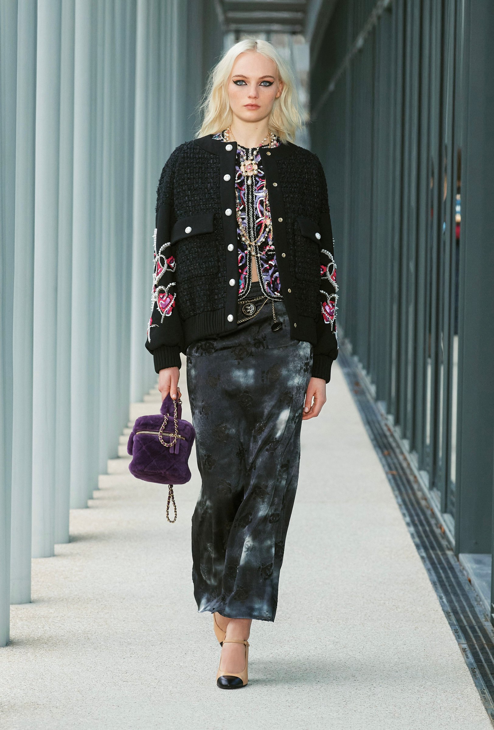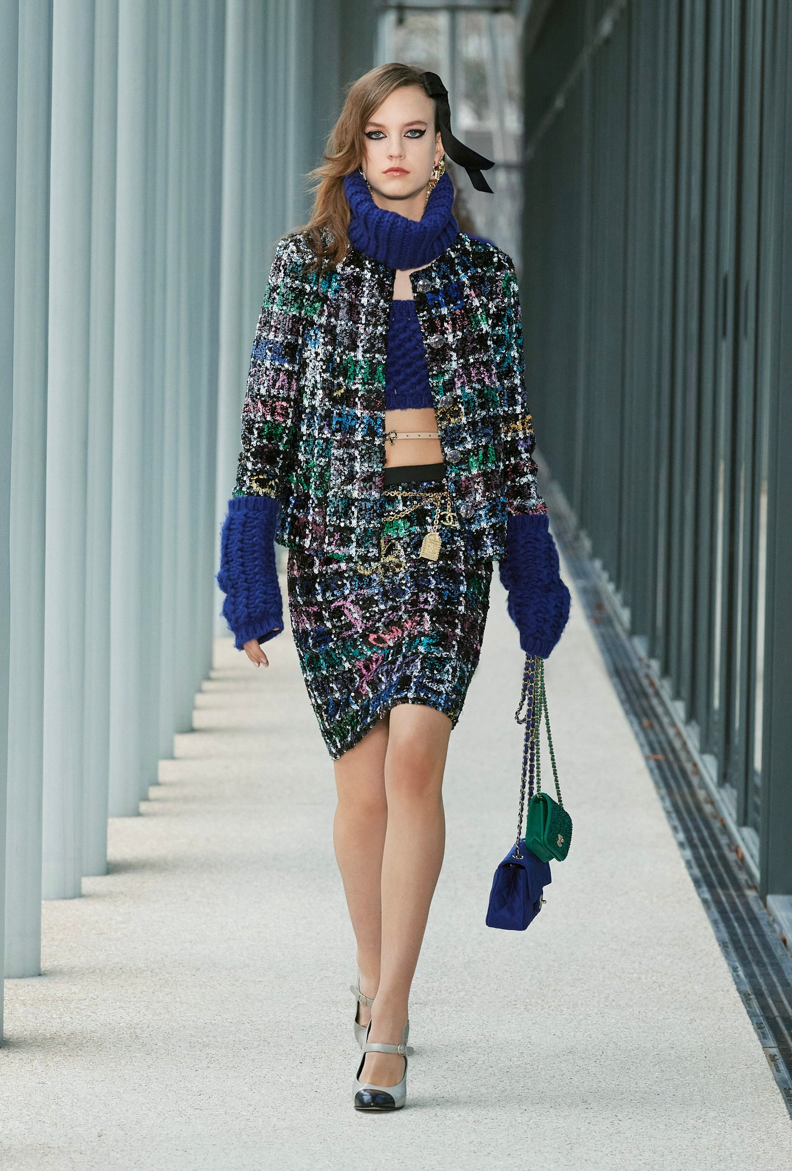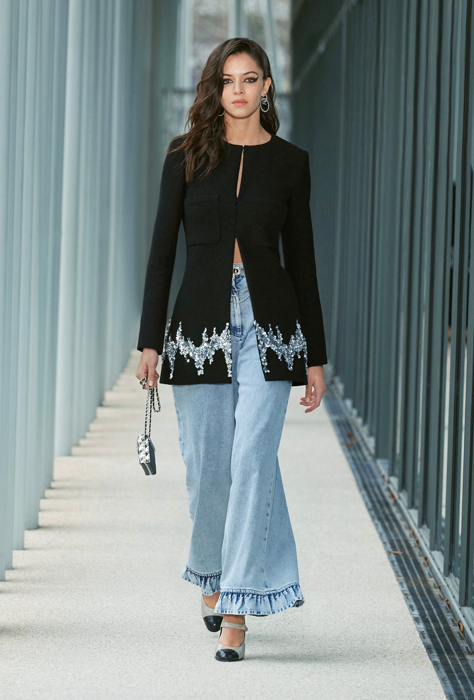 アーティスティック ディレクターのヴィルジニー?ヴィアール(Virginie Viard)が手掛ける今回のメティエダールコレクションは、都会的で洗練されたスタイルの随所に、職人たちが技巧を凝らした装飾が施されている。ファーストルックをはじめとするシルバーのスパンコール刺繍はアトリエ モンテックスが手掛けたもので、le19Mの白い系を張り巡らせたような外観からインスピレーションを得ているという。