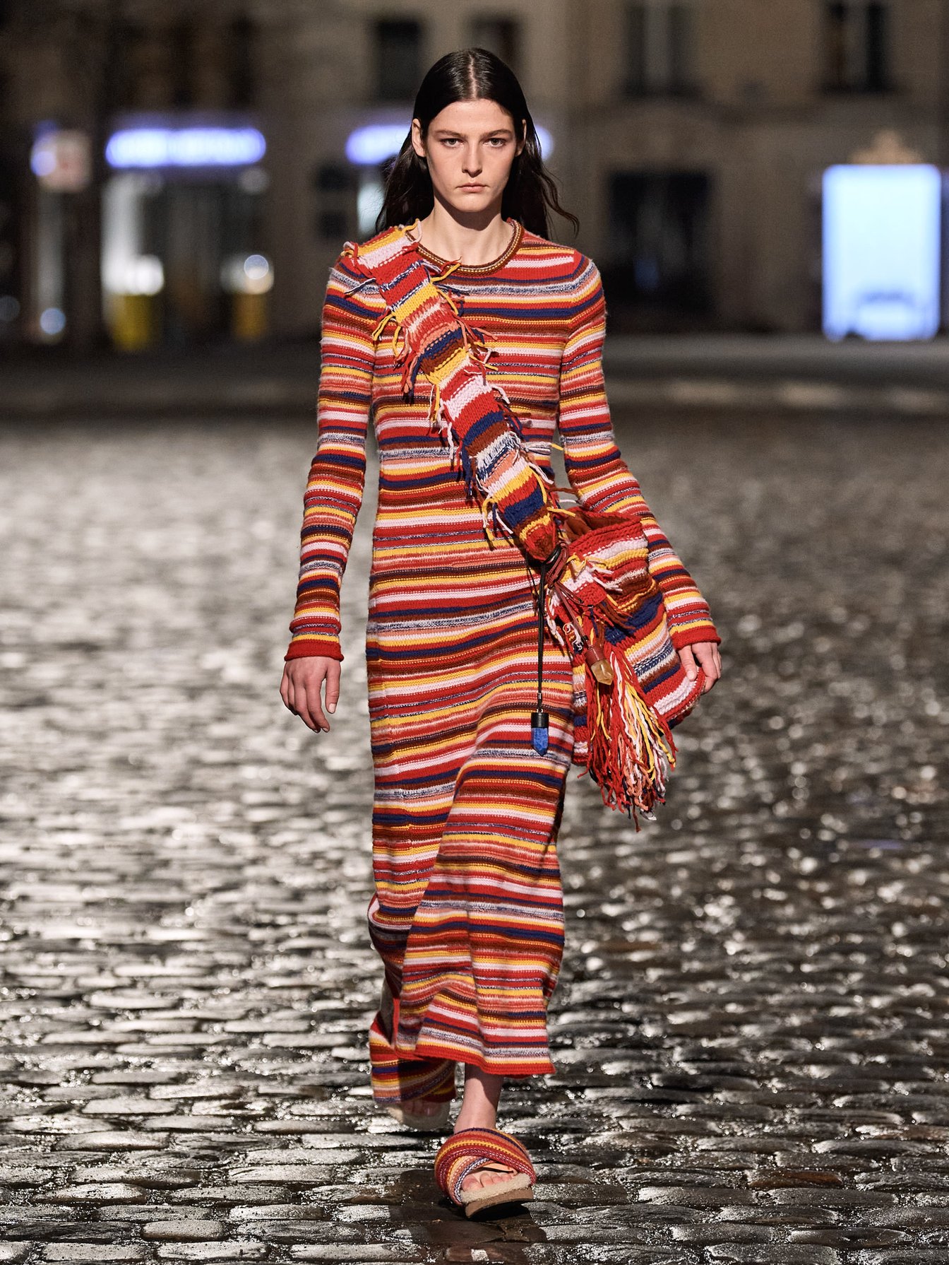 ギャビーが1960年のコレクションで披露したコットンピケのドレスにあしらわれたスカラップのディテールは、ジョーゼットブラウスのトップステッチやレザードレスにあしらわれた。ニットウェアは、ウルトラソフトなリサイクルカシミヤを使用し、ガブリエラのルーツであるウルグアイを感じさせるマルチカラーのストライプが特徴。フリンジやストライプをあしらったドレス、ポンチョの襟元にパファージャケットのパーツを組み合わせた「パフチョ」は、コンフォータブルと都会的なスピリットが共存する、ガブリエラ?ハーストらしいクリエイションだ。