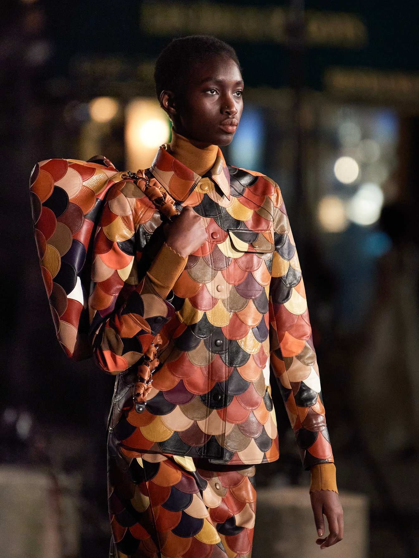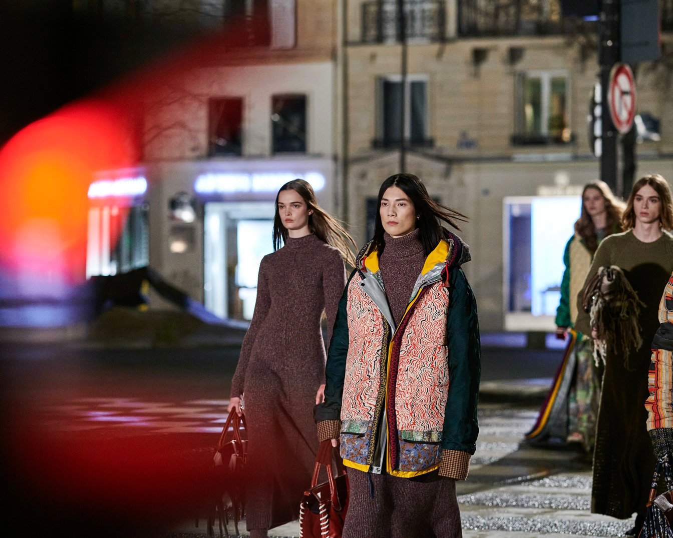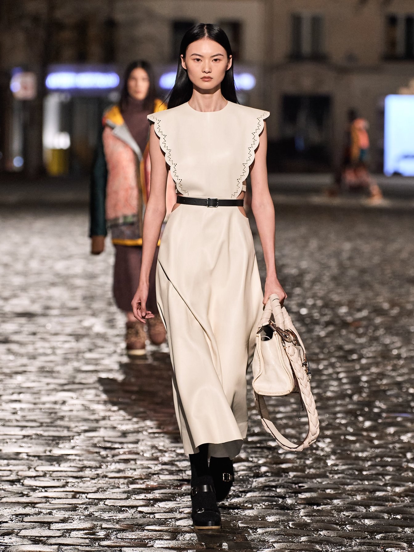 デビューコレクションのショー会場となったのは、パリ左岸 サン=ジェルマン=デ=プレ地区の屋外。ギャビーが初期のコレクションを同地区のカフェ?ド?フロールやブラッスリー?リップで発表していた、クロエ縁の地だ。パリの夜間外出禁止令により観光地から静寂なランウェイへと変貌した石畳に登場したのは、創業者 ギャビーのレガシーと、ガブリエラのバックグラウンドが融合したスタイル。