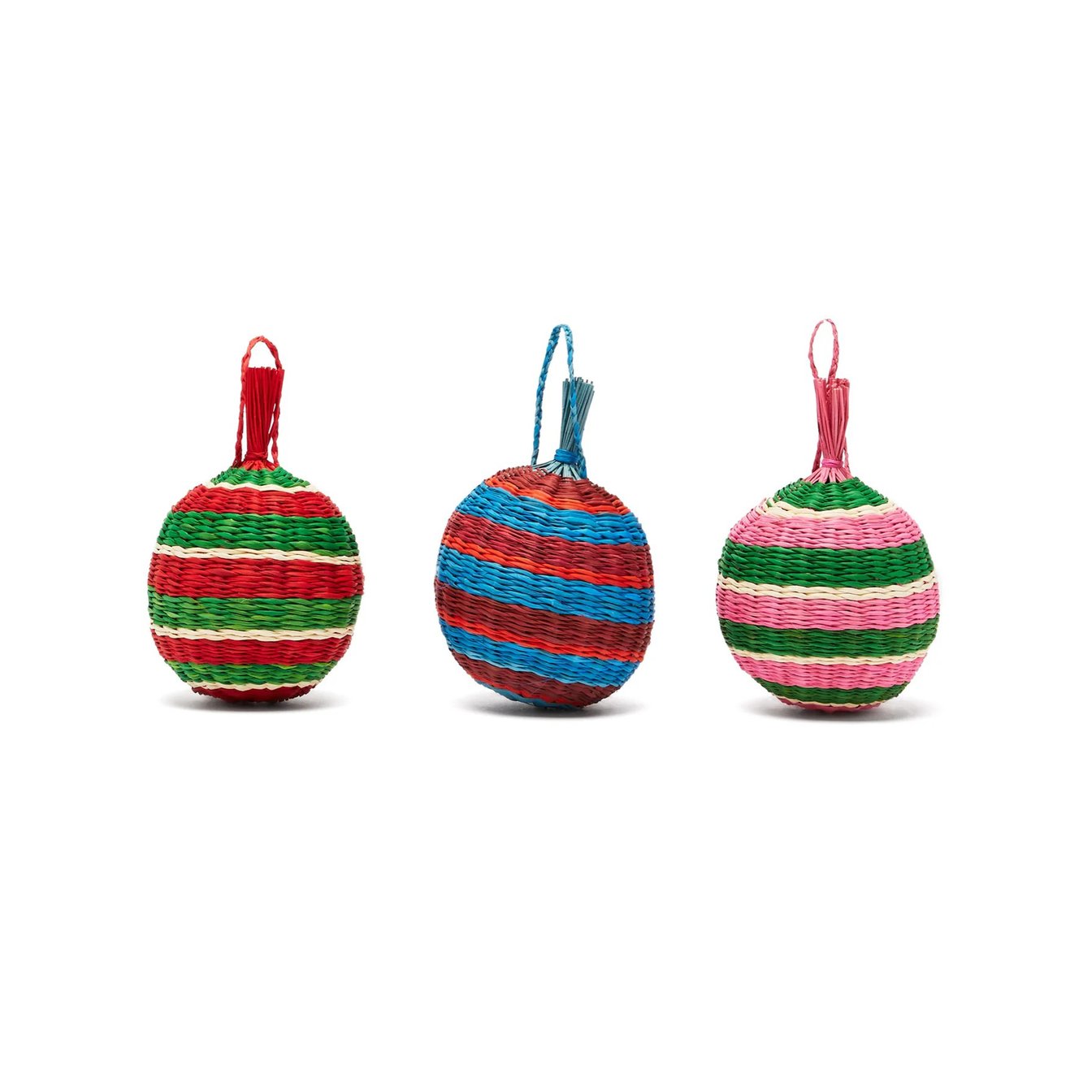 ミラノ発、気分が上がるようなプレイフルなカラー&パターンのアイテムが揃う「ラ ダブルジェイ(La DoubleJ )」のオーナメントセットは、こんなにも鮮やか。ひとつずつハンドメイドで仕上げられたストロー製のオーナメントには音を奏でるベルがあしらわれています。