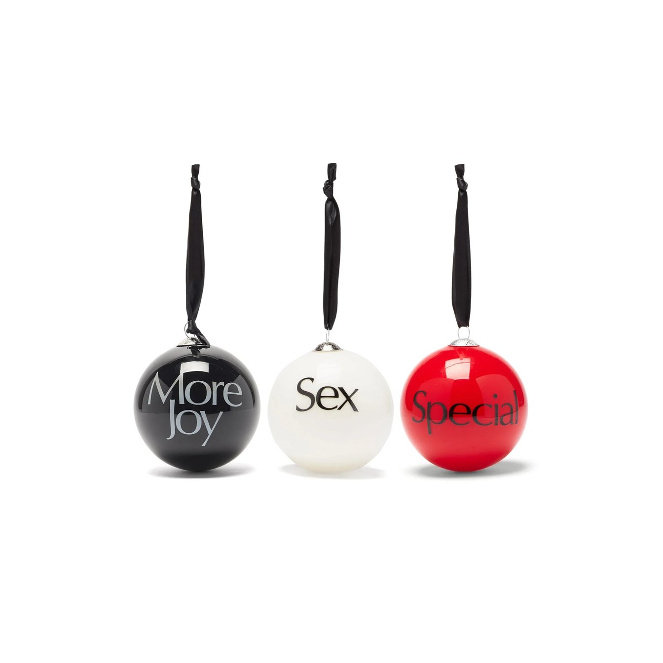 「クリストファー ケイン(Christopher Kane)」のディフュージョンライン、「モア ジョイ(More Joy)」のオーナメントボールには、大胆なスローガンが並びます。1972年に出版されたアレックス?カンフォート(Alex Comfort)の著書「ジョイ?オブ?セックス(The Joy of Sex)」からインスピレーションを受けたポジティブマインドをクリスマスデコレーションにも。
