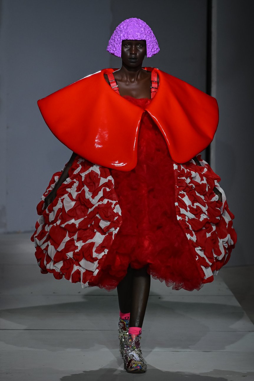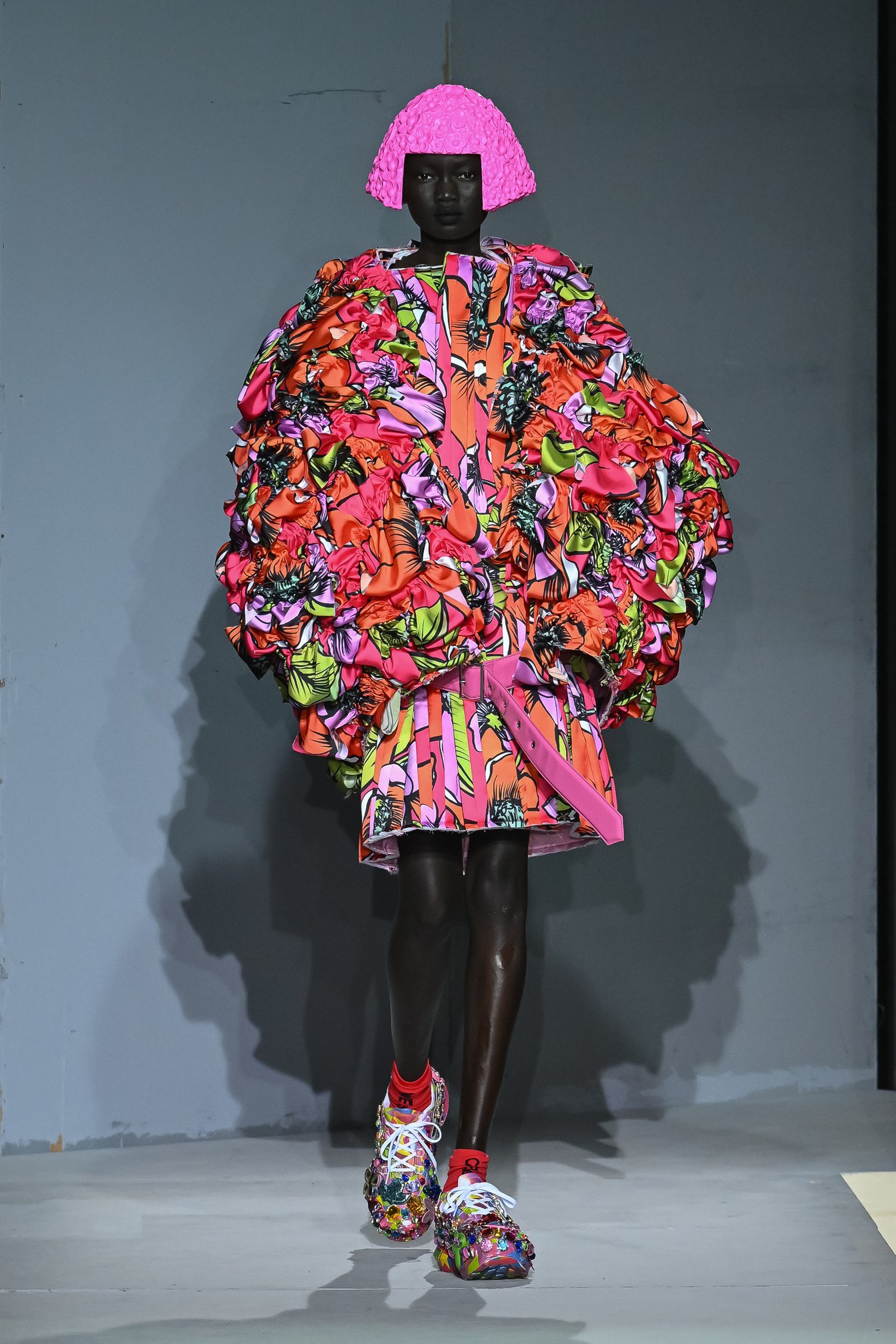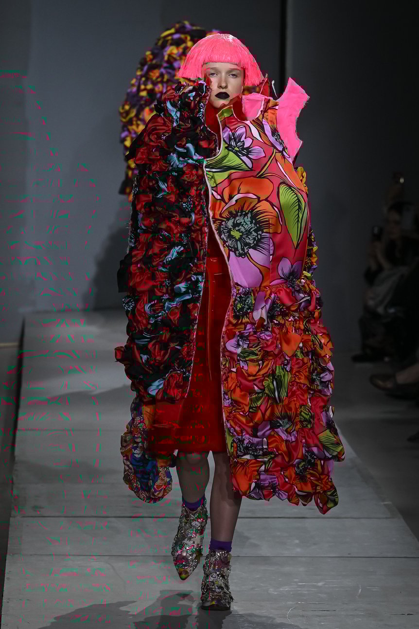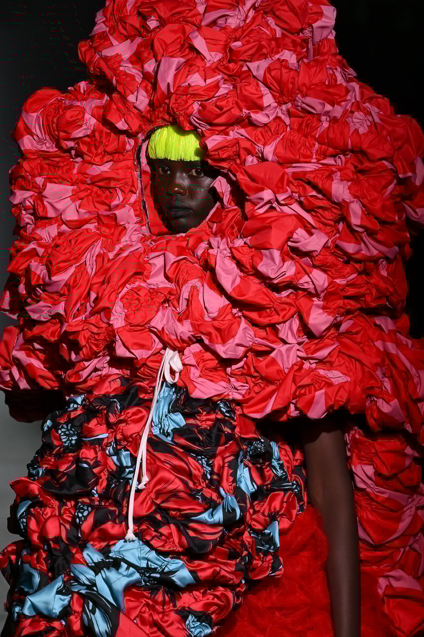 ファーストルックは、テキスタイルを細かく切り刻み、シャーリングを寄せたりプリーツ状に折って縫い合わせ、丸みのあるフォルムに仕立てられたドレス。よく見ると花柄のプリントだということは認識できるが、モチーフの全貌はわからない。
