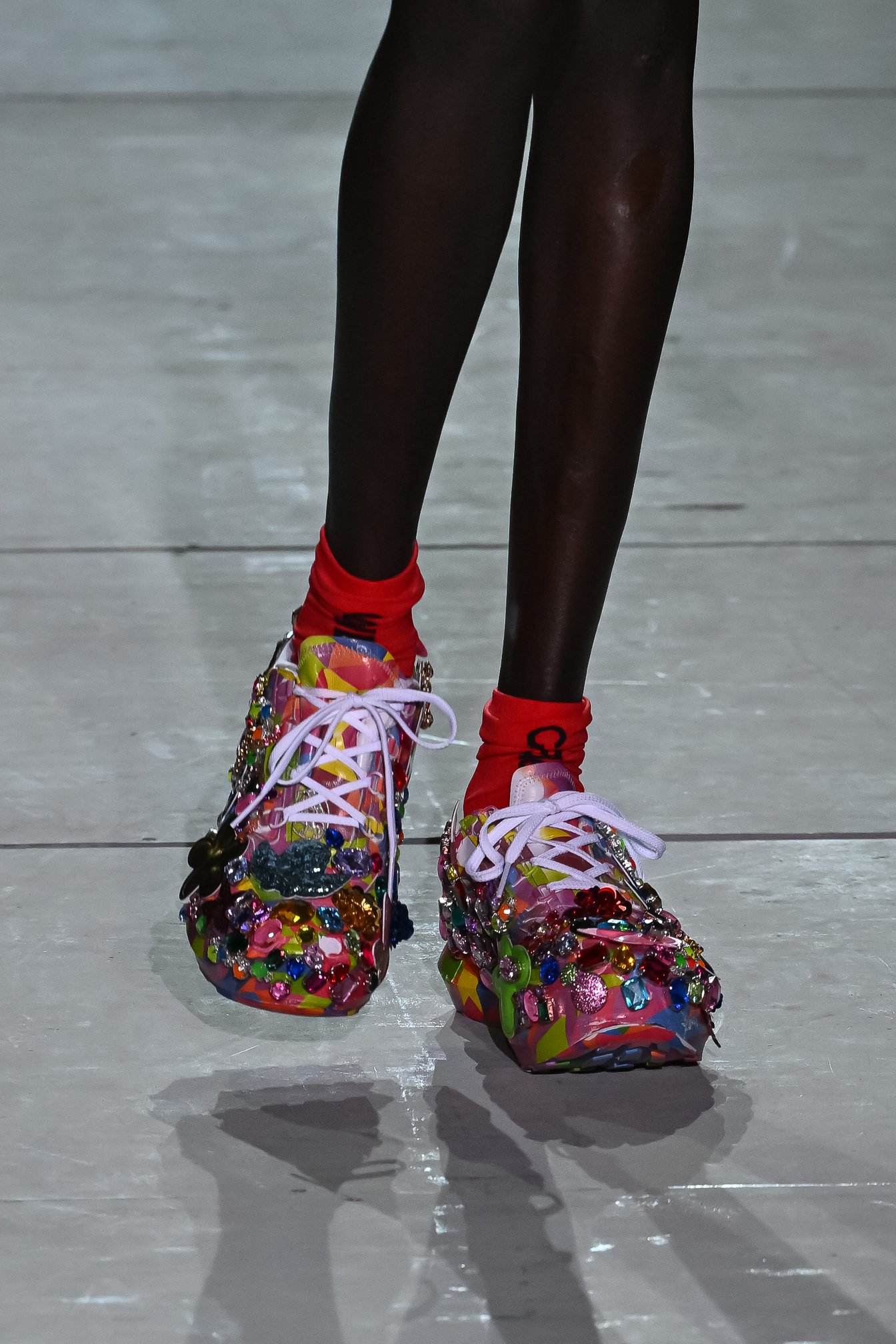 モチーフをクラッシュさせるアプローチは、足元にも見られた。これまでも継続して協業してきた「サロモン(Salomon)」のスニーカーは、マルチカラーに彩られ、さらにランダムなビジューが全体を覆っているデザイン。2023年春夏コレクションで登場したSR811がベースとなっている。